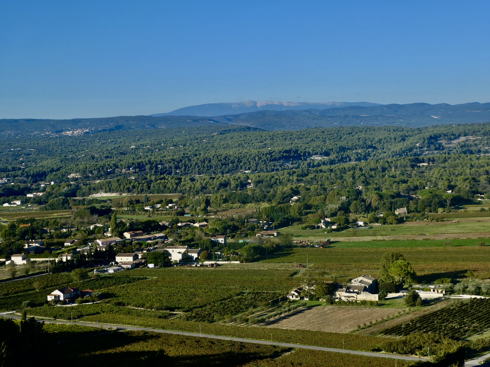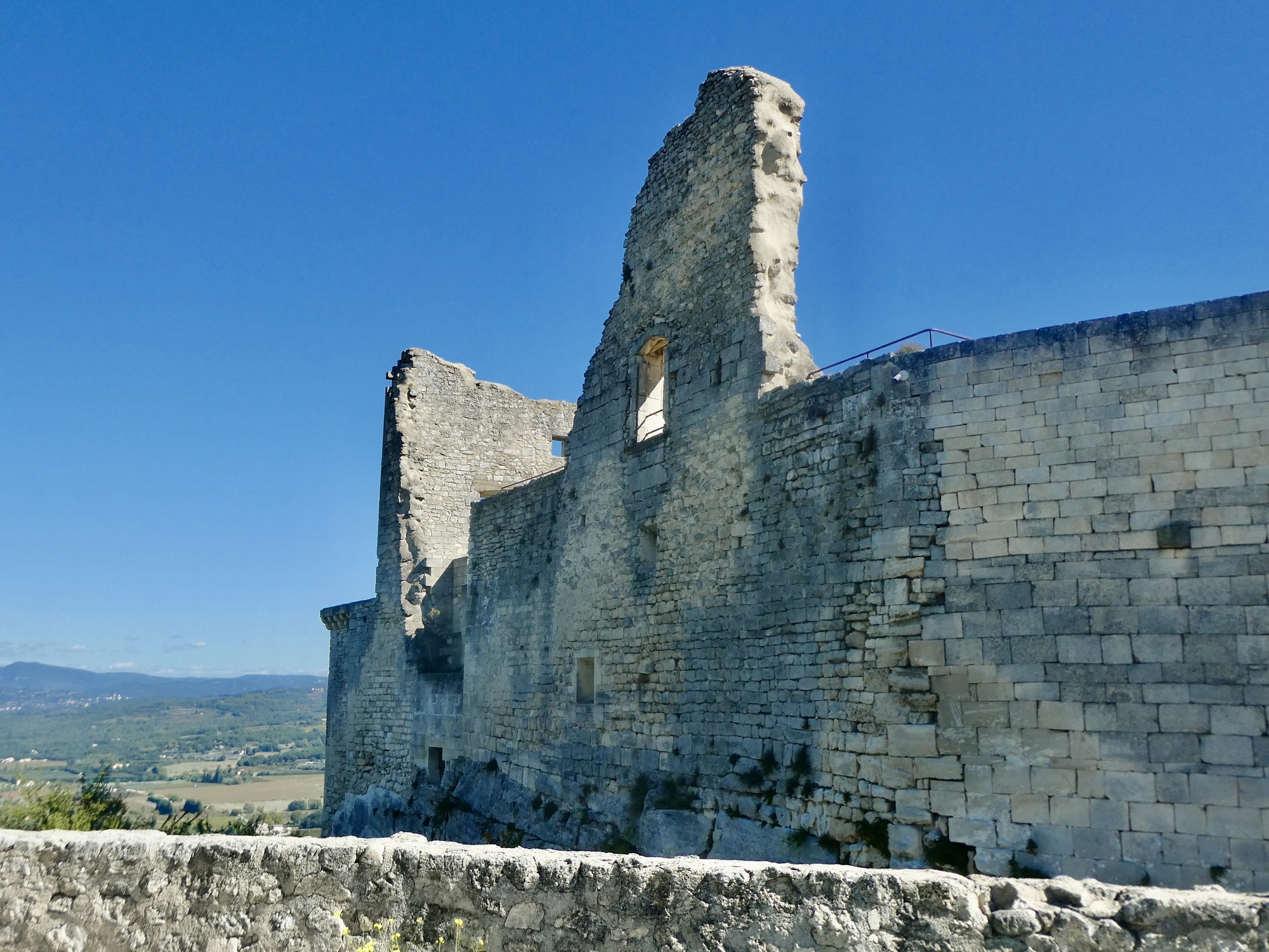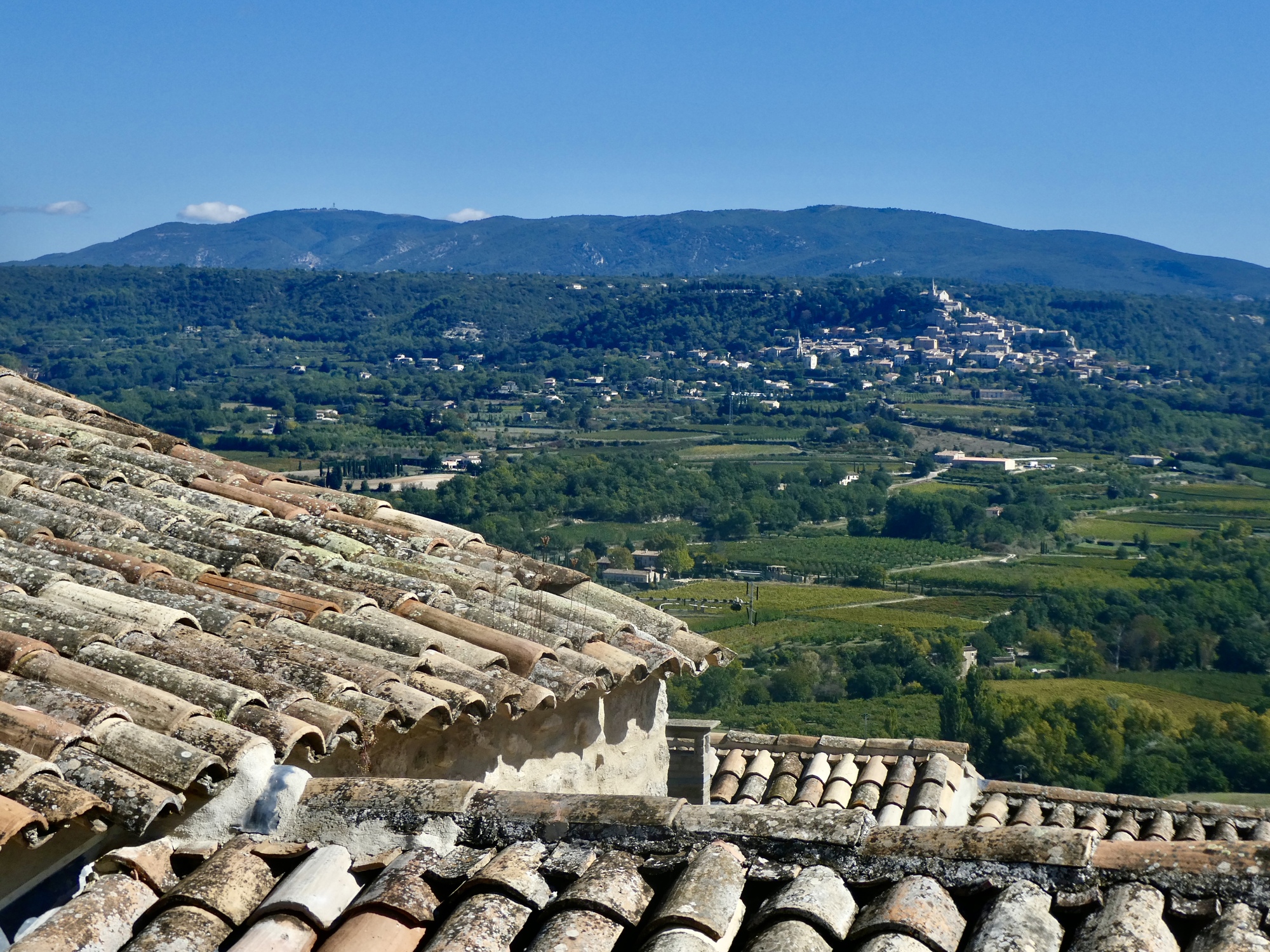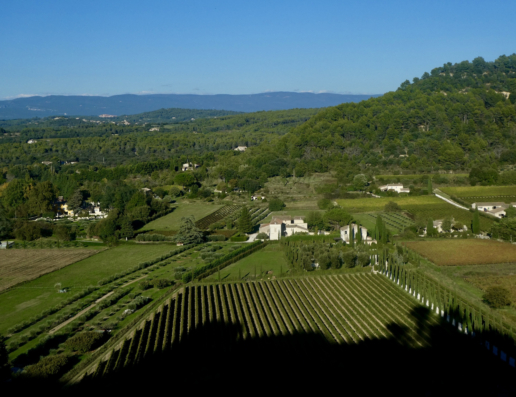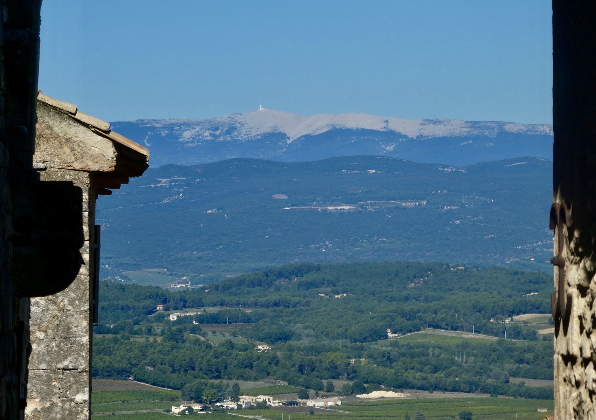 But the views! Lacoste sits in an impressive spot. Looking back down the street we’ve pushed up we get a nicely framed view of Mont Ventoux. And off to the east we get a good look at Bonnieux; and from the spur we walk up to the top to the grassy apron below De Sade’s ruined castle we get more fine views across the Calavon and to the villages to the north.