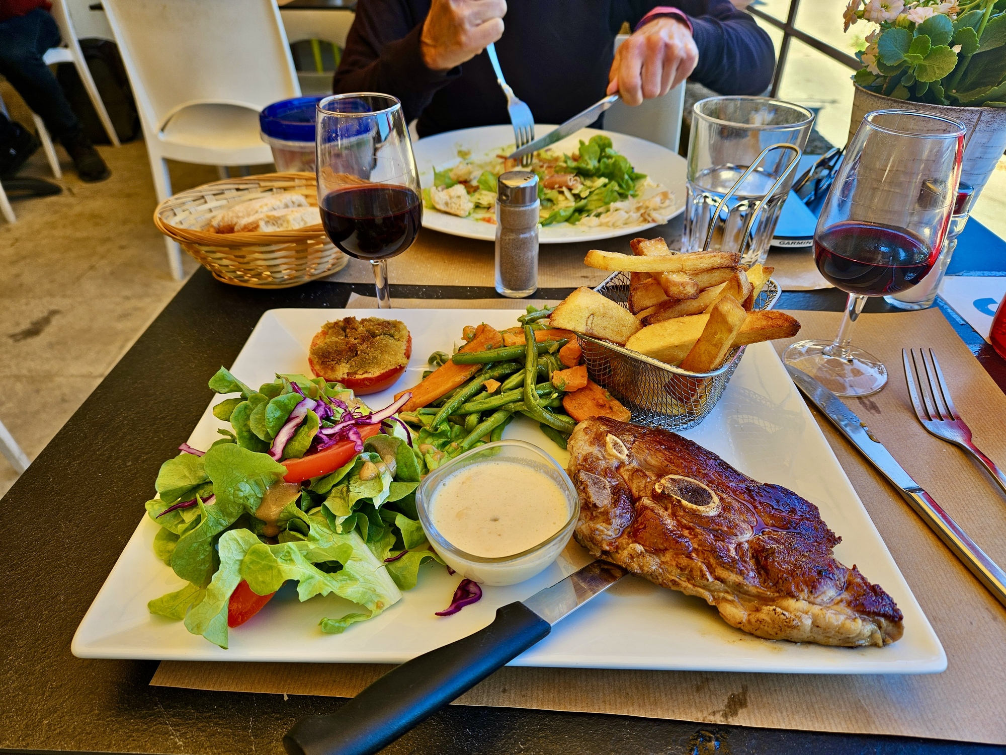 While we wait for our meal to arrive we enjoy taking in the scene around us. At one edge of the patio sits a stocky man in a wide brimmed beret, taking an occasional puff on his cigarette and chatting with a few friends. Shortly a tall, charismatic man and his young son walk in, the energetic boy alternately skipping, holding his dad’s hand or affectionately hugging his leg.