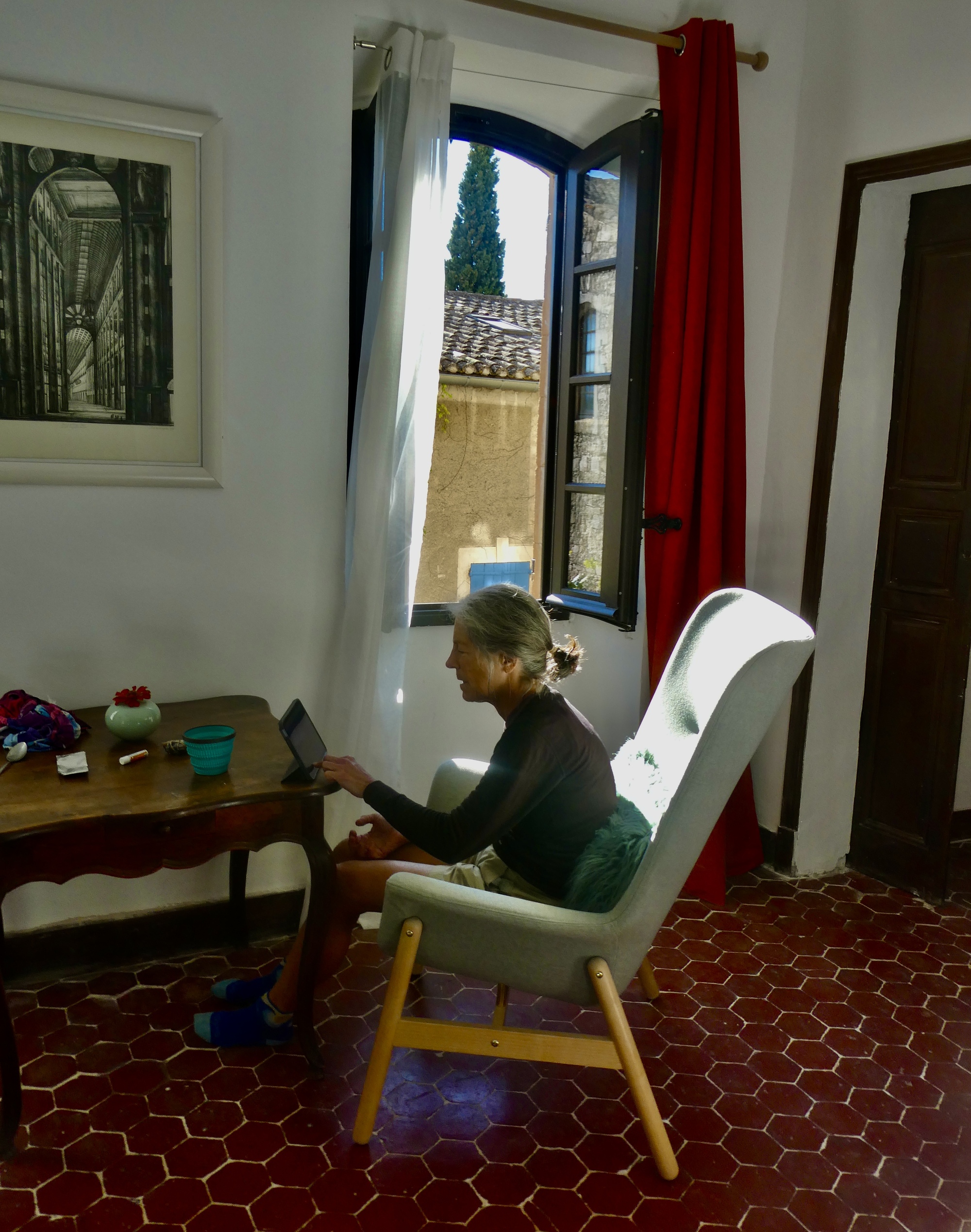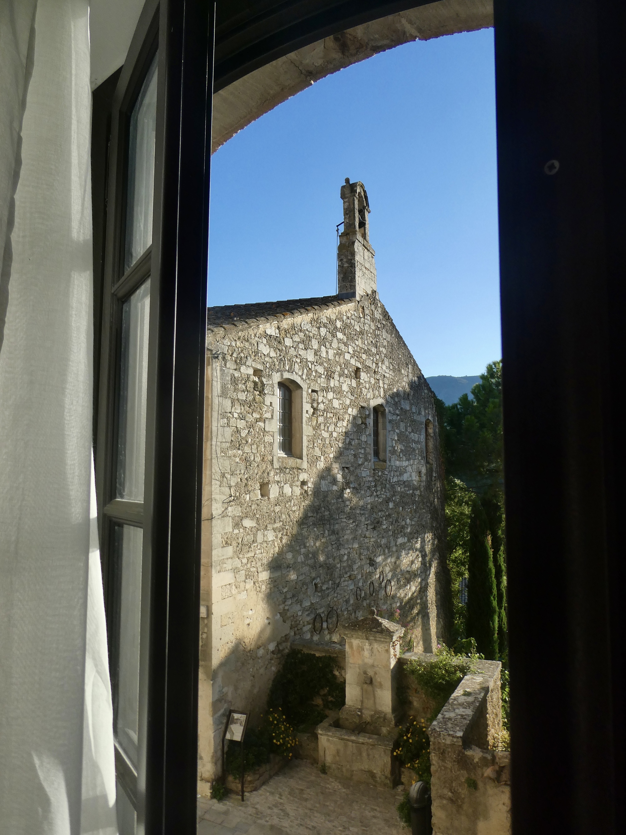 Our apartment is quite stylish, the walls lined with artwork and shelves crammed with books in both French and English. I’m pretty sure at least some of the paintings are originals by one of the hosts. And we have a terrific view, looking out on the chapel on the opposite side of the lane.