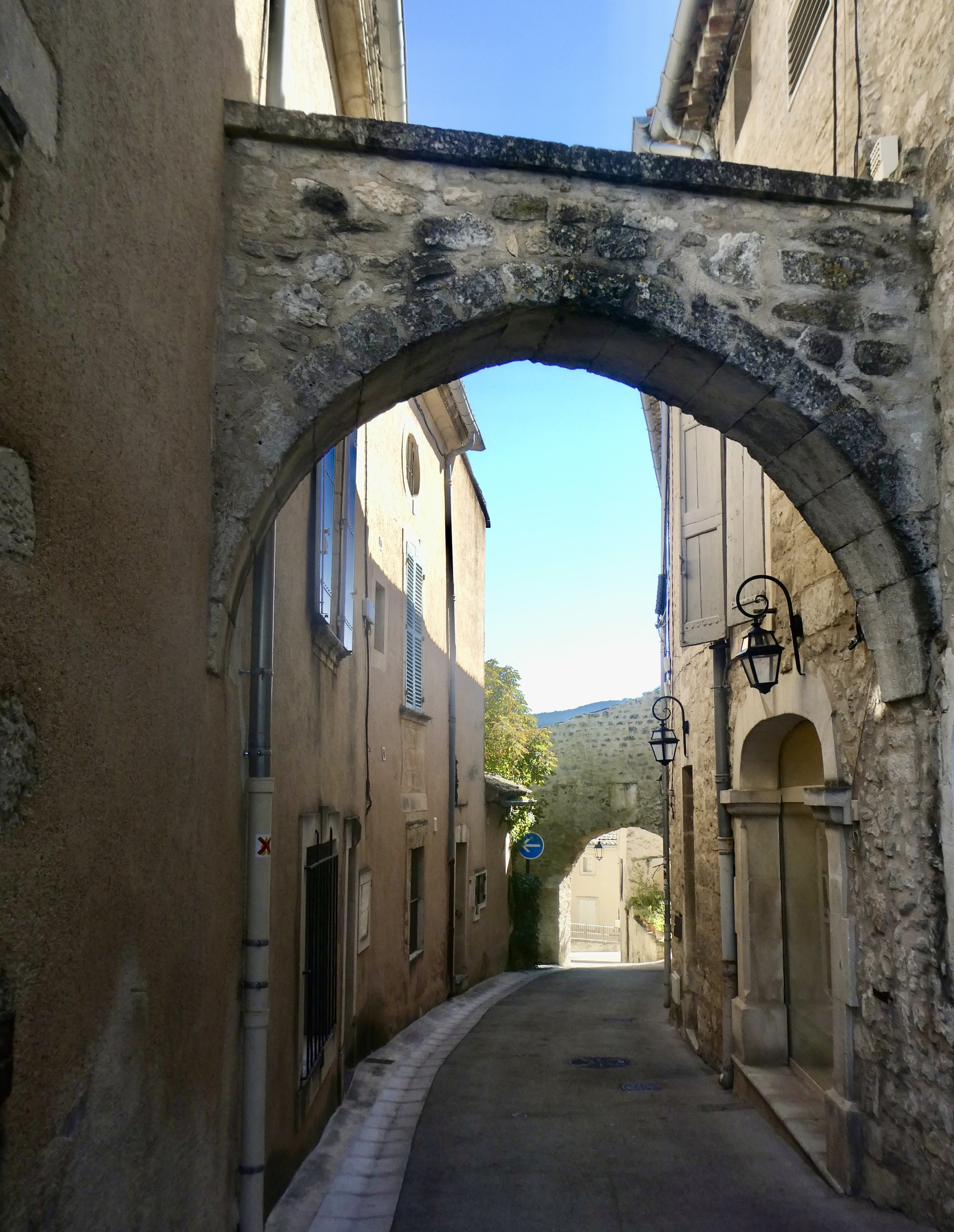 Afterwards we leave to have a look at the village on our way out of it. Our restaurant sits right at its lower entrance, at the intersection of the two streets: the low street and the high one. I optimistically start down the low road, which appeals because of the two slender arches we’ll pass through.