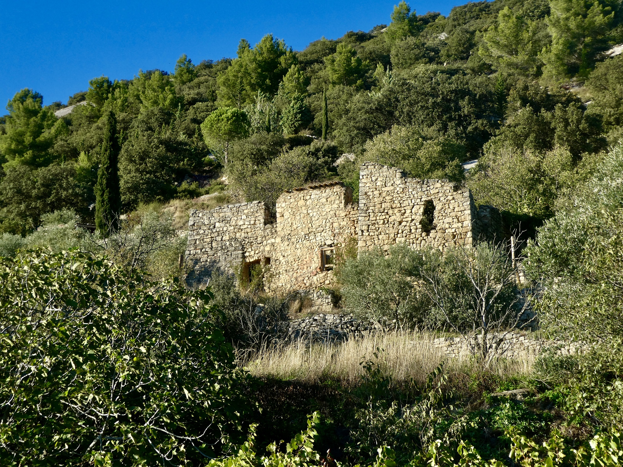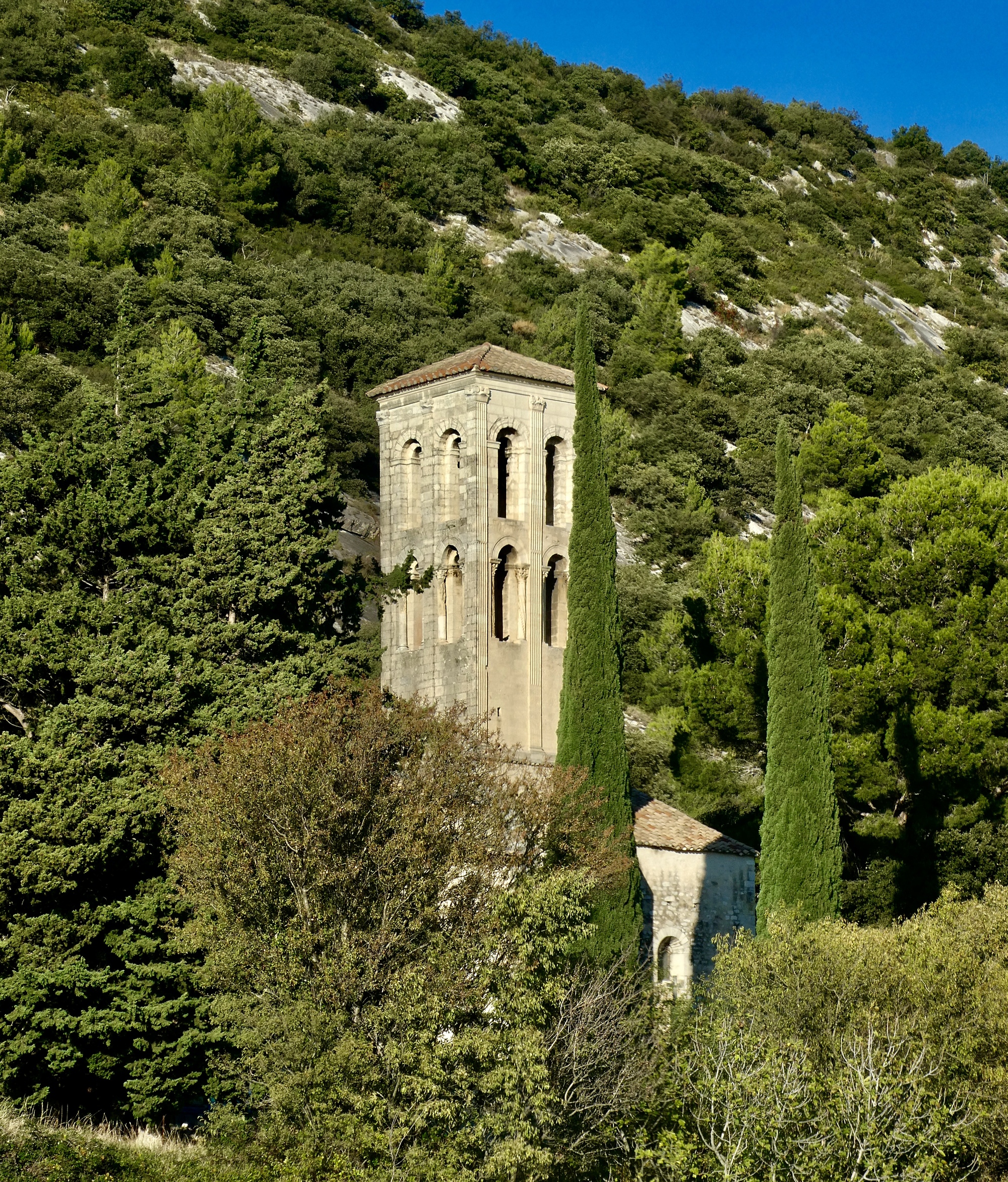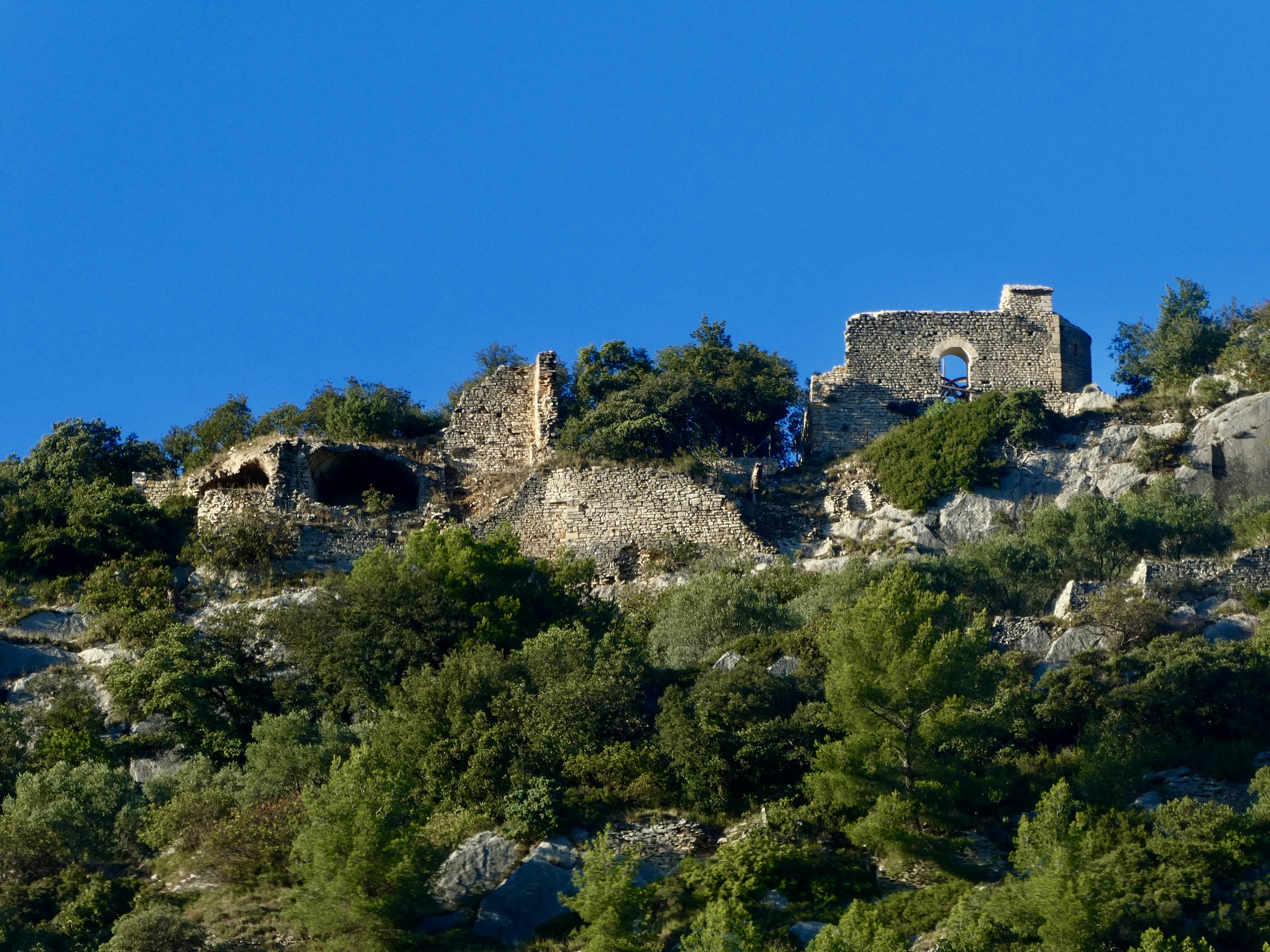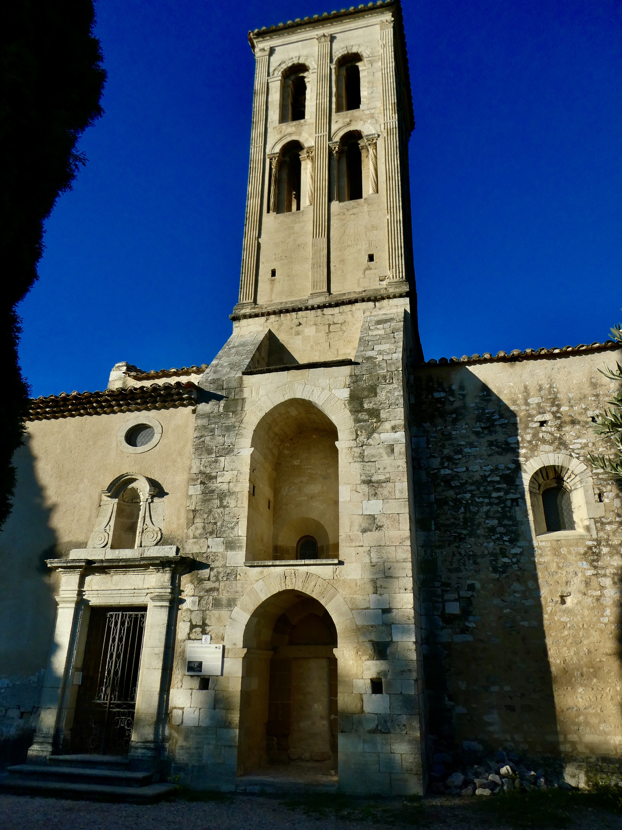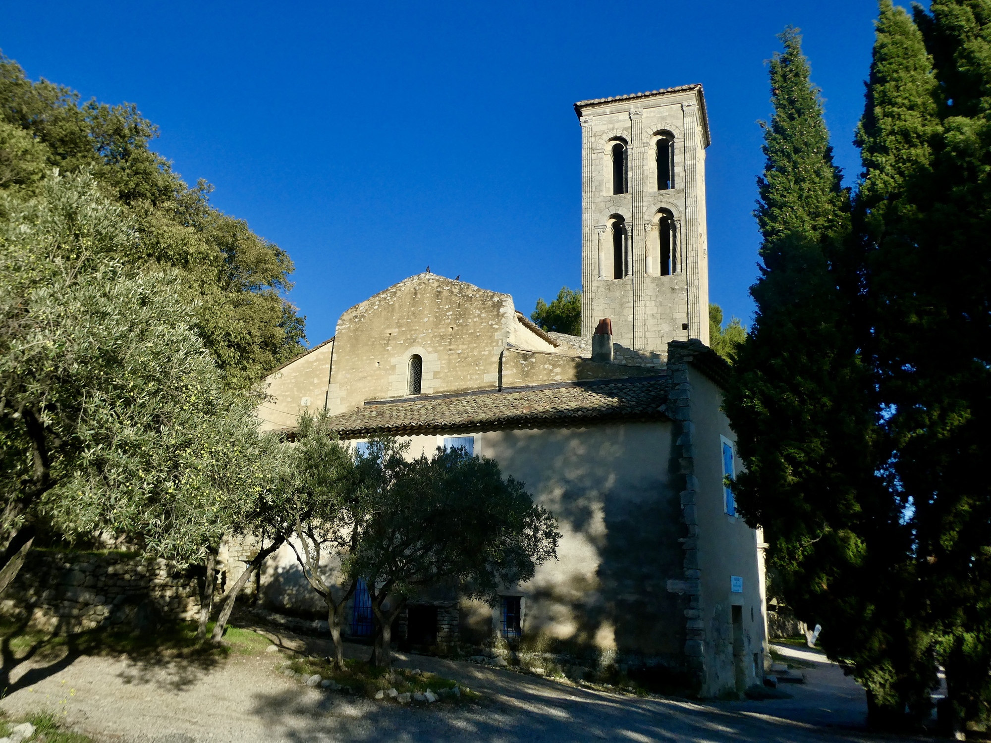 As soon as I come to the foothills and turn east toward Beaumes-de-Venise I stumble across the one real surprise of the day: Notre-Dame d’Autune chapel, a feature I hadn’t noticed on the map. It’s an attractive structure, with a tall bell tower that looks Italian.