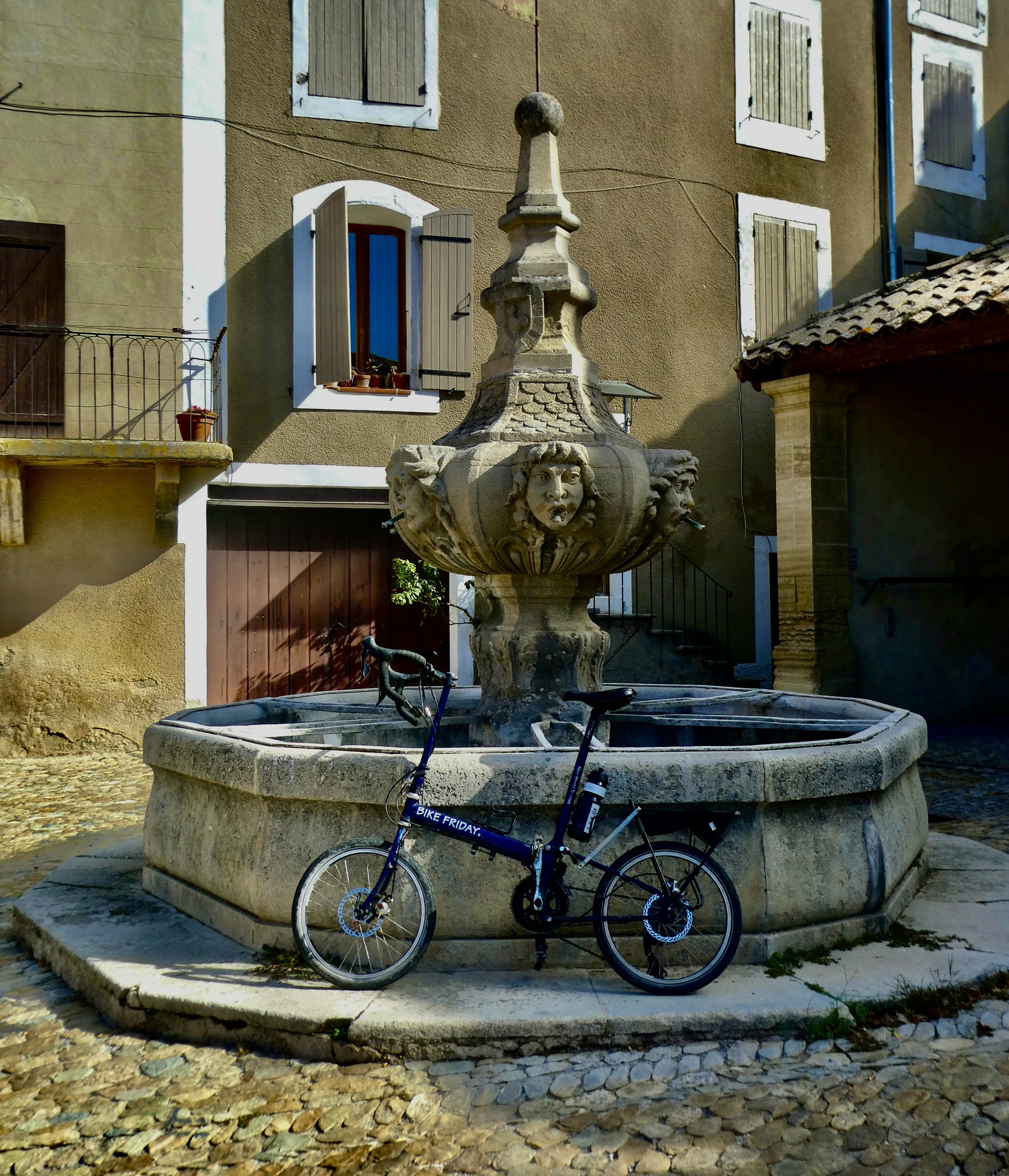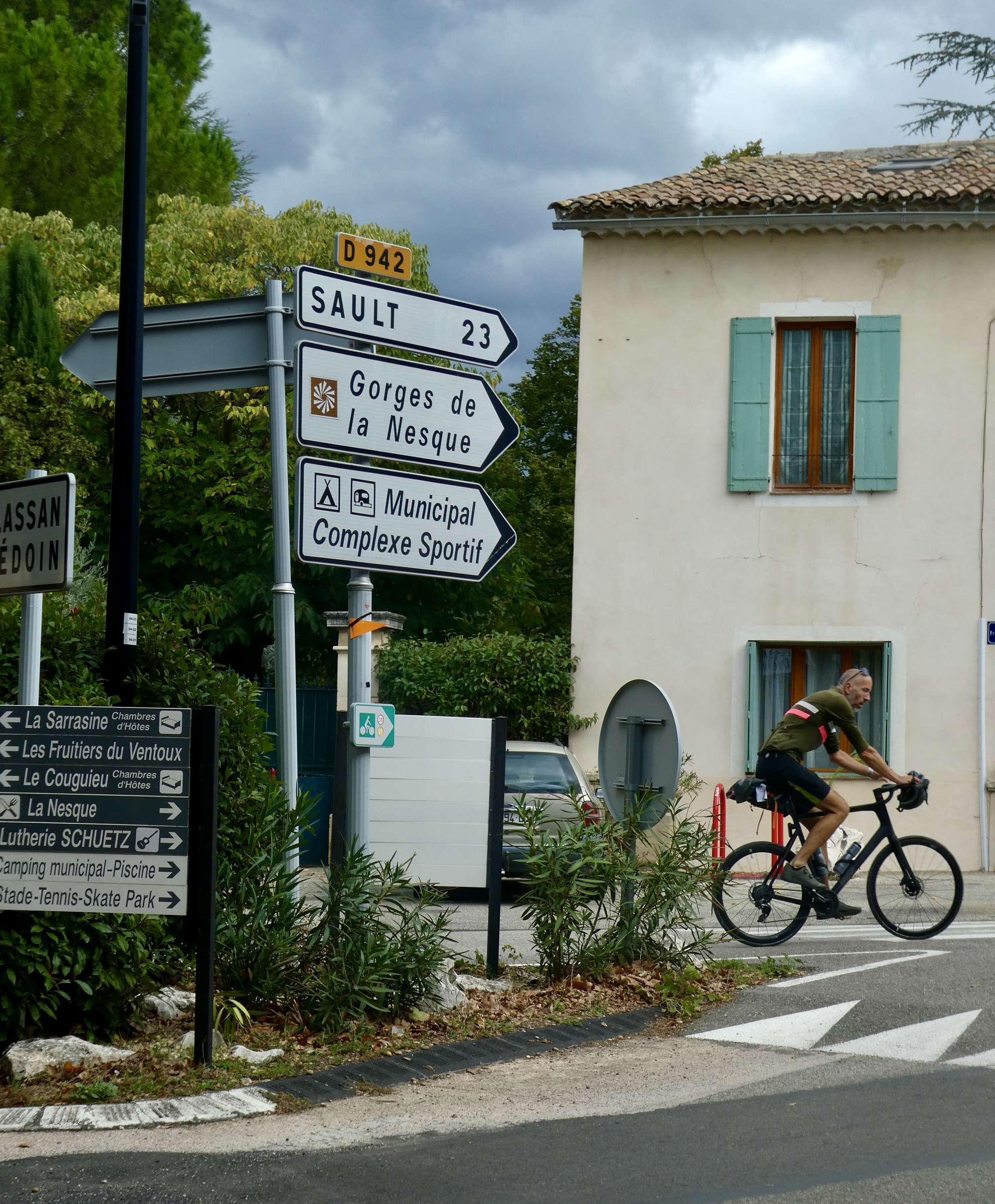 From there it’s a quick descent to Mormoiron, and a short climb into it to enjoy the impressive views from its balcony. It’s a reminder that when we first started planning our route through Provence when we bailed out on wet, chilly Normandy a month ago Monmoiron was on the plan - we might have even booked a place here, but I don’t remember now. The idea was that we’d bike from Apt to Sault and then drop down to Monmoiron through the Nesque Gorge until we concluded that it was more climbing than we were ready for.