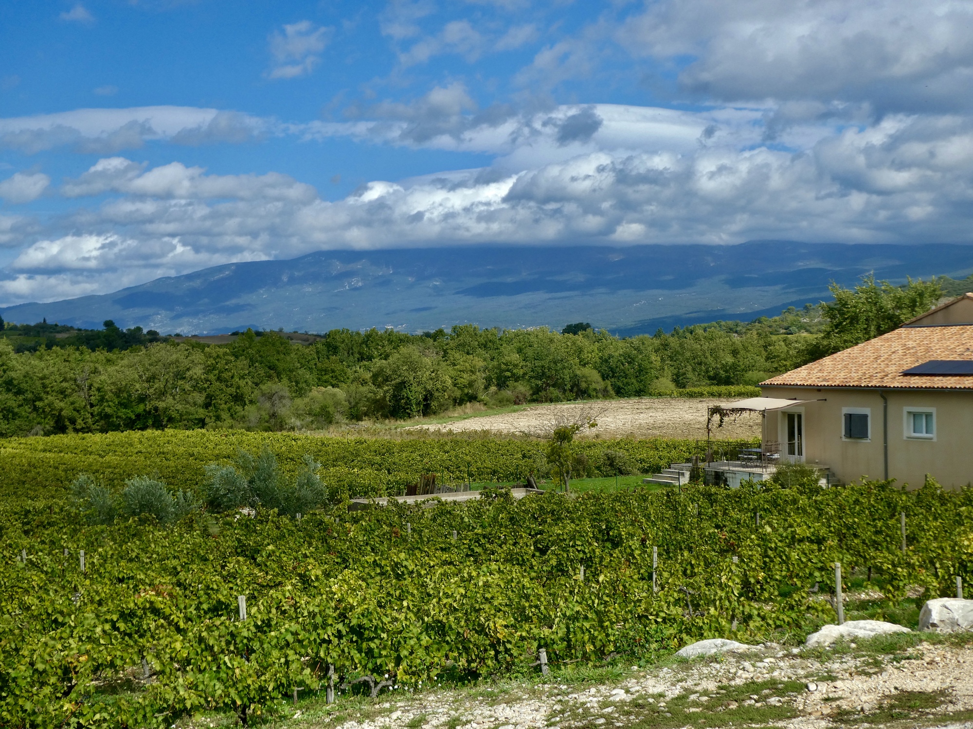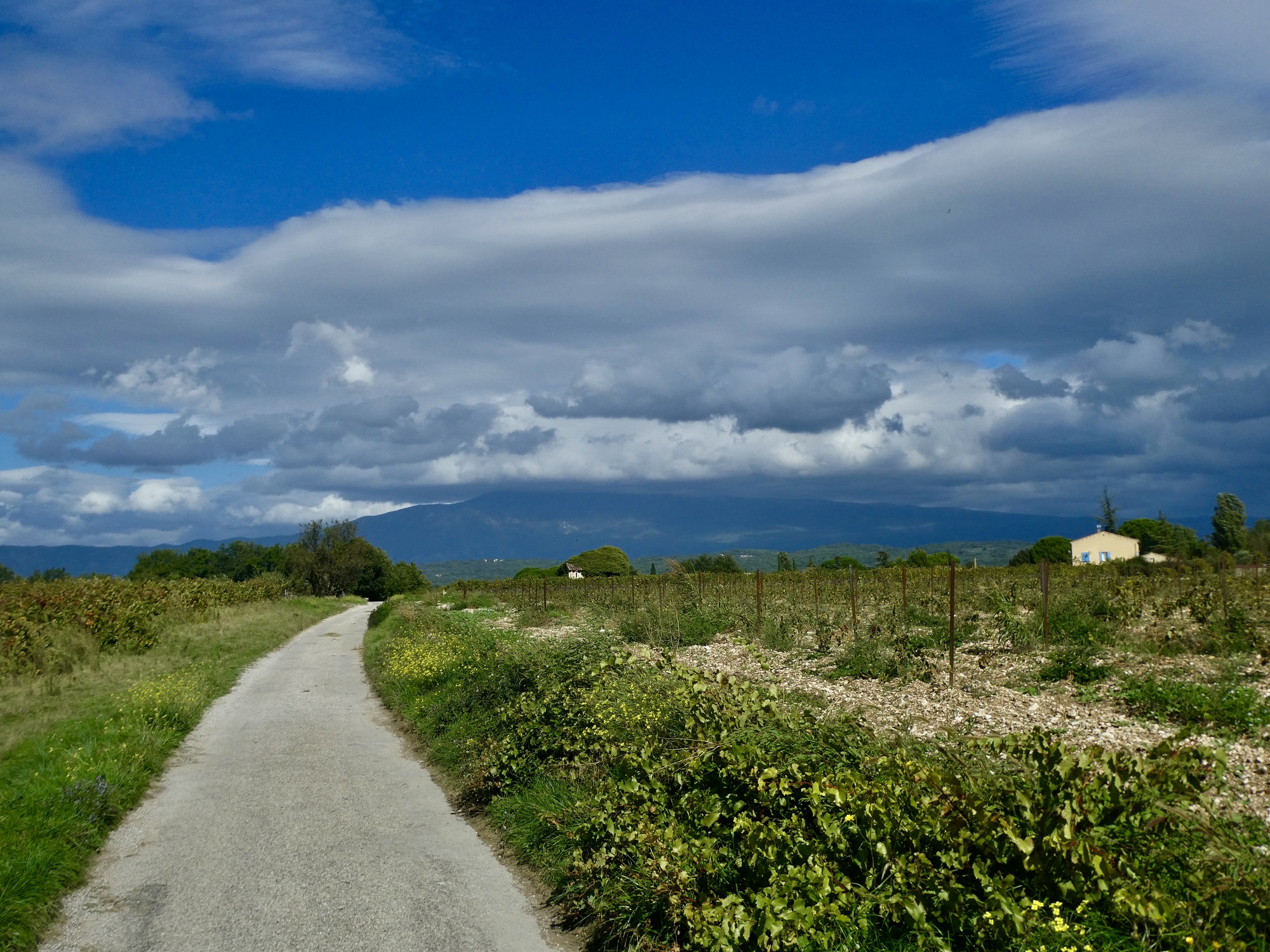 The next seven or eight miles are an outstanding ride as I gradually gain some elevation and get high enough for impressive views, I’m biking through the vineyards now, and I’d have the place totally to myself if it weren’t for the bikers that frequently pass by. This area feels like a cyclist’s paradise with its network of small empty roads, fantastic scenery, and the premier cycling trophy rides of the Nesque Gorge and Mont Ventoux in the vicinity. For most of the day I’ll share the road with many more bikers than drivers.