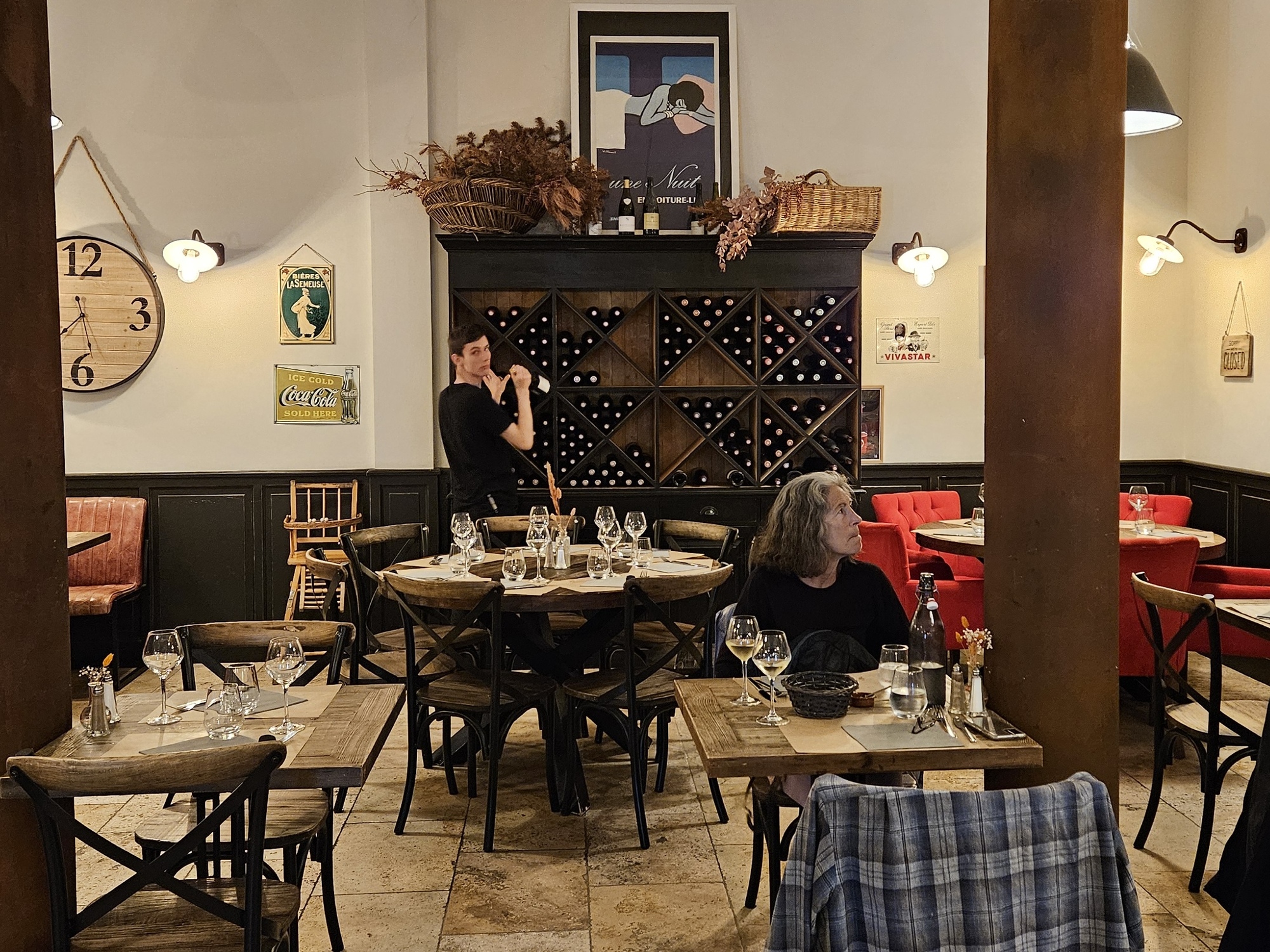 So that’s bad news, and puzzling (and later, we’ll realize we just made the reservation for the wrong day). We decide to walk back to l’Estanquet, the Occitan cafe we ate lunch at yesterday; but its windows are dark when we get there so we just keep walking and land again at the train station. And fortunately they’ve got plenty of room tonight so we don’t have to settle for the take-away pizza place we just passed. The old station a large venue and they’re out a way from the center of town so they probably don’t fill as quickly - they have a more complete menu today (there was no fish last time) including the fish of the day, sea bass, so we both order one.