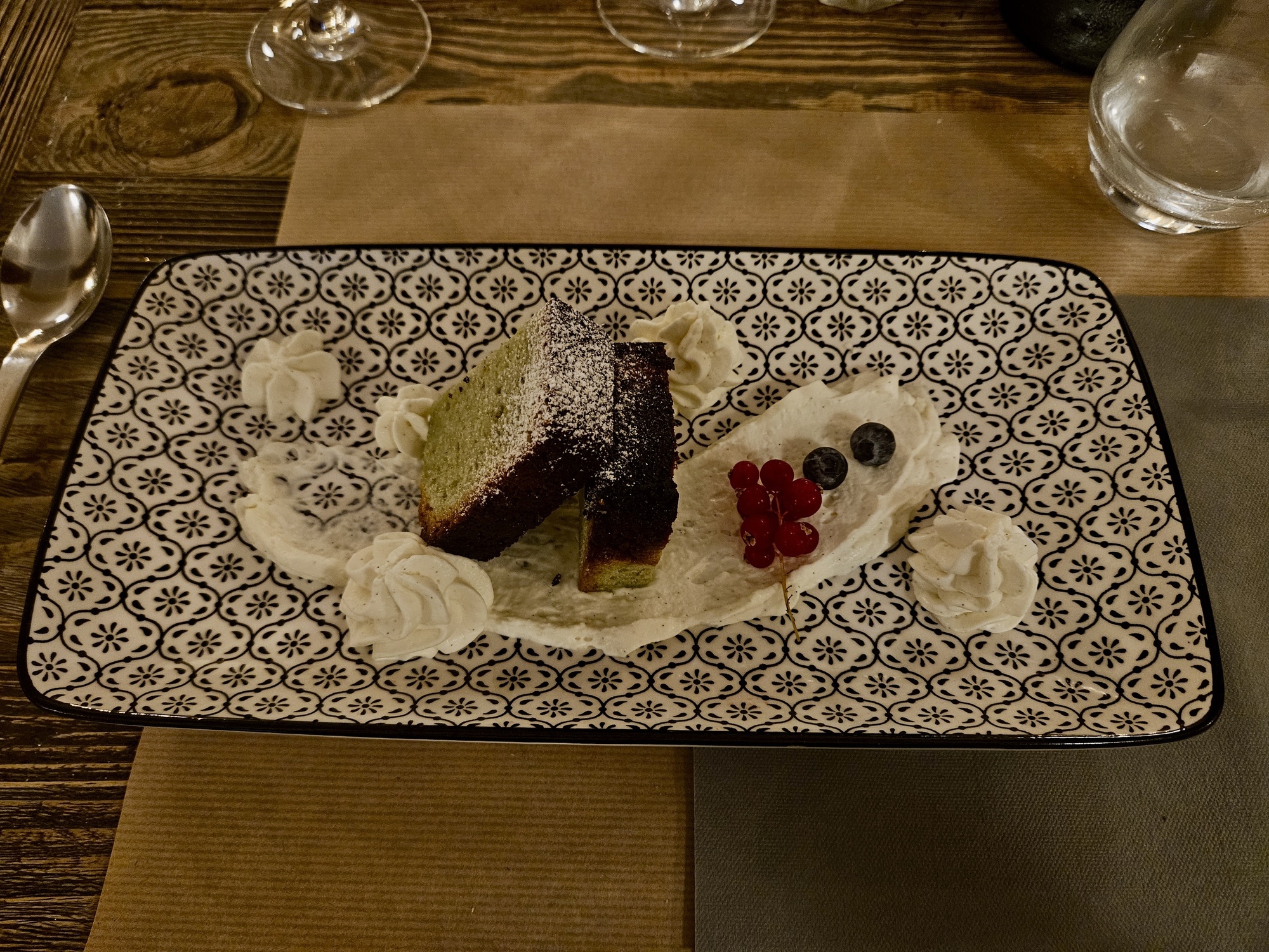 The mains are fine, but we’ve both gotten good workouts and find we can squeeze just a few more calories in and decide to split a desert. We choose one I’ve never heard of before: almond and pistachio financiers. I’ve never heard of financiers as a dessert so I look them up before ordering and it sounds interesting. They’re little cake-like blocks, with their name coming from the suggestion that they look like gold bars.