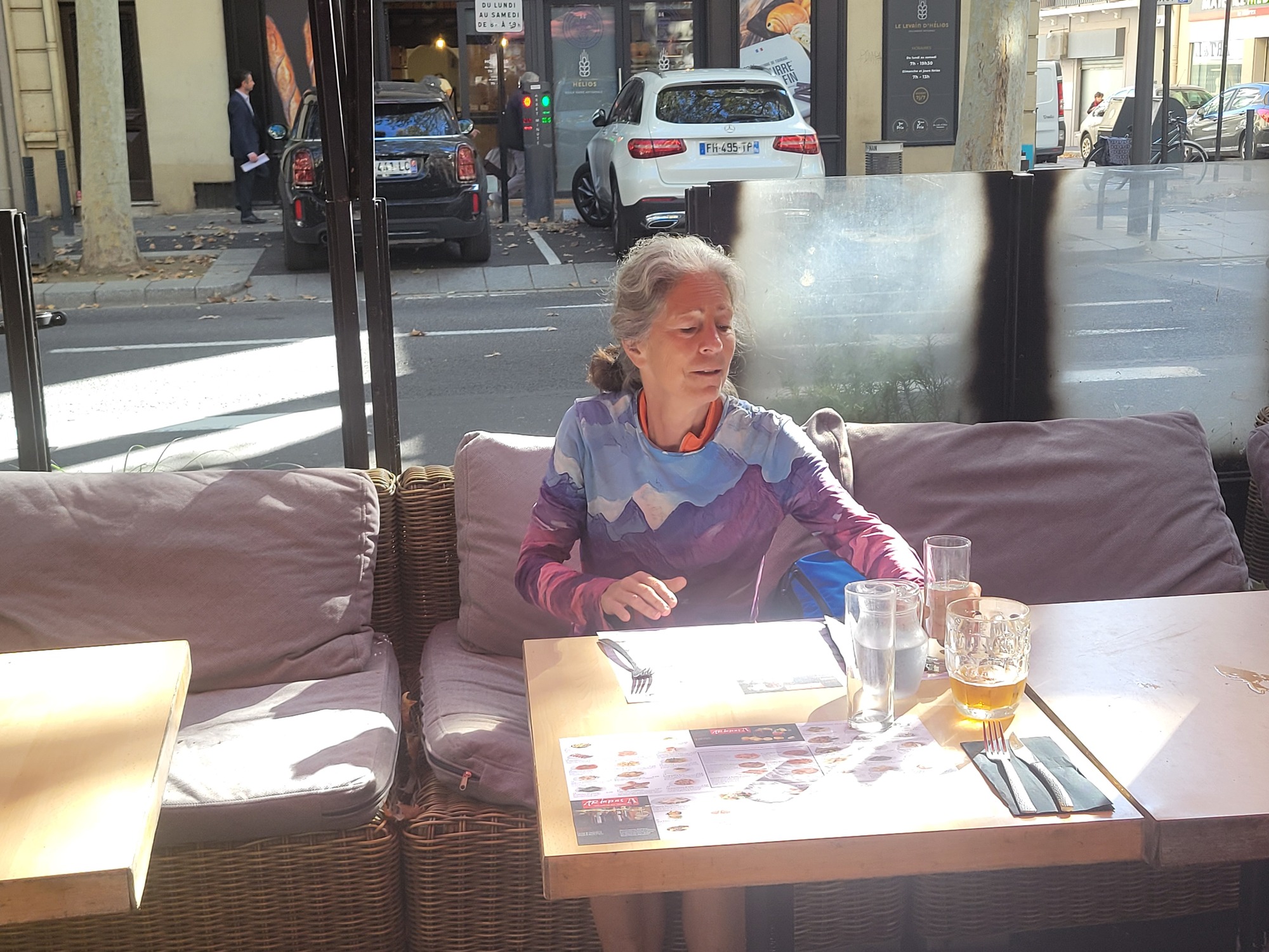 It’s around 2 when I arrive, only about an hour later than originally planned because the Narbonne run is so much faster. Somehow though it takes nearly fifteen minutes before we finally locate each other. She’s waiting outside of one side of the station and I’ve gone out the other, so she gives me a restaurant name as a landmark to map to and we meet there and then bike another half mile to the restaurant she’s booked for us.