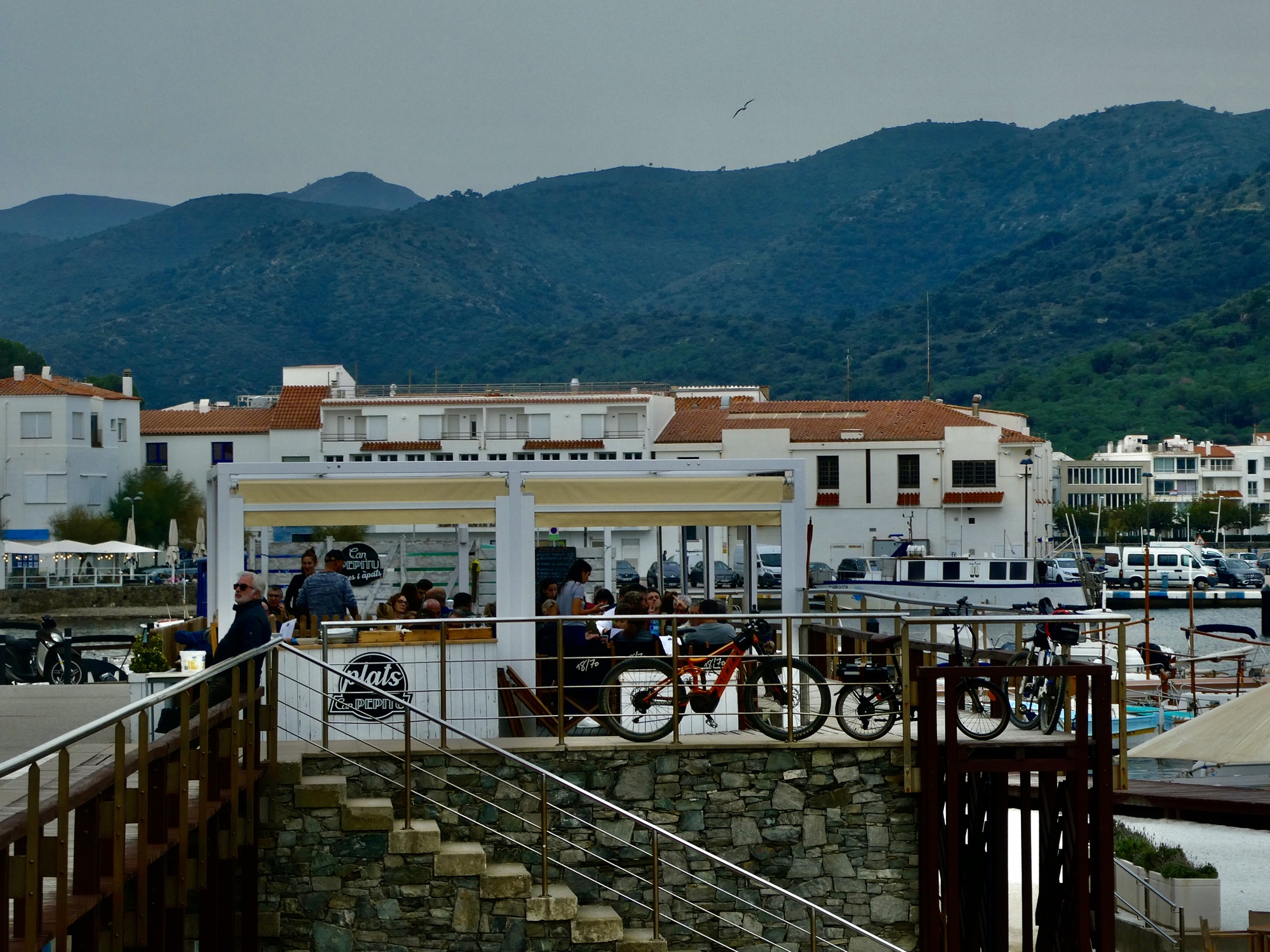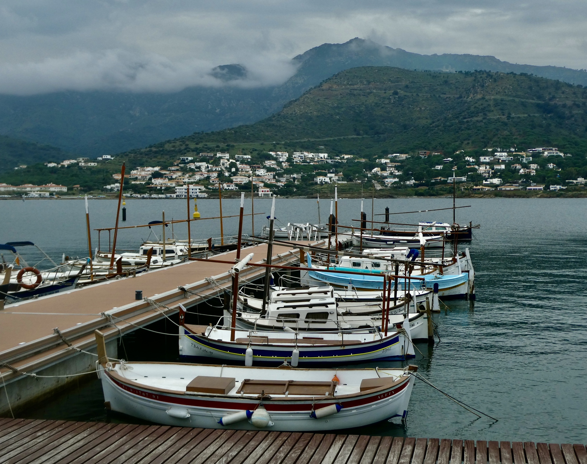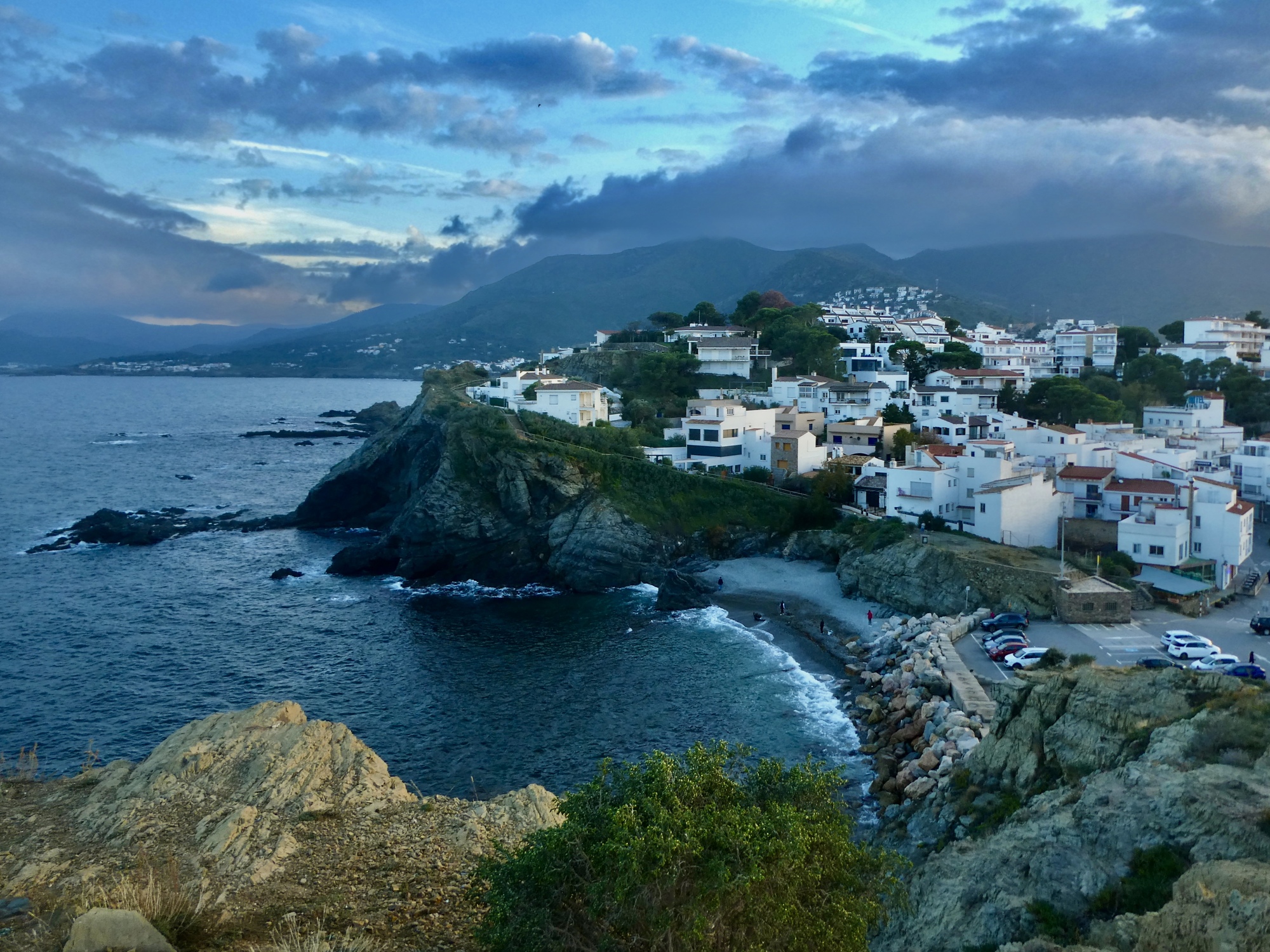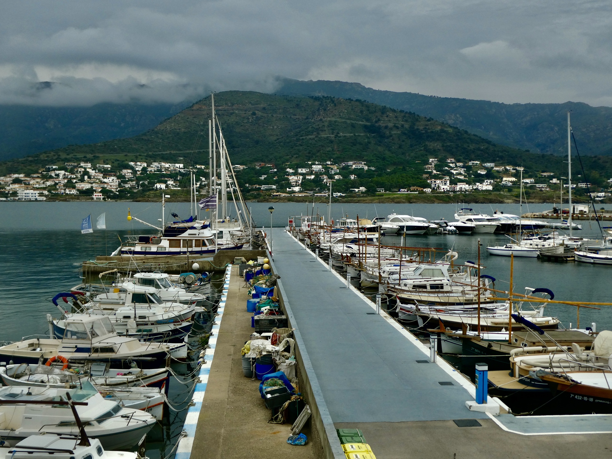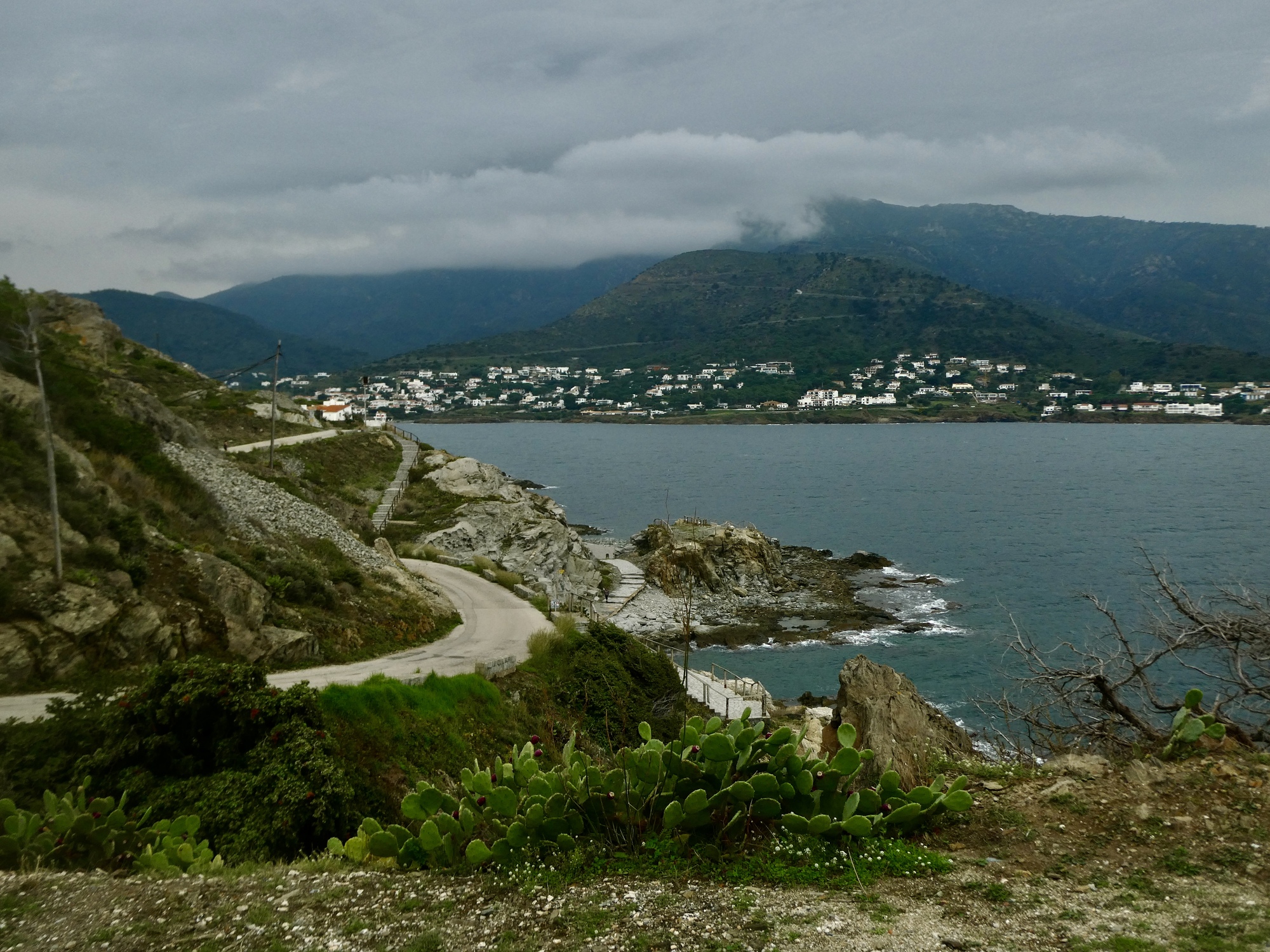 Lunch is fine, and when it’s done Rachael dashes inside for one last shot at a loo before she heads for home. I’m in no hurry, so I spend some time exploring the waterfront before starting back myself. It’s an attractive spot alright, but I cut my plans short (which included about another ten miles checking out side roads ) because the sky looks unexpectedly menacing. The sunny afternoon we hoped for now looks like we could even see a thunderstorm before long, so I cut my ride short and just head back, arriving back in Llançà just a few minutes before Rachael. Looking up toward where the monastery must be behind the clouds, I realize how lucky we were to have gone up there yesterday instead.