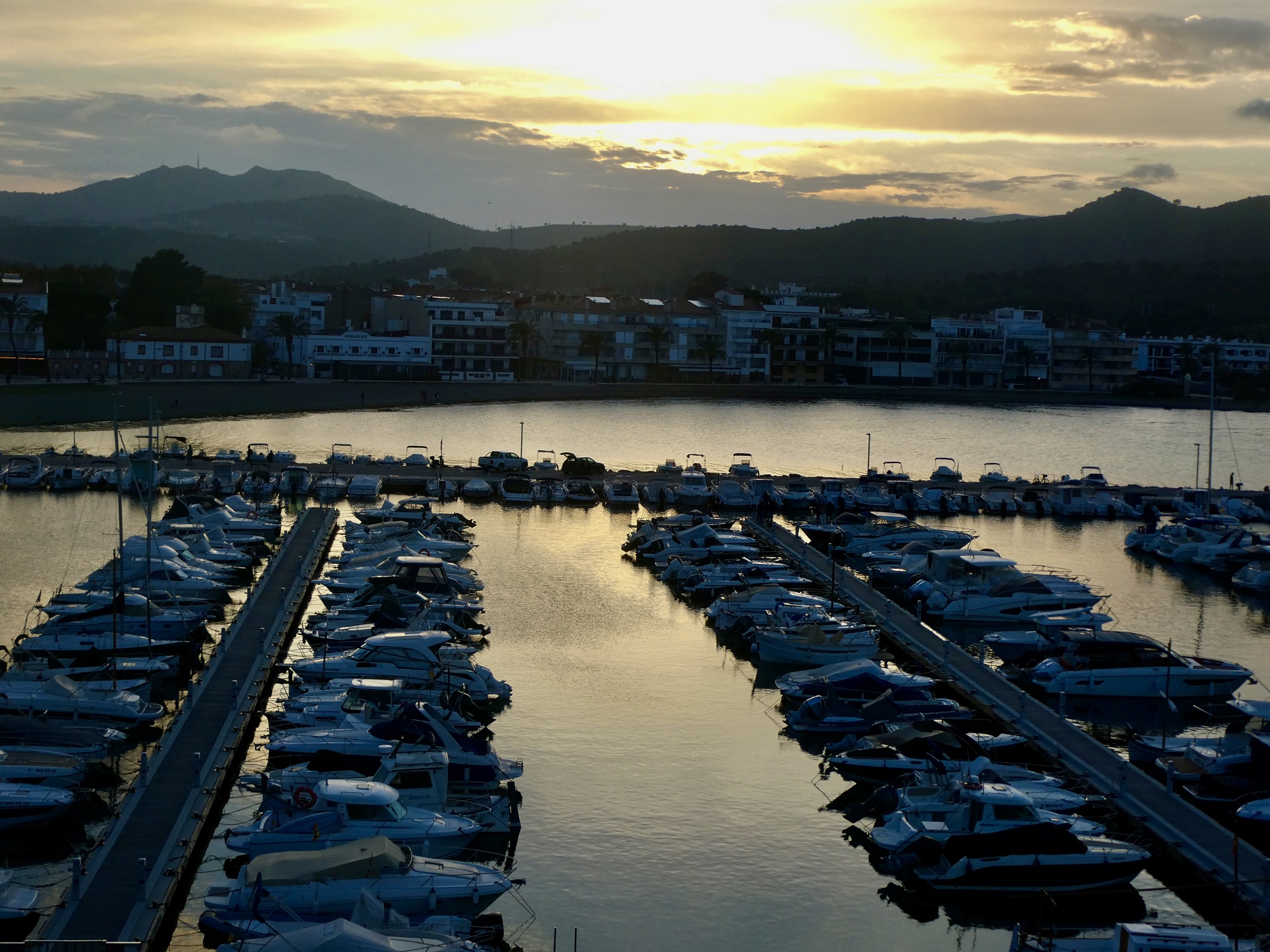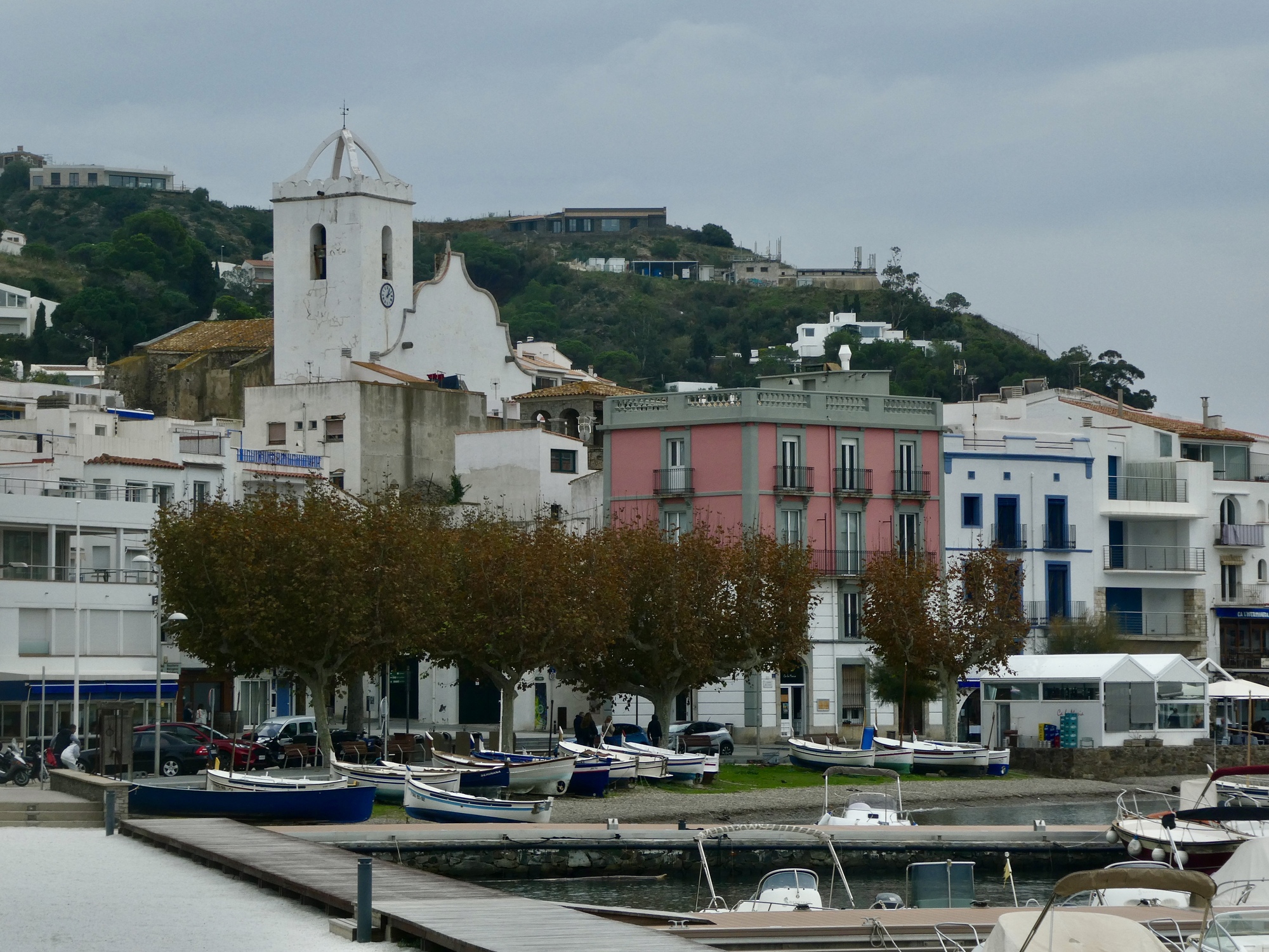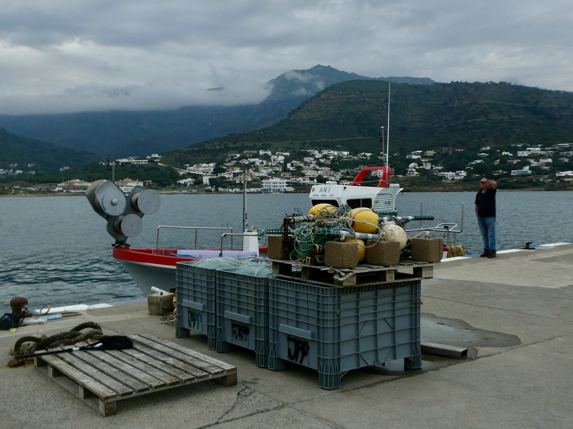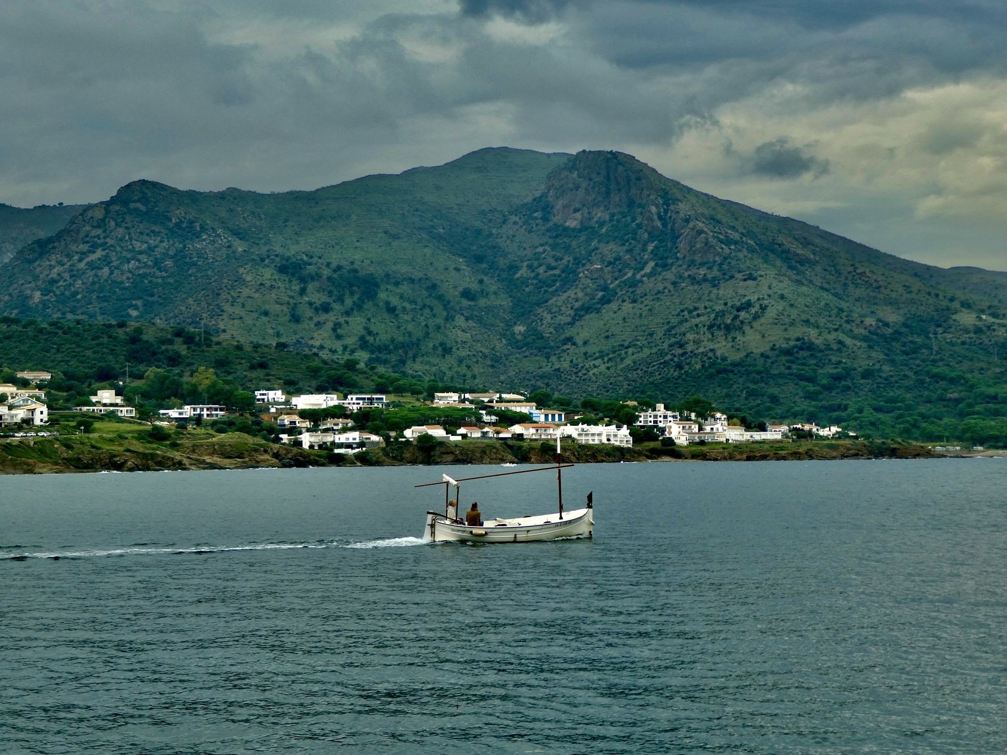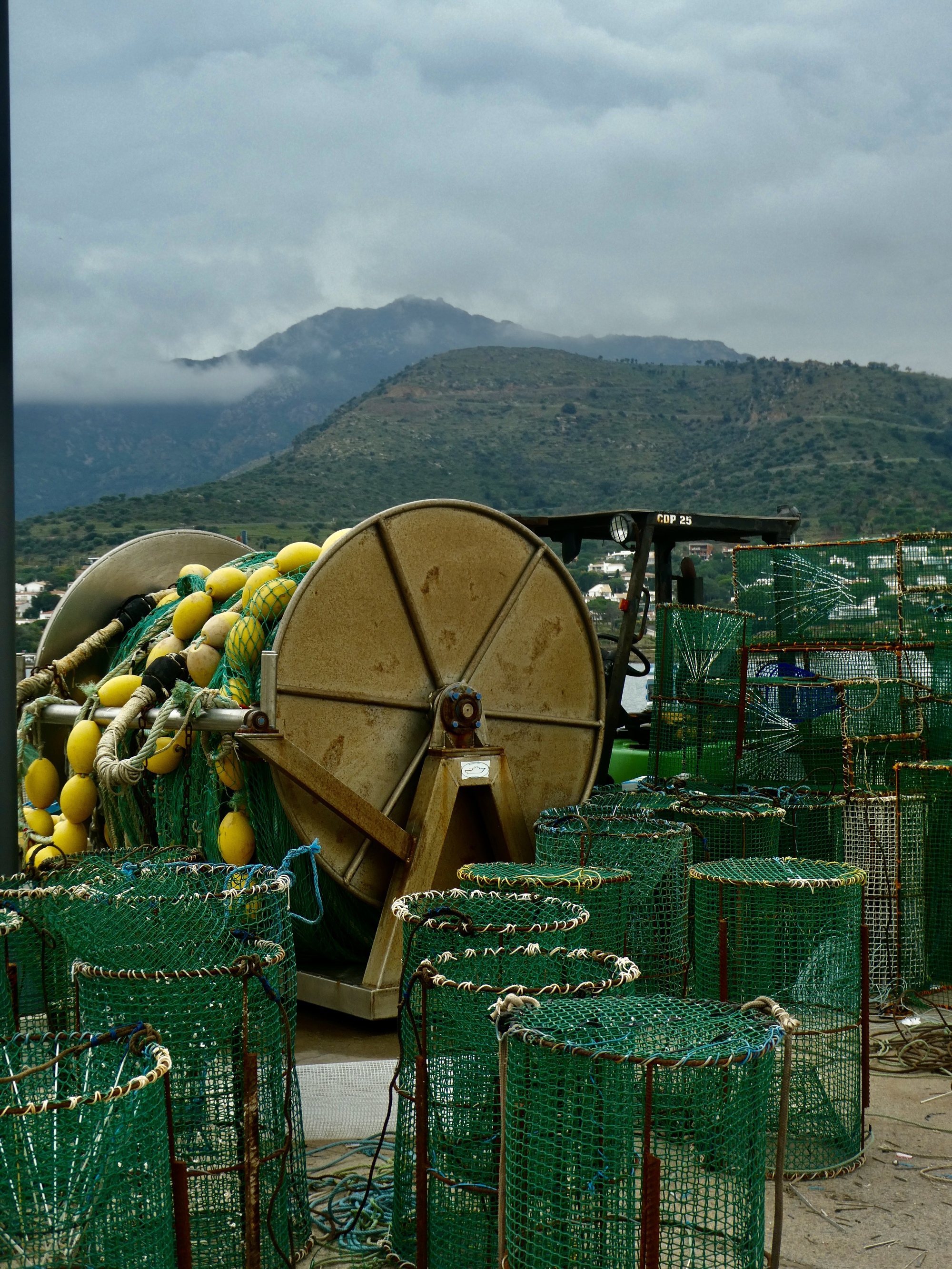 Lunch is fine, and when it’s done Rachael dashes inside for one last shot at a loo before she heads for home. I’m in no hurry, so I spend some time exploring the waterfront before starting back myself. It’s an attractive spot alright, but I cut my plans short (which included about another ten miles checking out side roads ) because the sky looks unexpectedly menacing. The sunny afternoon we hoped for now looks like we could even see a thunderstorm before long, so I cut my ride short and just head back, arriving back in Llançà just a few minutes before Rachael. Looking up toward where the monastery must be behind the clouds, I realize how lucky we were to have gone up there yesterday instead.