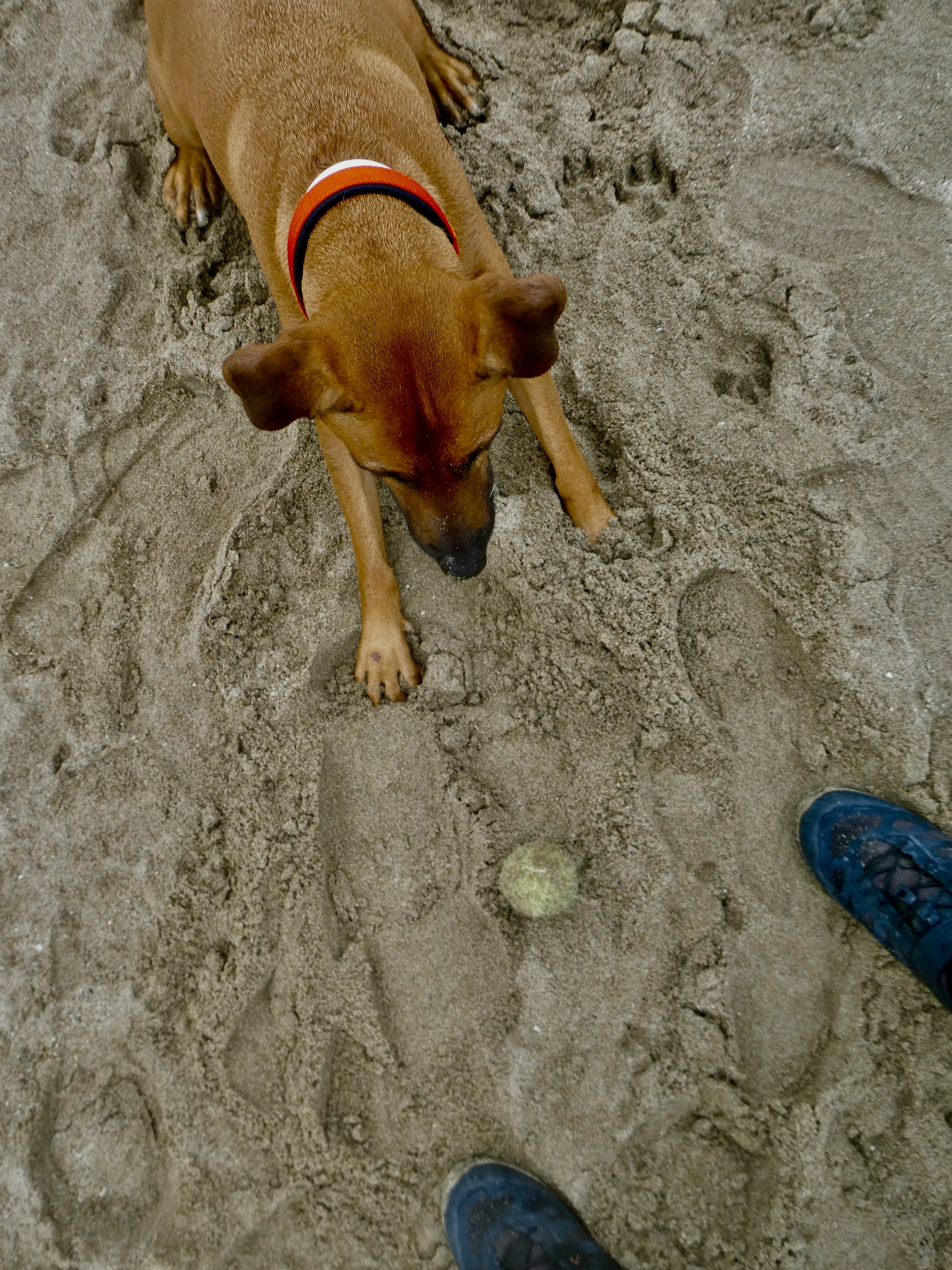 He stops at my feet, drops his sandy tennis ball between them, and looks up expectantly. I oblige him five or six times before deciding I should stop before I throw my arm out.