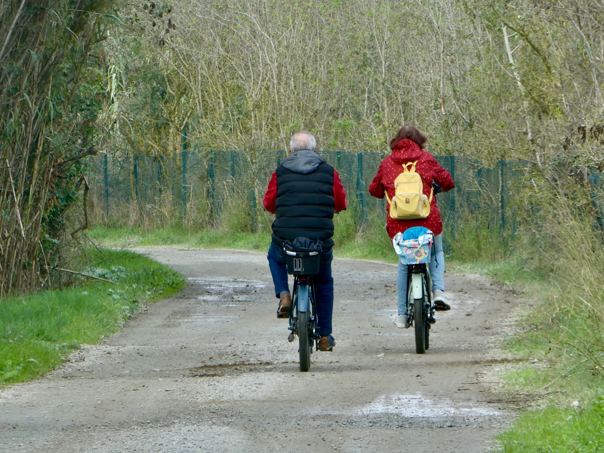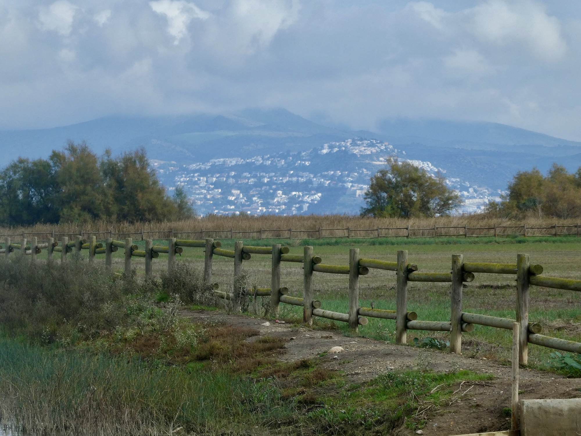The first part of my ride is identical to yesterday’s: though Empuriabrava, across the Muga River on the wood-slatted pedestrian bridge, and then down to the entrance to the natural park by its visitor’s center. Today though I slip on the down ramp of the bridge, startling the couple just ahead of me walking their bikes up towards me. The wood is slick this morning from last night’s rain, something I’ll need to remember when I come this way with Rachael on our ride to Figueres. Well really need to walk across.