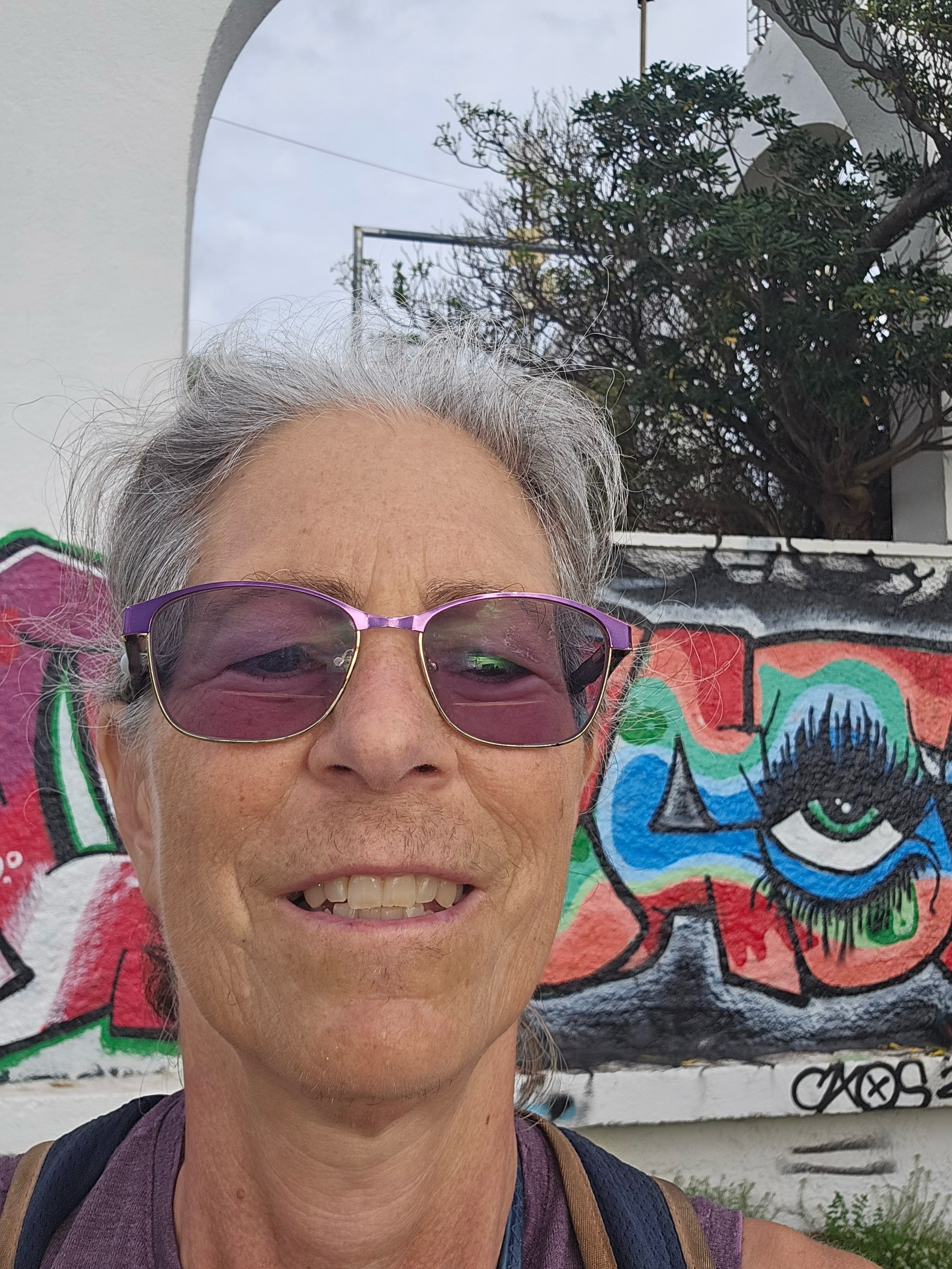 This morning is damp though, so we sit it out until noon and then walk up the beach a ways to an Italian place that looks attractive and take our seats at a covered outdoor table facing the sea. As we walk the roughly quarter mile we’re amused by a man walking the surf line on the sand, his phone in front of his face and appearing to be taking a walking selfie of his face with the sea and hills behind him. Ten minutes later when we arrive at the restaurant he’s still at it.