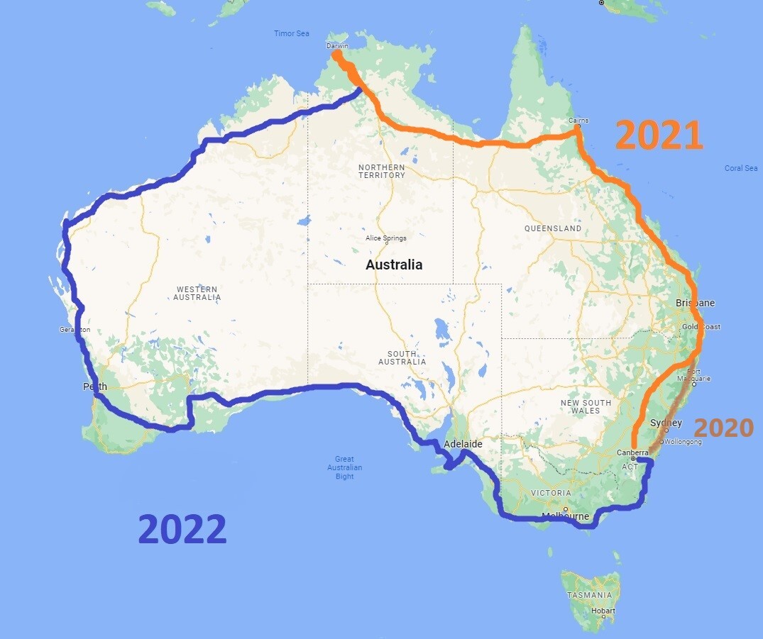 In 2021, I started from home in Canberra. I went up the east coast to Cairns and then headed west to Darwin.