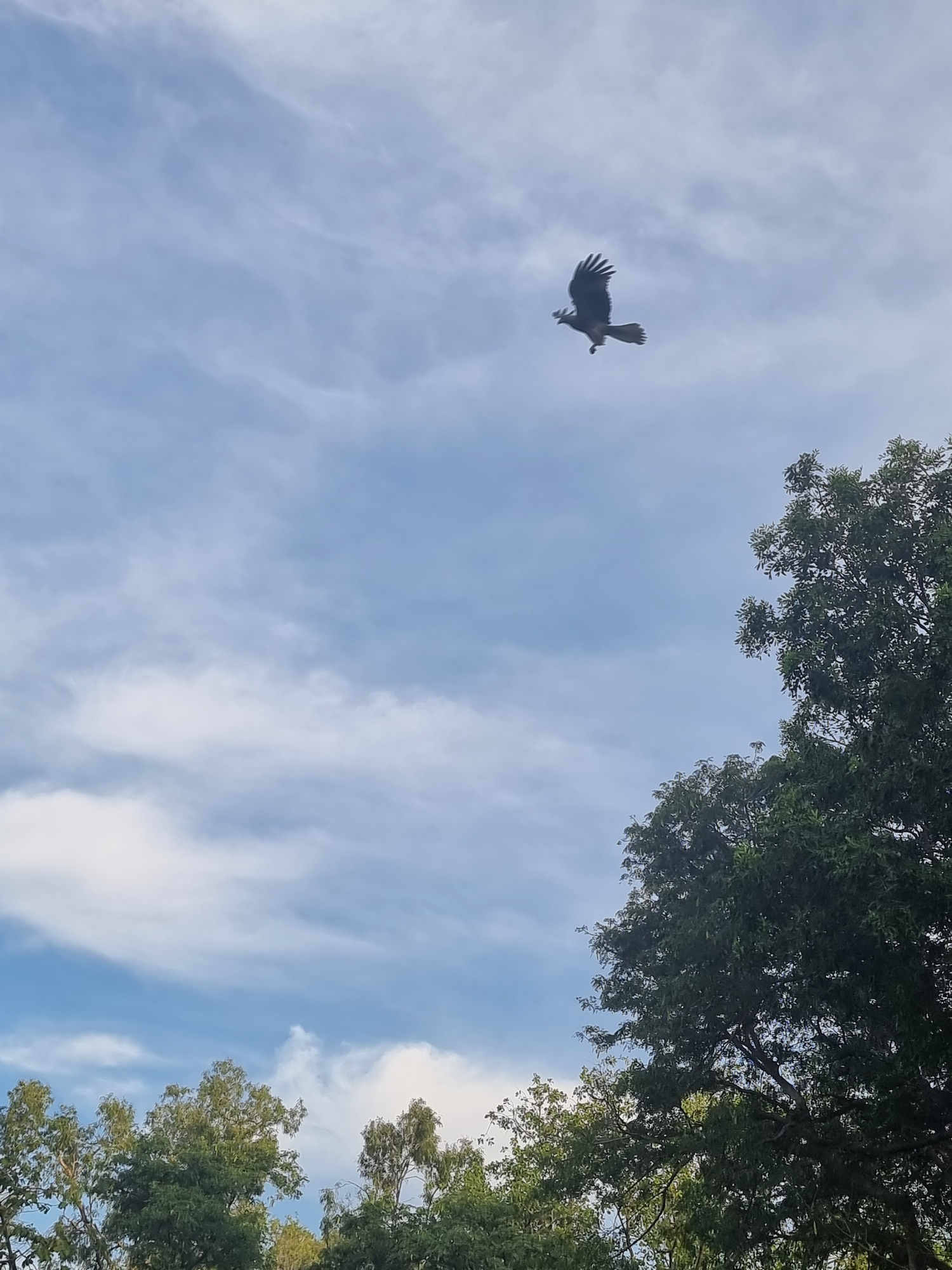 They were either a whistling kite or a black kite. The fellow would throw the meat in the air and the birds would swoop down and catch them.