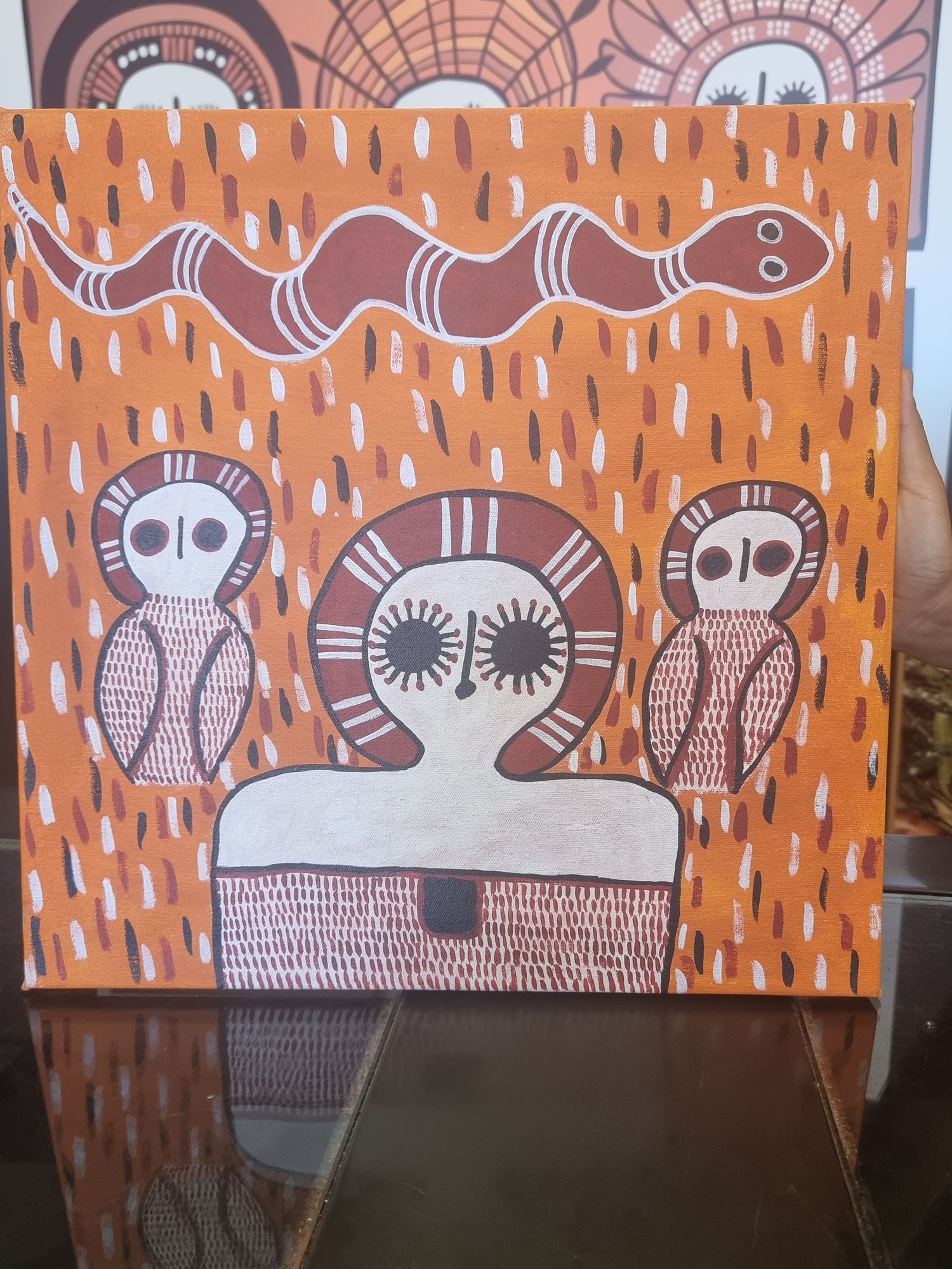 I bought a piece by Gabriella Barunga. She is a Ngarinyin woman. The painting is of their creator spirit Wandjina, Dumbi barn owls, and Ungud snake. I received some information about the meaning of the different beings.