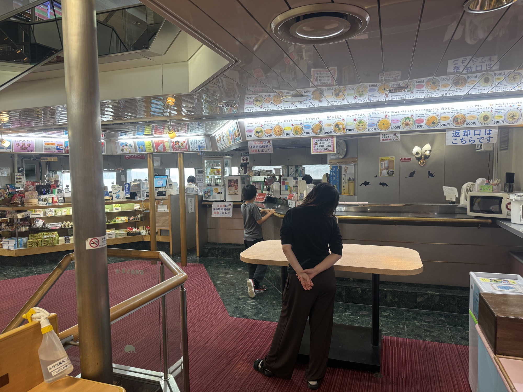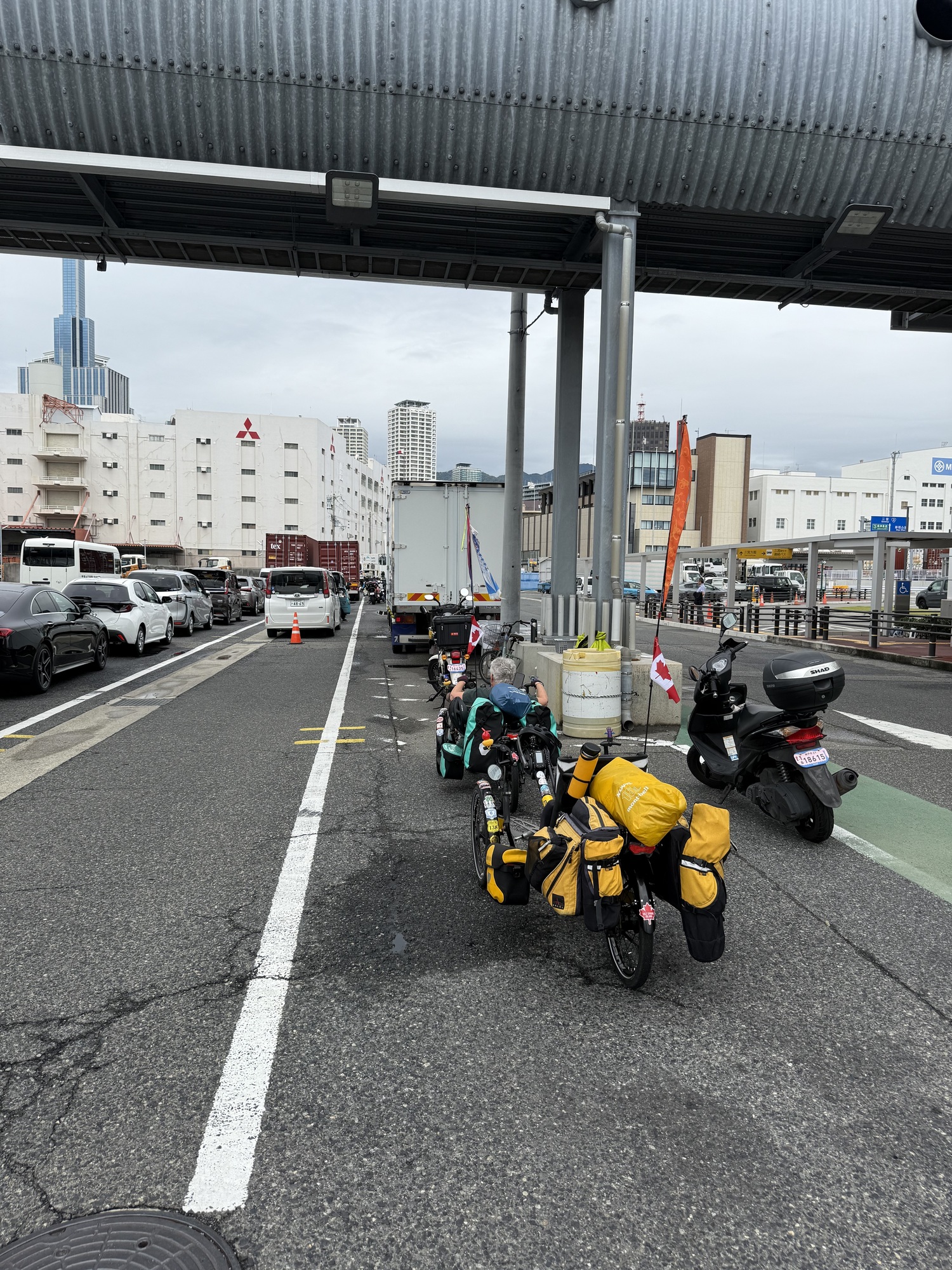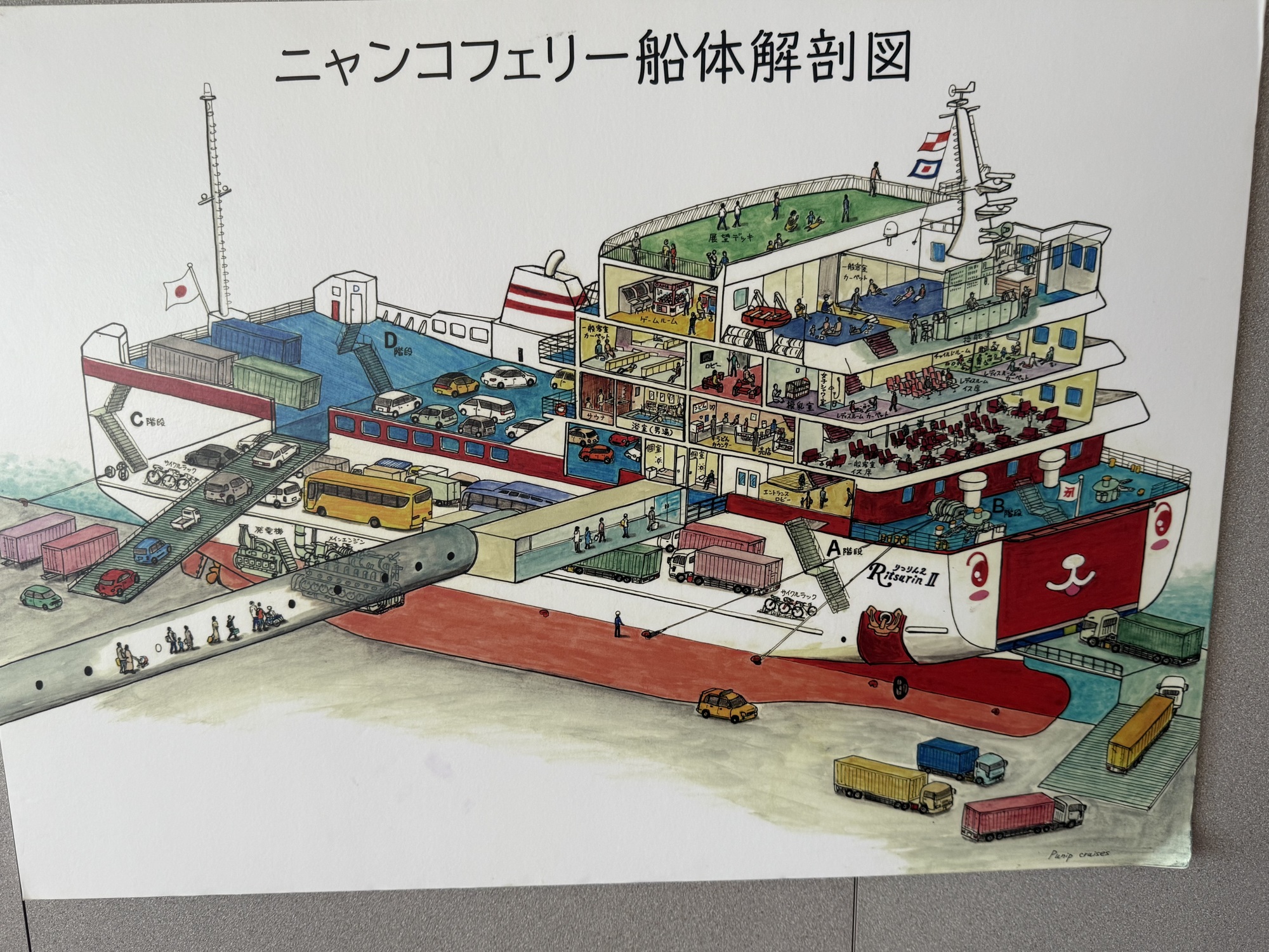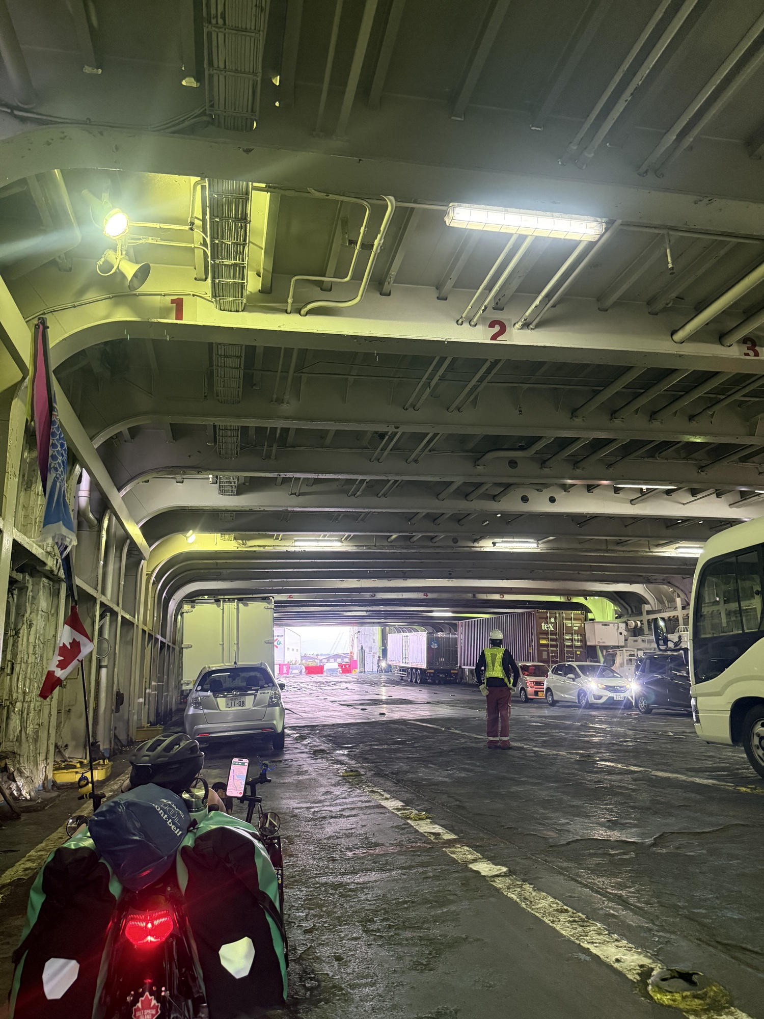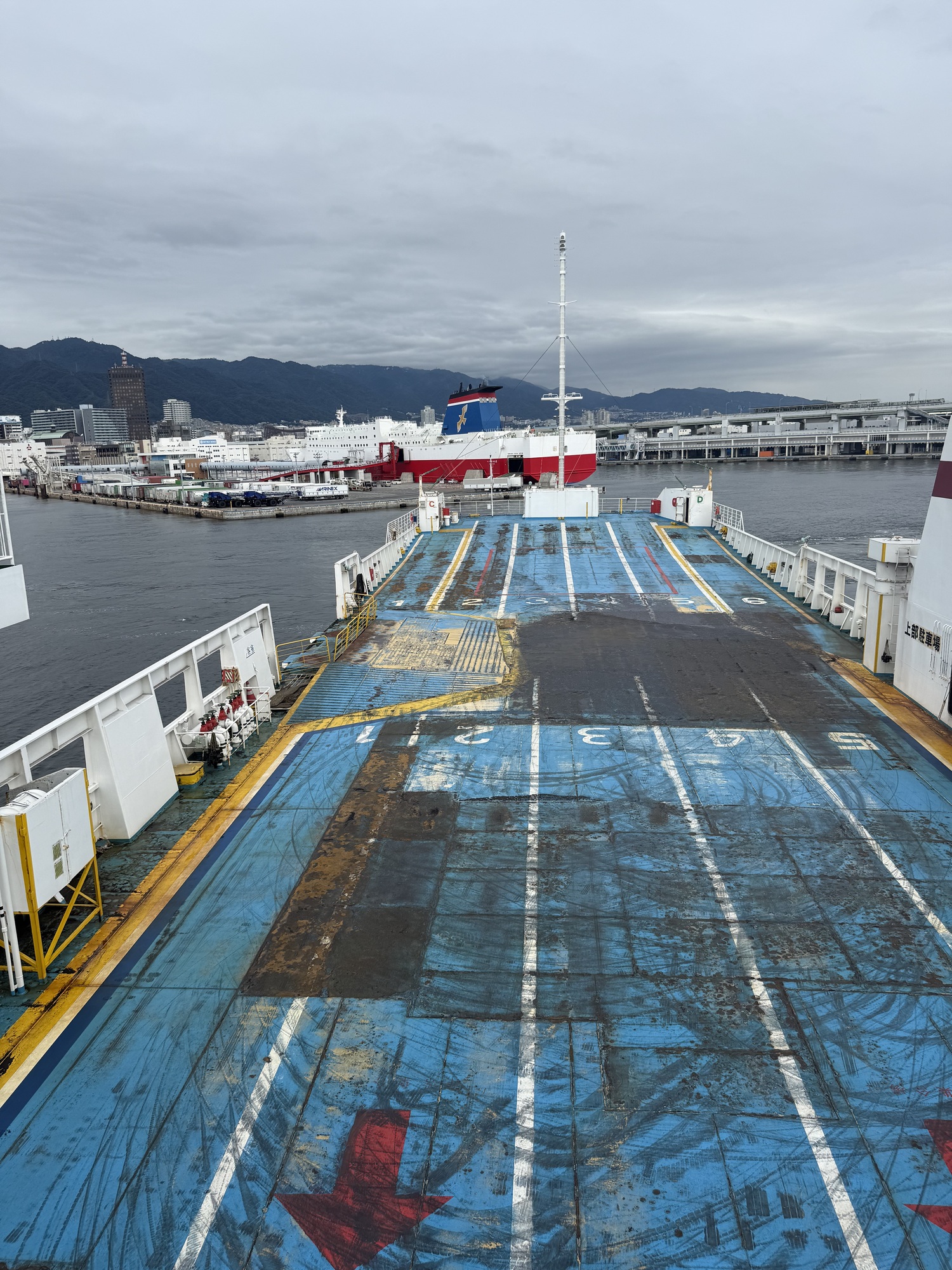 A cross section view of our ship. Most of the seating you see is reserved at a higher price. Note the large section of tatami mats (blue section on the 4th floor) where most people go. There is very little seating that is free….luckily Barry found 2 comfortable seats in a corner. We parked on the bottom floor with the big trucks.