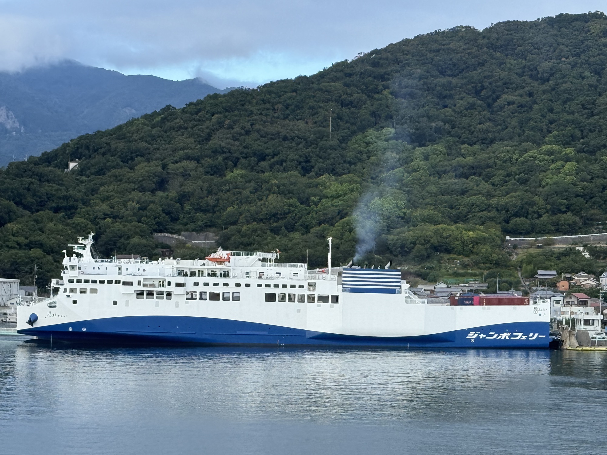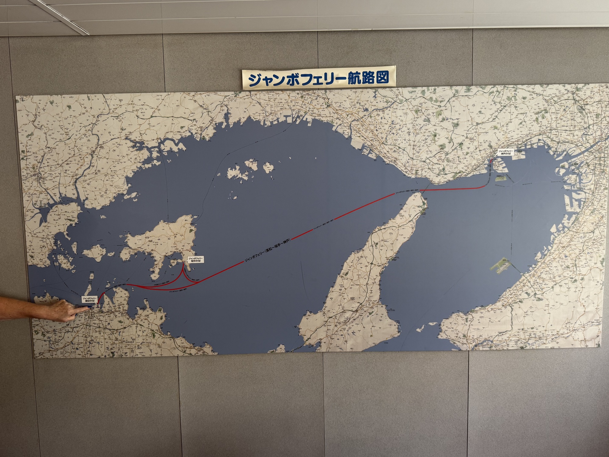 We will make one stop on this crossing at Shodoshima Island. The islands in the Seto Sea are very popular. On ten of the islands in the Seto Sea an art festival is celebrated three times a year. Some of the islands have contemporary art museums and most of the islands feature outdoor art installations. Unfortunately, we won’t stay on the islands as prices are pretty high during this time. The ferry at dock is the second vessel that does this route….as you can see we are on the older ferry.