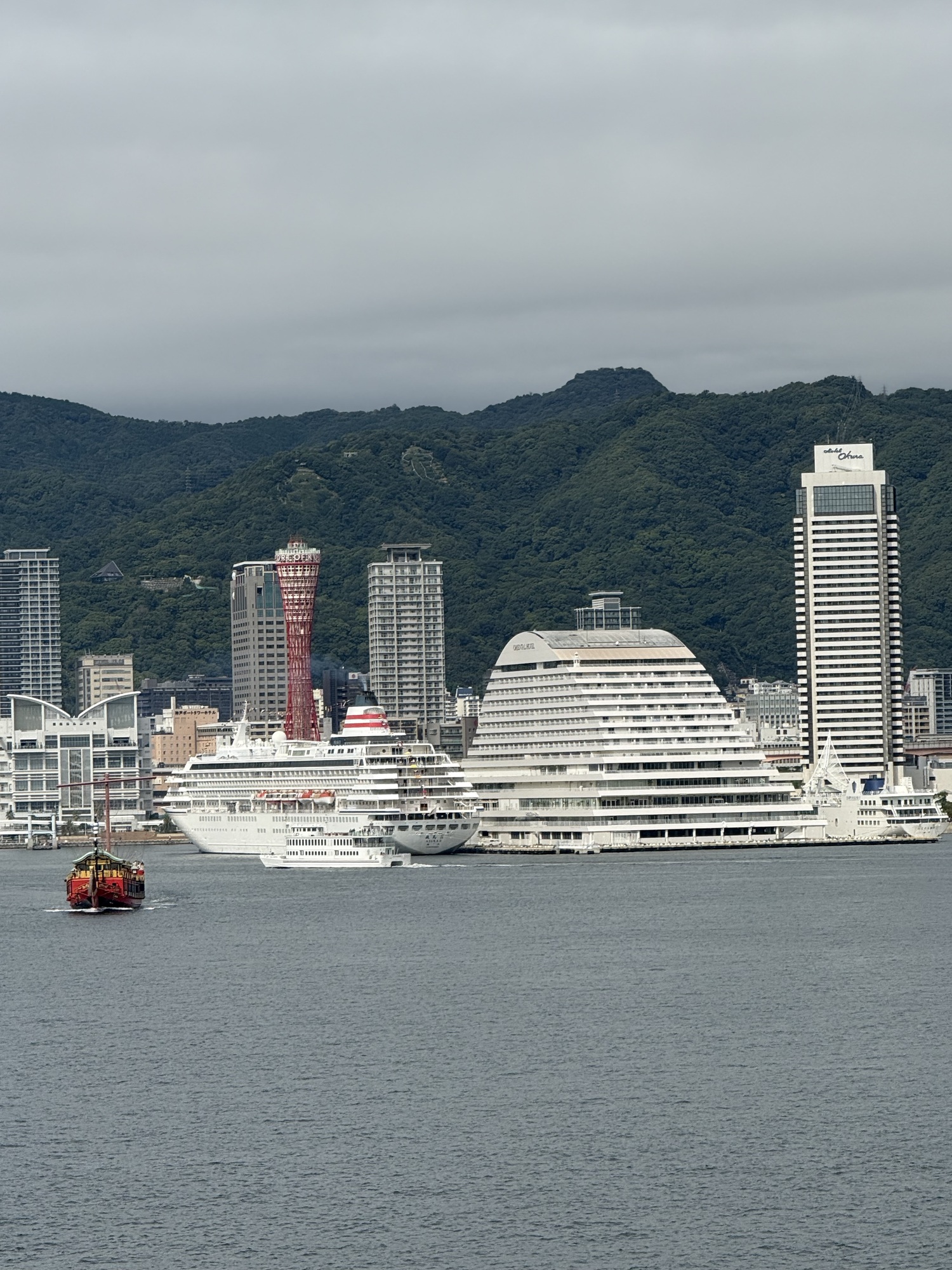 Looking back at Kobe…a cruise ship is in port by the luxury Oriental hotel. As you can see, Kobe is surrounded by massive hills. liked the juxtaposition of the Japanese vessel alongside the massive cruise ship.