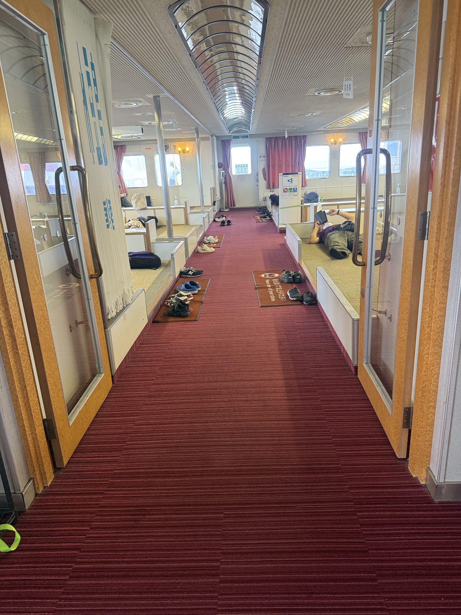 The tatami mat is the most used and popular place on the ship. I managed to nap for a while until my hips had enough of the hard floor. Unlike Westerners, Japanese people are very comfortable sitting and resting on tatami mats.