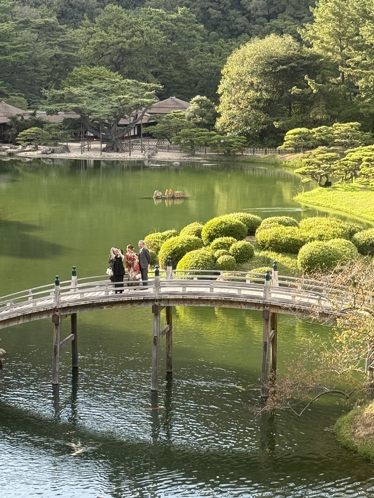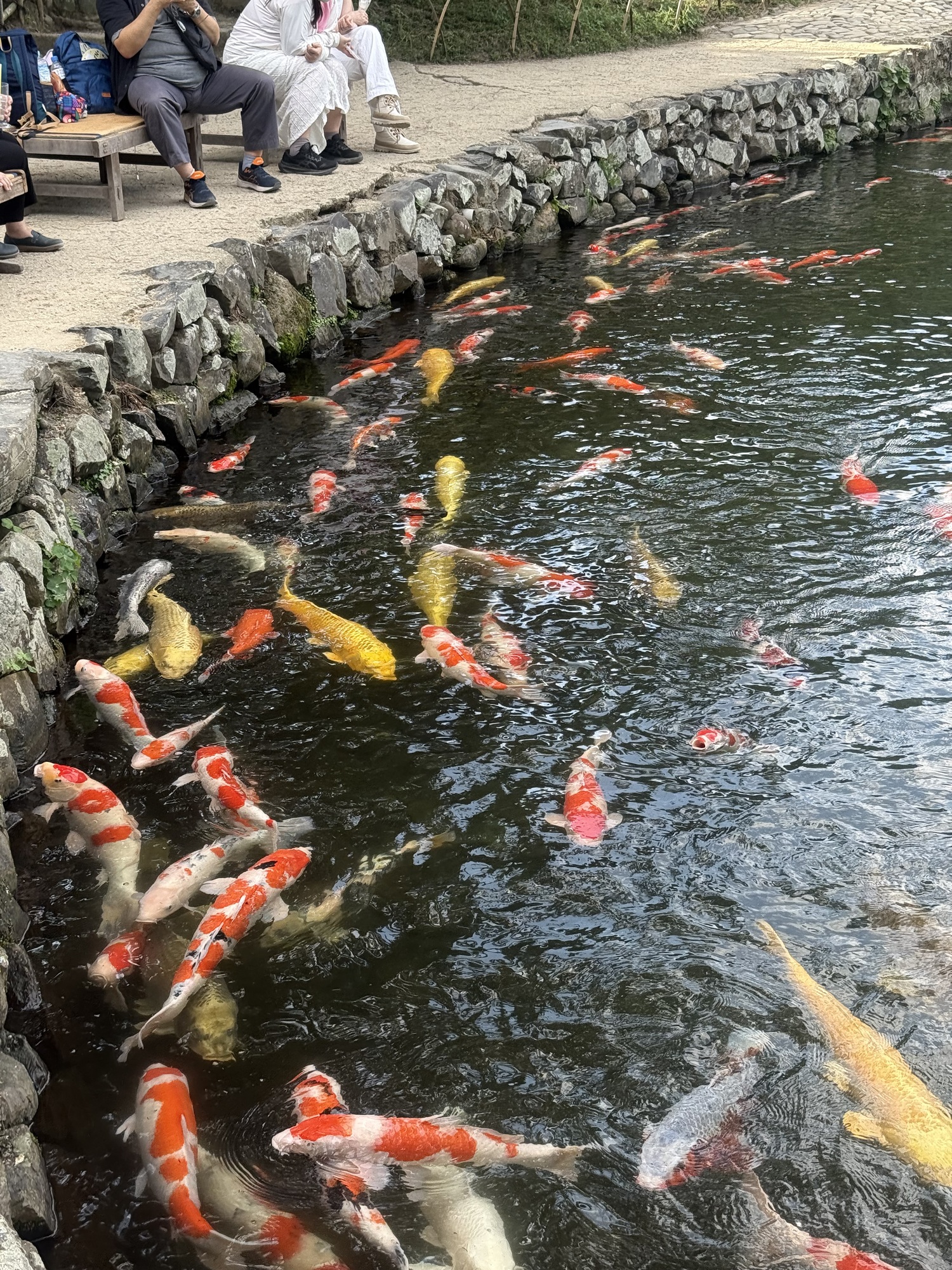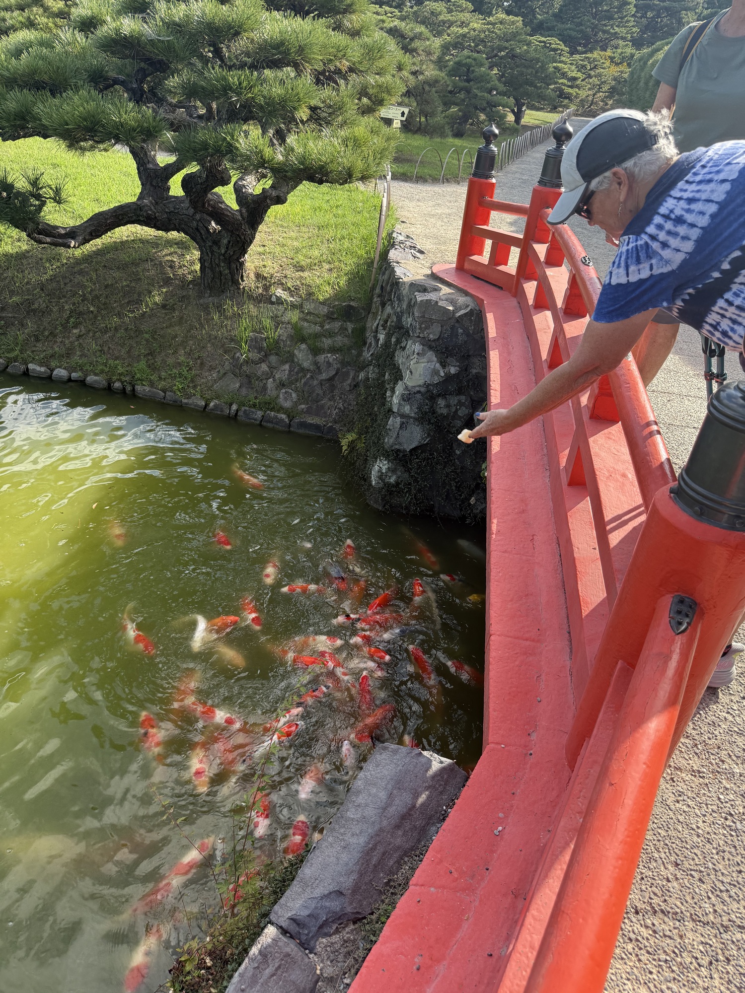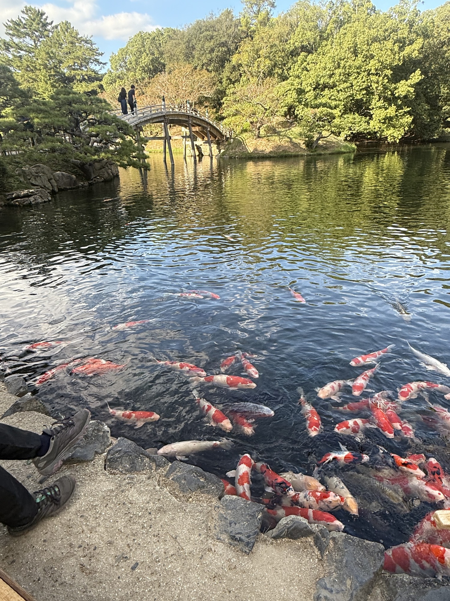 The koi are conditioned to have expectations of food when they see people on the bridge. It is fascinating to see this blaze of colour coming toward you as they rush to be fed.