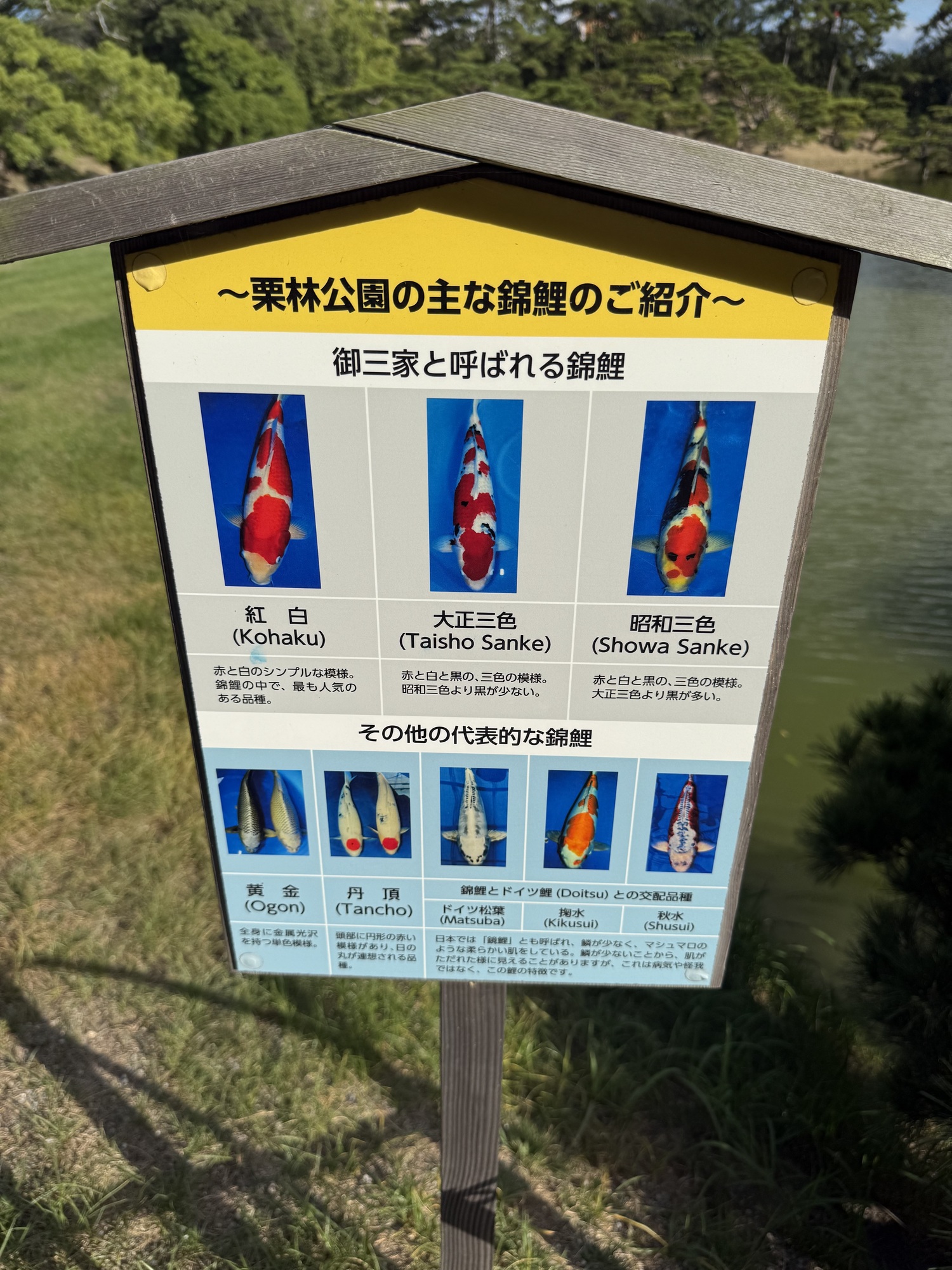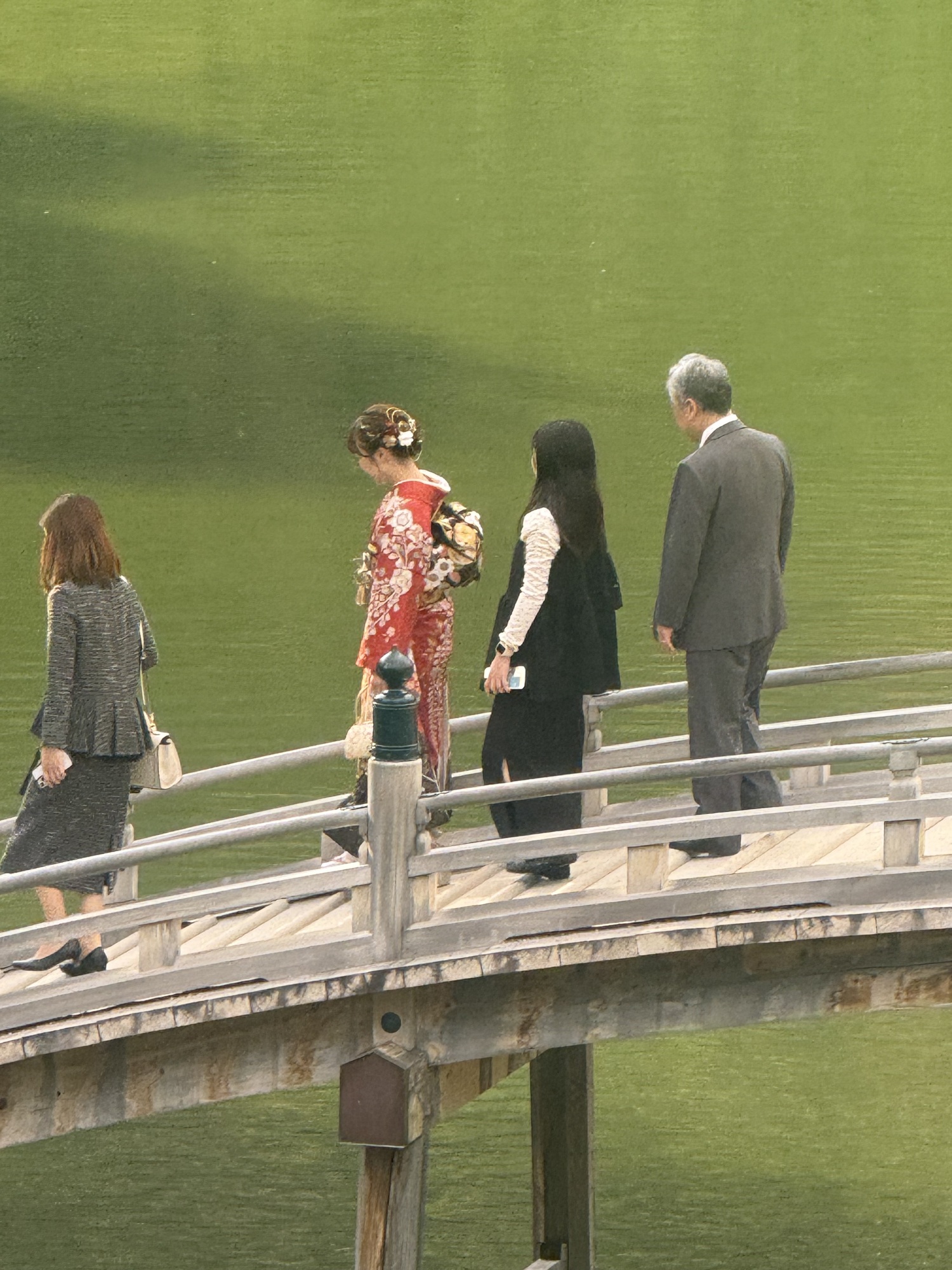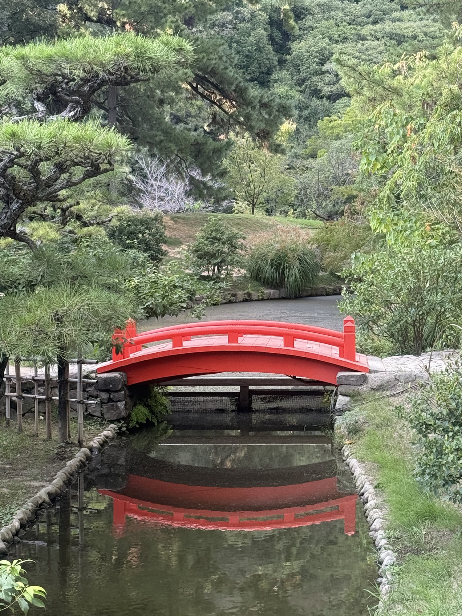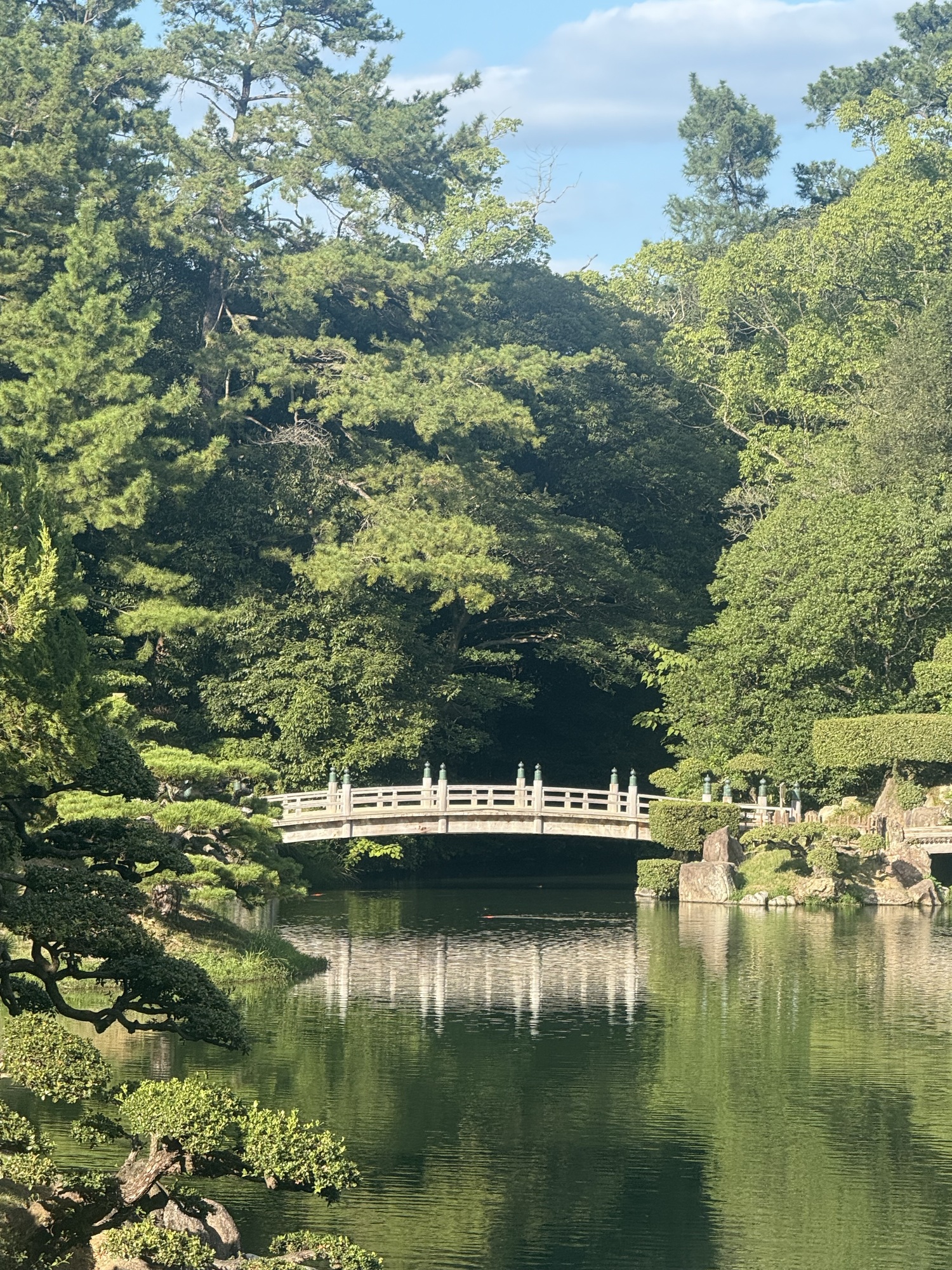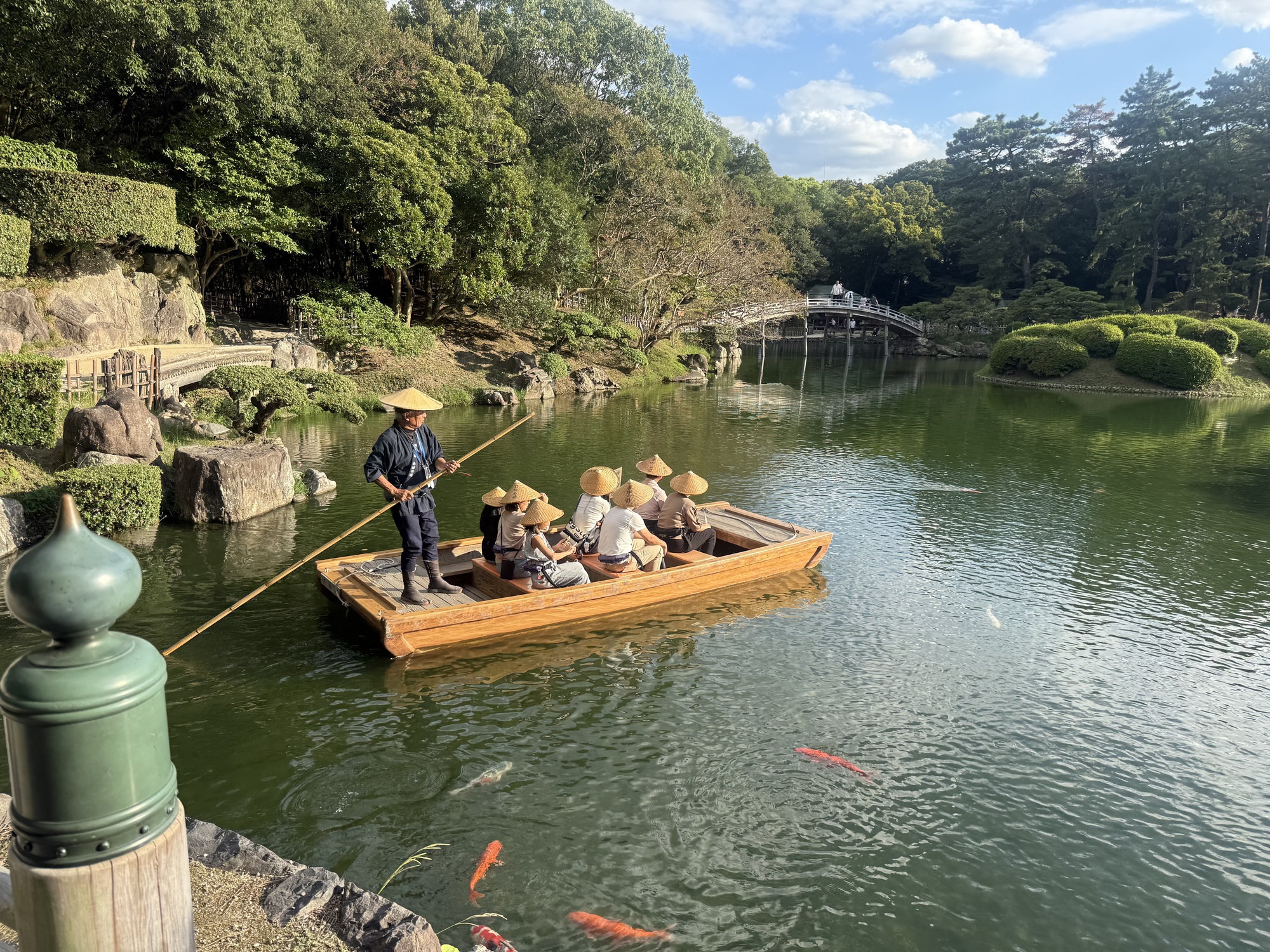 The koi are conditioned to have expectations of food when they see people on the bridge. It is fascinating to see this blaze of colour coming toward you as they rush to be fed.
