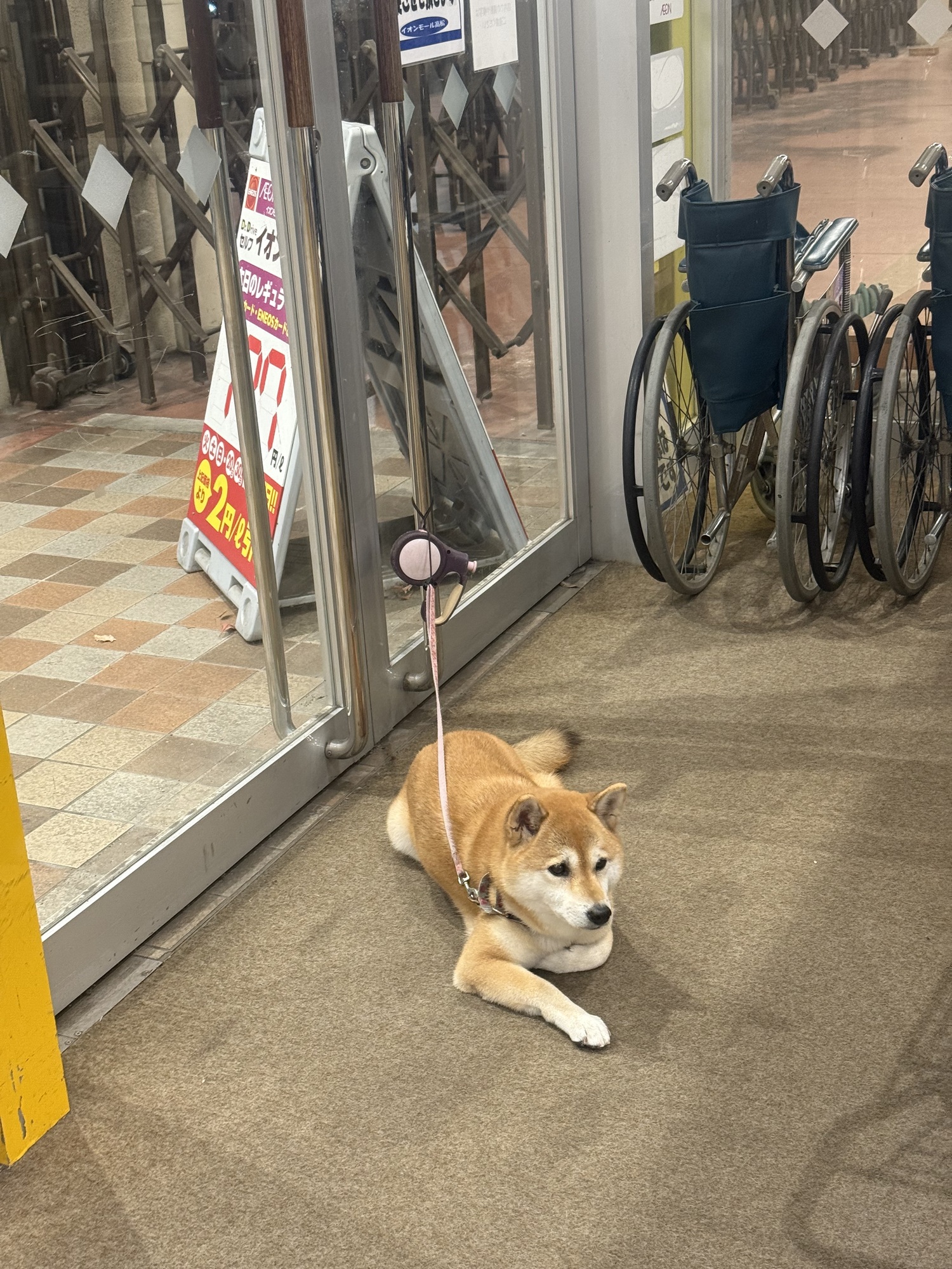 We rode our trikes to a mall to visit a Montbell outdoor store. We needed a few things. As dogs aren’t allowed, this forlorn looking fellow was waiting patiently for his owner. We tried to chat with him, but he kept his eyes focused on a possible sighting of his owner.