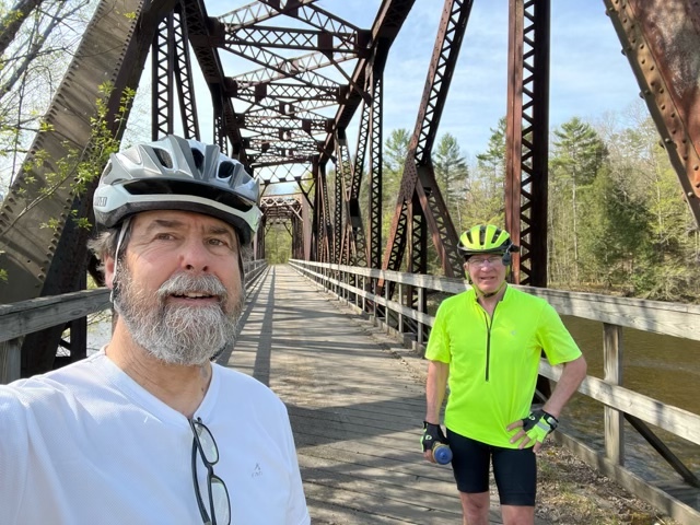A day that started cool and flat and ended hot and hilly. Bill joined me for the rail trail from Littleton to Woodsville. Then I crossed over into Vermont and rode Rte 302 to Barre. The first ten miles were wonderful, with wide shoulders and reasonable grades. Then things got really ugly - two long steep hills with narrow shoulders. I pushed on through the heat, over the top of the hills, and eventually a long downhill run into Montpelier. I’m staying with friends Larry and Kate tonight.