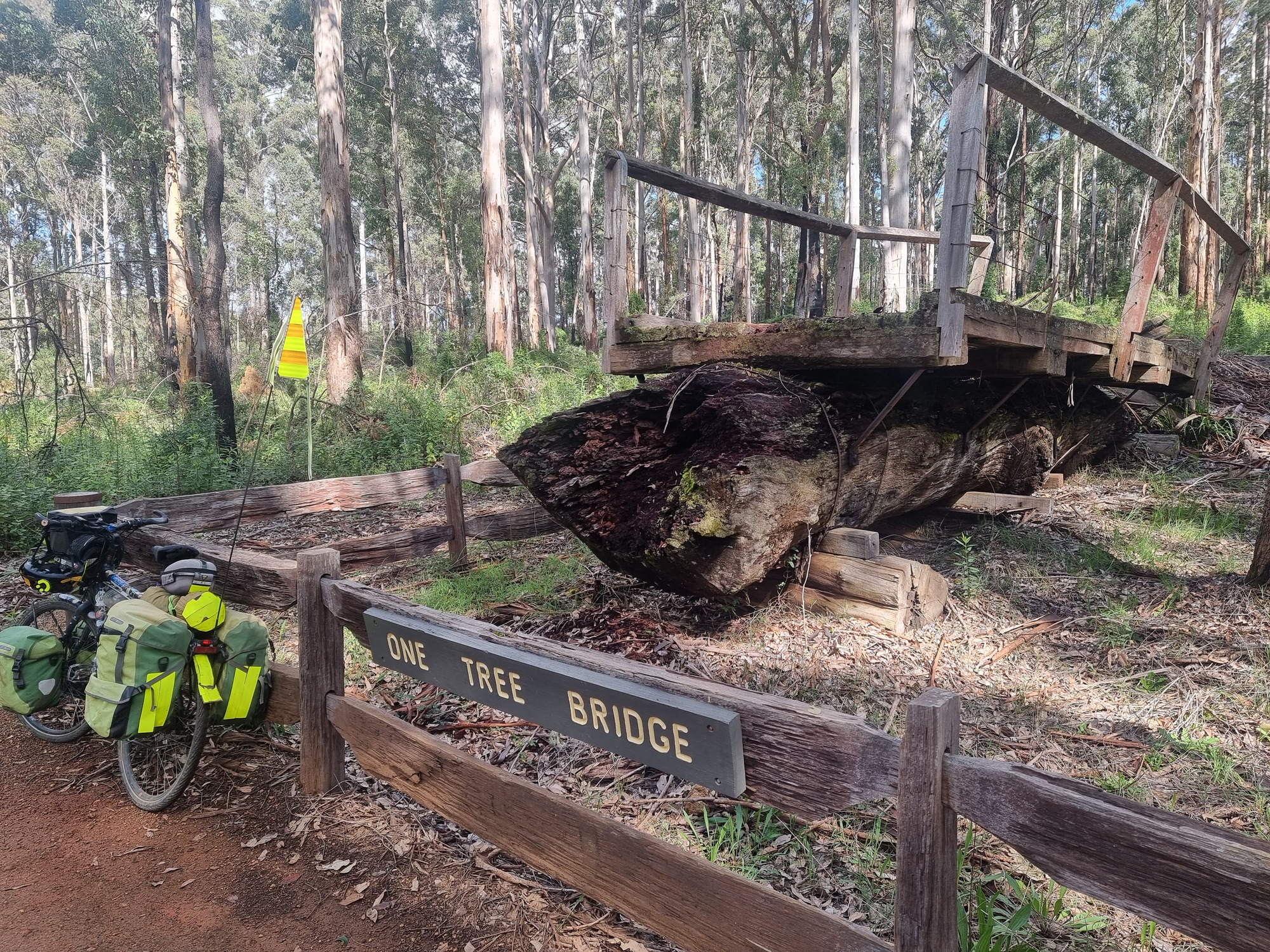 In 1904, this karri tree was felled across the 25 metre wide river. They then used jarrah to build a usable bridge on the top of it.