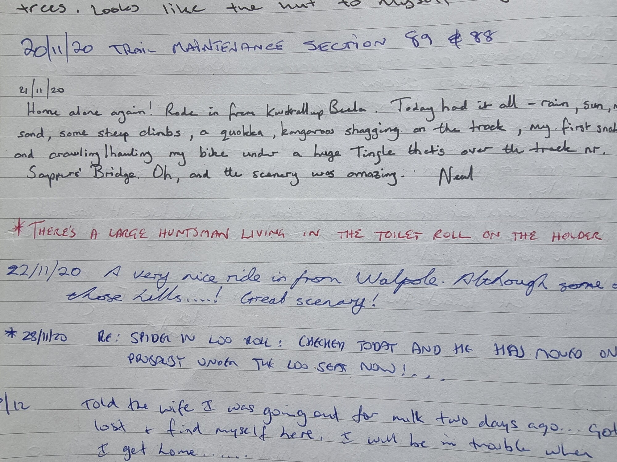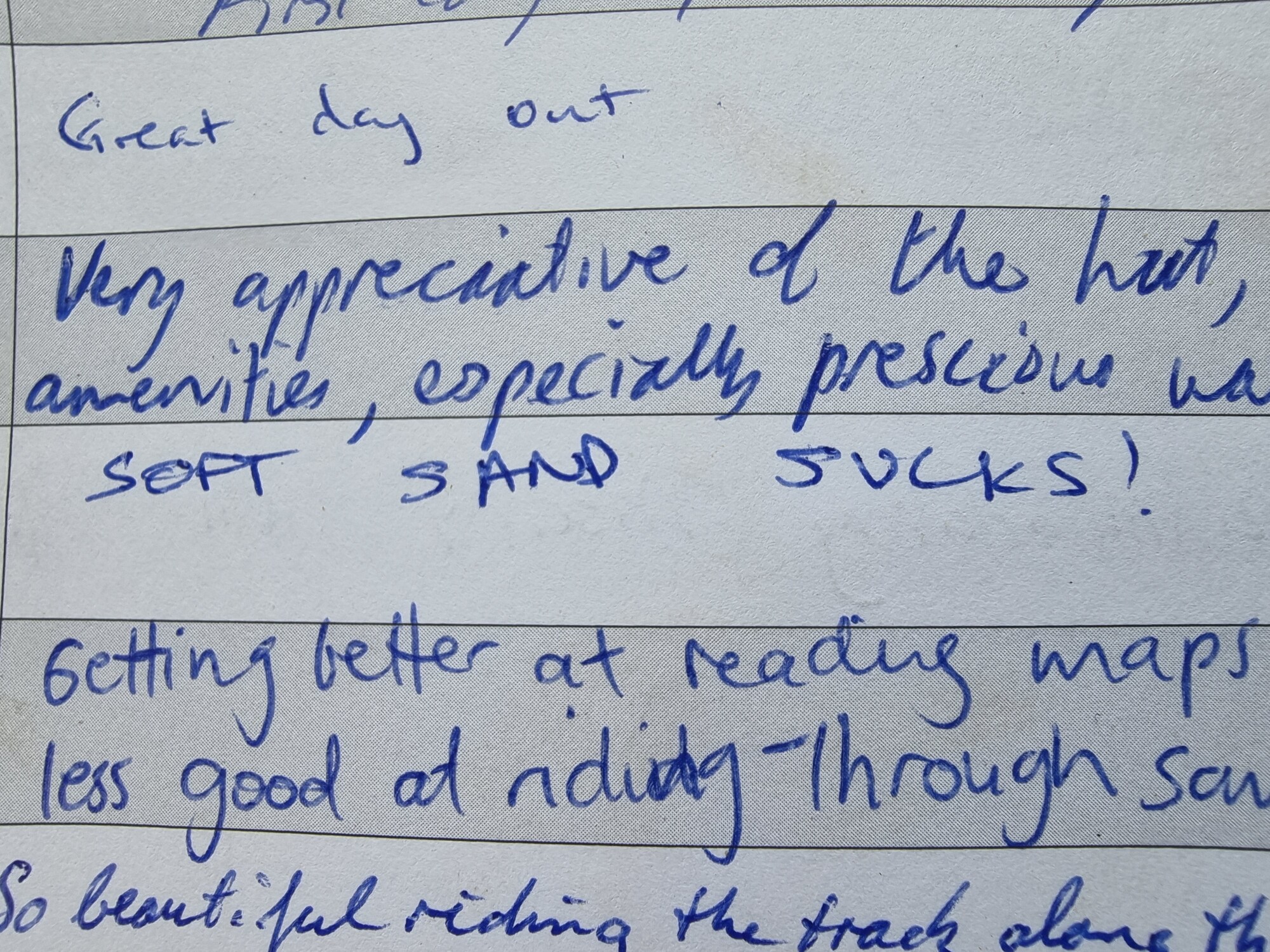 There is no one else camping here. The hut registration books lists many people struggling with the hills and the sand. A few people broke spokes and rear cassettes and one person had to walk up to 20kms. People saw deer and foxes and cats.