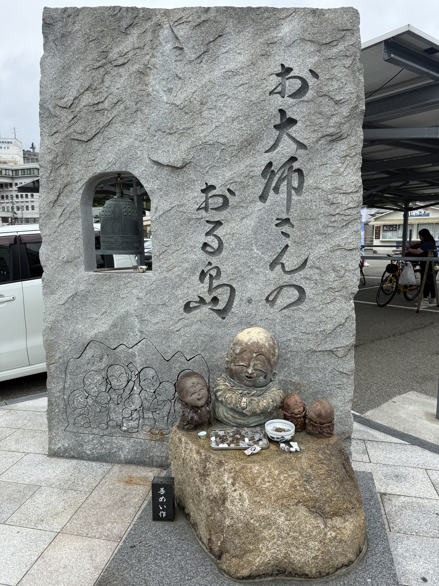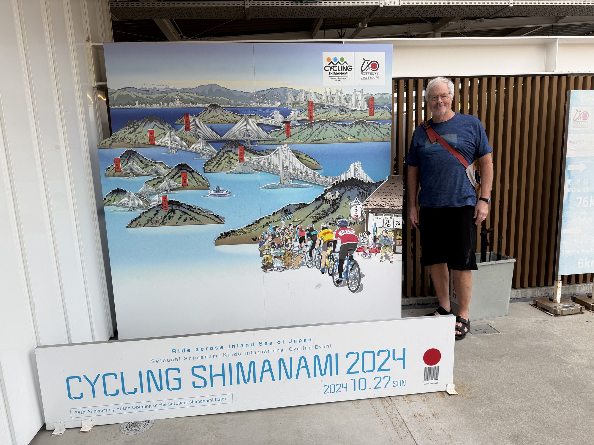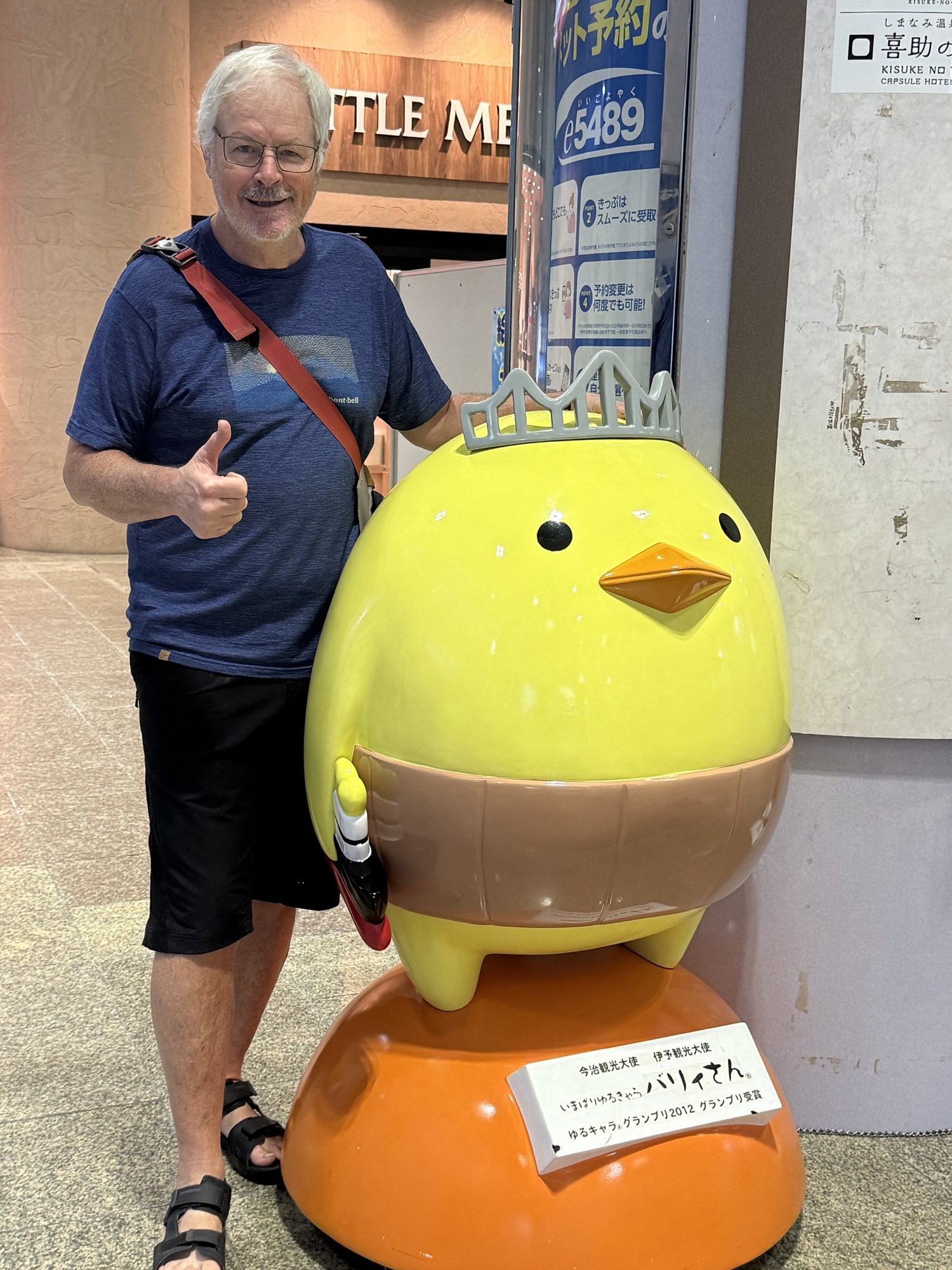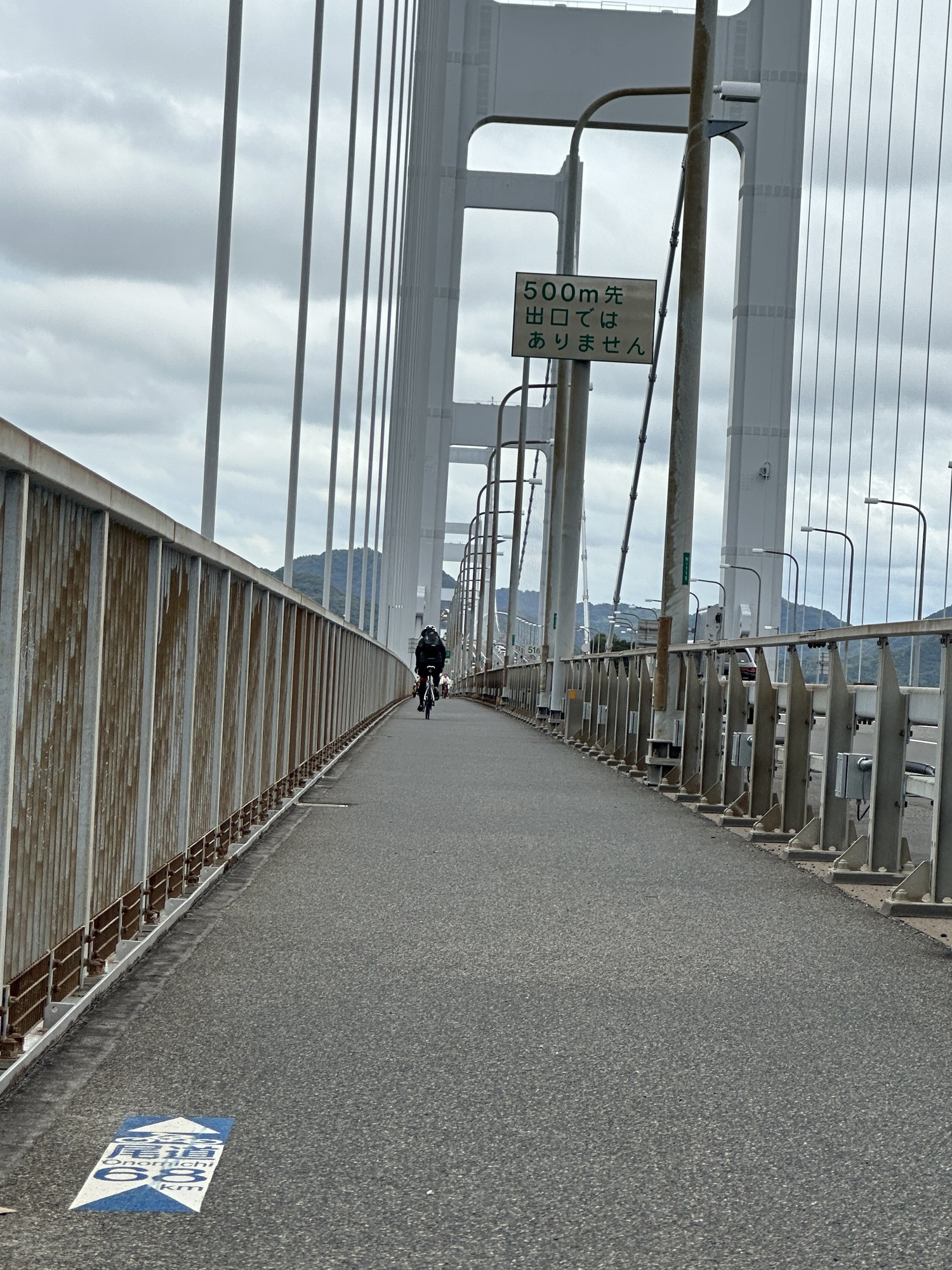 Well, here we go again. If you enjoy something, why not do it again. A couple of years ago we rode this world class cycling route, the Shimanami Kaido. It follows a formula…the ride is about 70 km from Imabari, Shikoku to Onomichi, Honshu. The route is comprised of 6 bridges connecting seven islands which are famous for the stunning bridges, fresh seafood, citrus groves and a phenomenal infrastructure. Your job is to follow the blue lines, no map required. Each island is quite distinct with Road Side Michi-no-Ekis offering food and local crafts, Konbinis and island communities. The bridges are an attraction on their own merit as they are quite beautiful and are an engineering feat. To reach each bridge, you must climb on a circuitous paved route with blue lines (of course) and then enjoy a downhill ride at the end. At no point, do we see or meet vehicles. The first bridge, the Kurushima Kaikyo Bridge begins the route at Imabari. Completed in 1999 it is the world’s first triple suspension bridge with a total length of about 4 km. The views from the bridge are stunning as you can see for miles as we are positioned at a very high level.