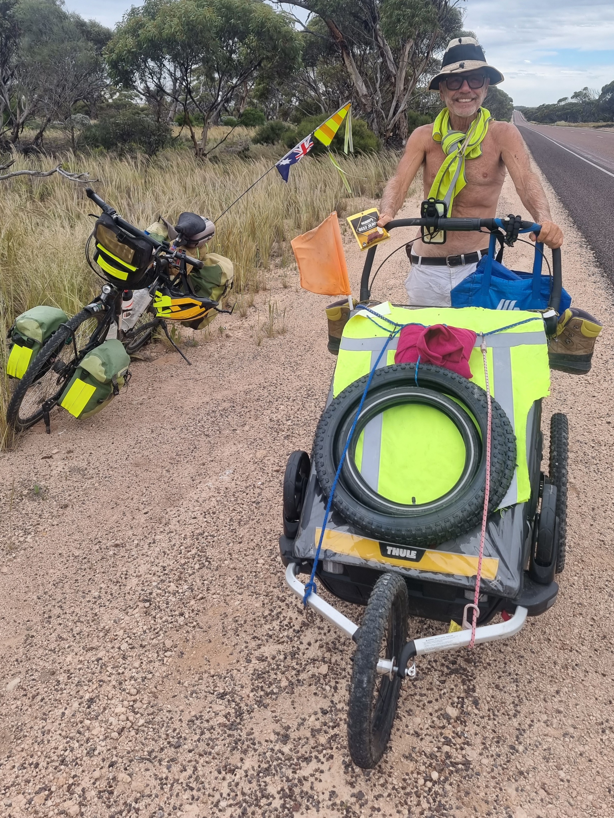 We spoke about food, water, tyres and flats. I was pleased to hear he has been the recipient of kindness from others, giving him water or food.