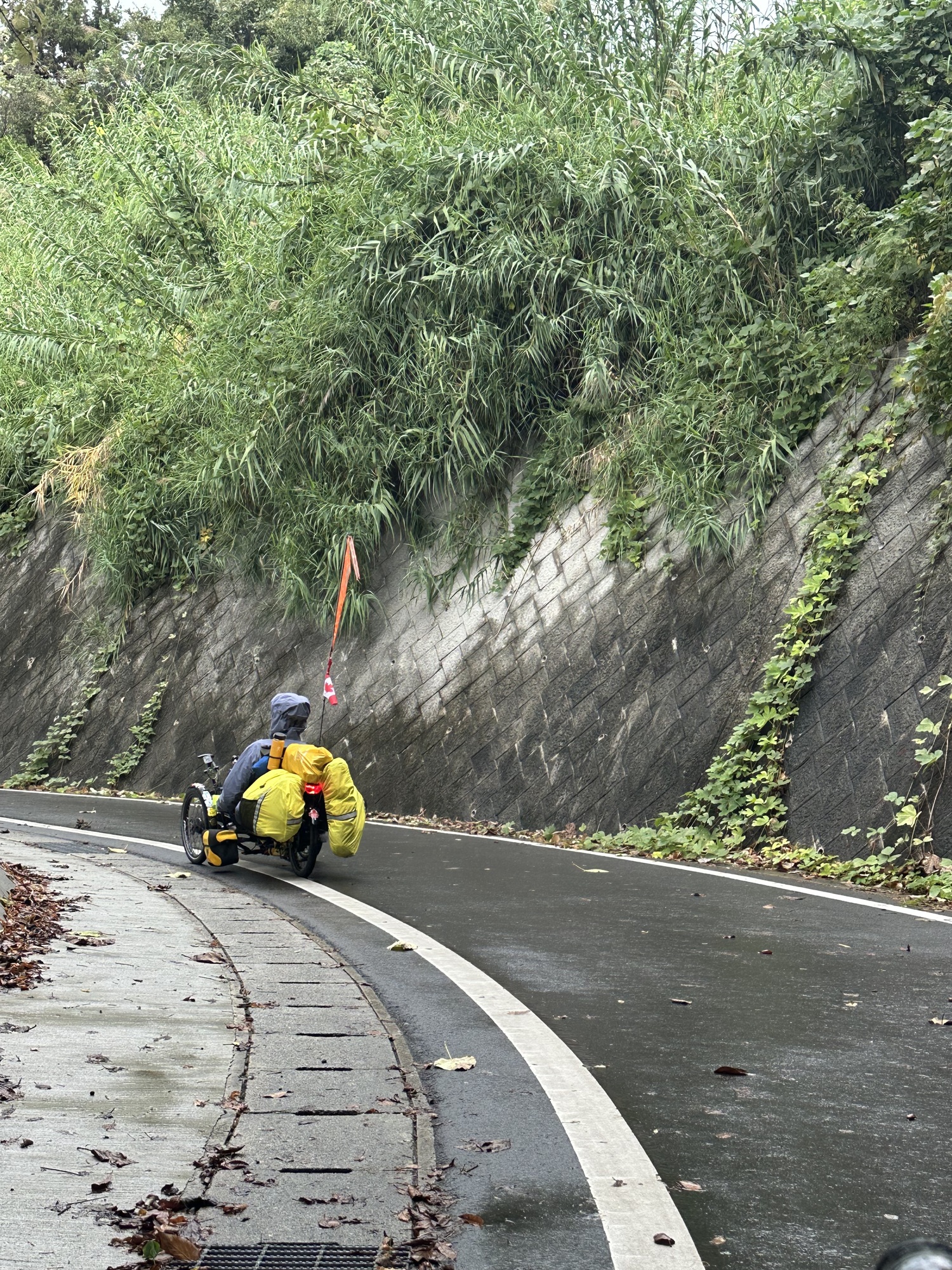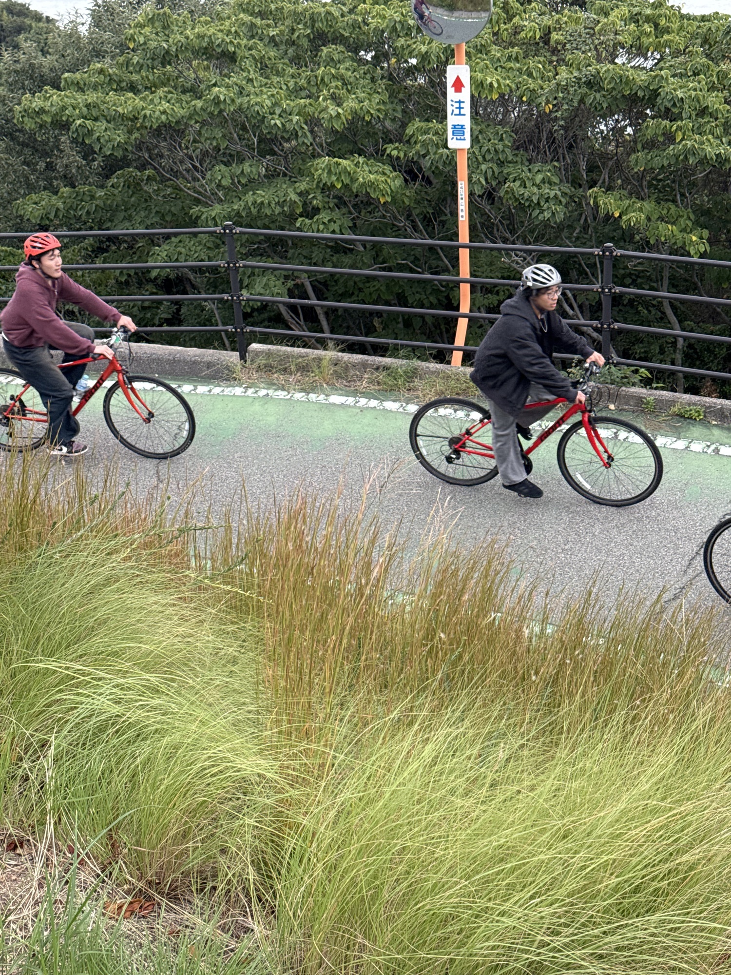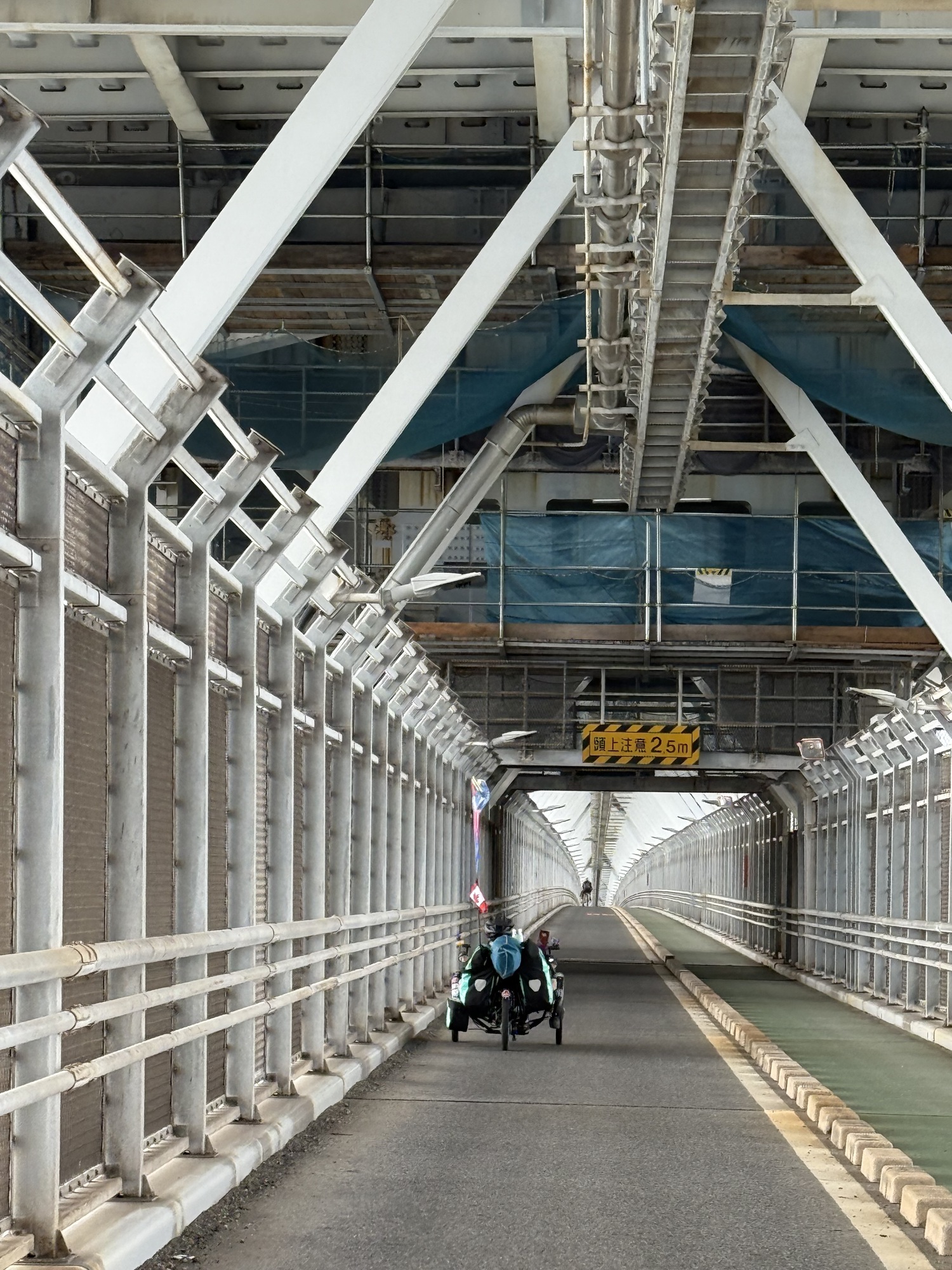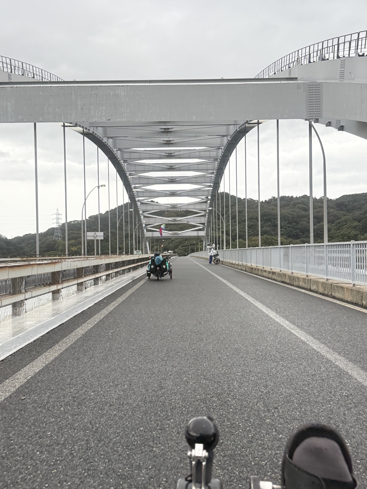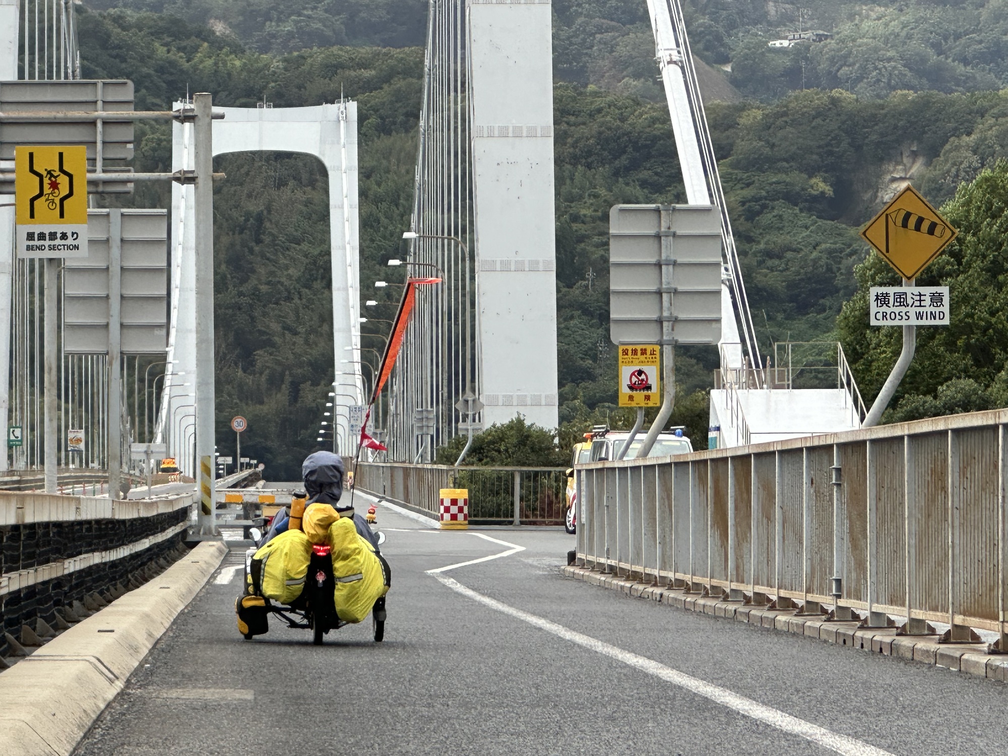 Just taking it all in. We are riding at quite a height on the suspension bridge and enjoying our surroundings…the lush hills and ocean below. Today it is very windy and the crosswinds on the bridge are quite a challenge.