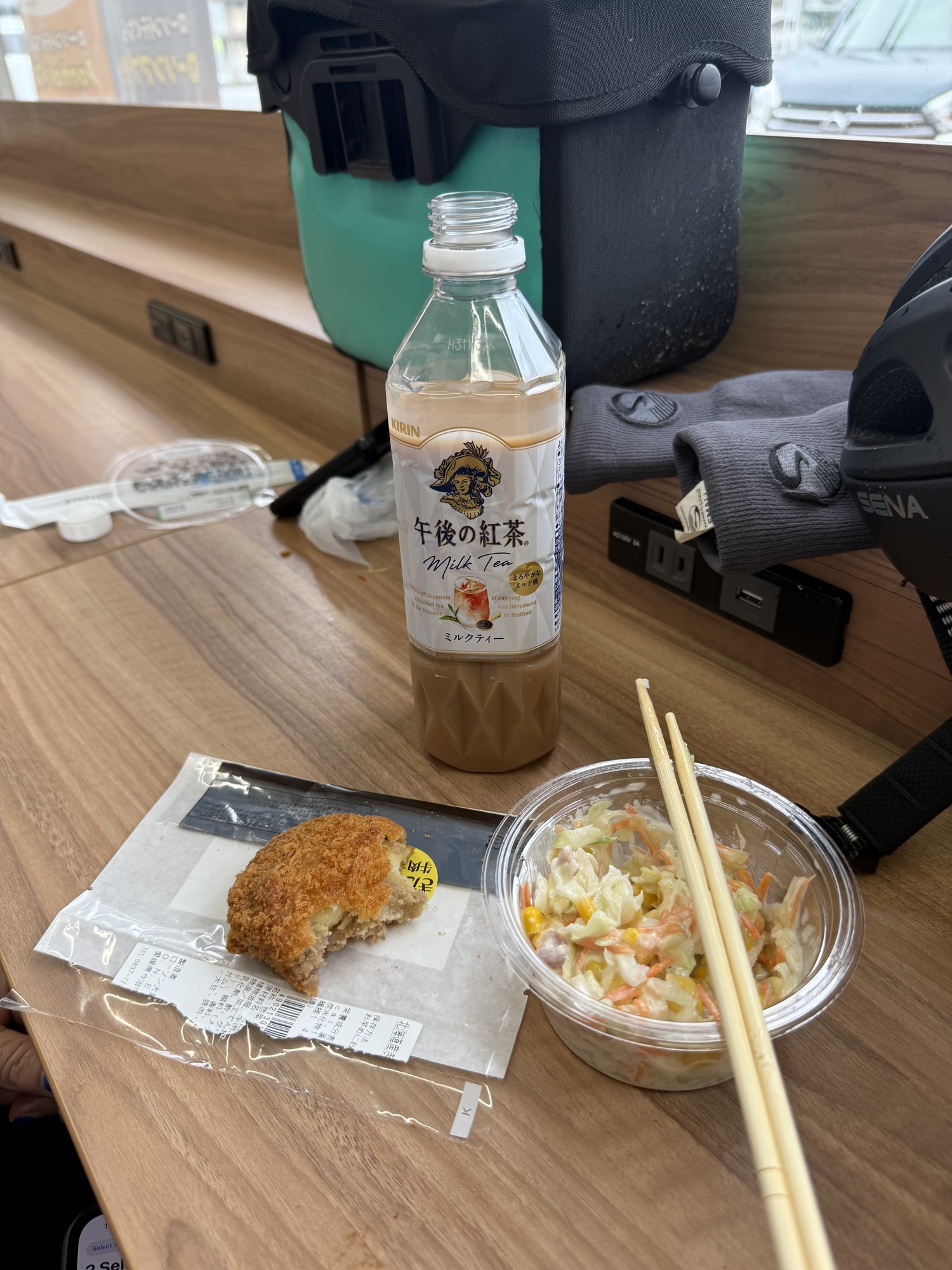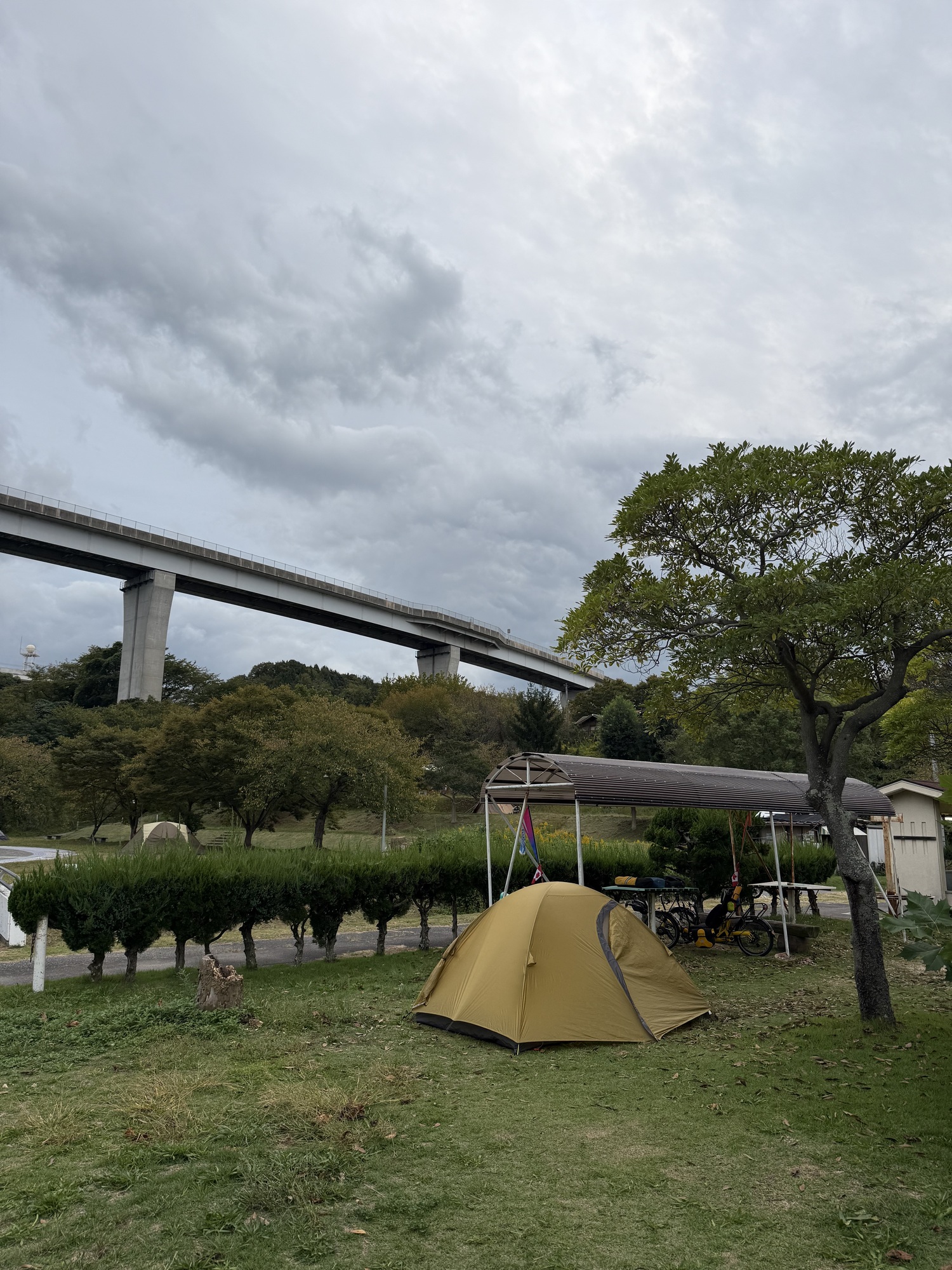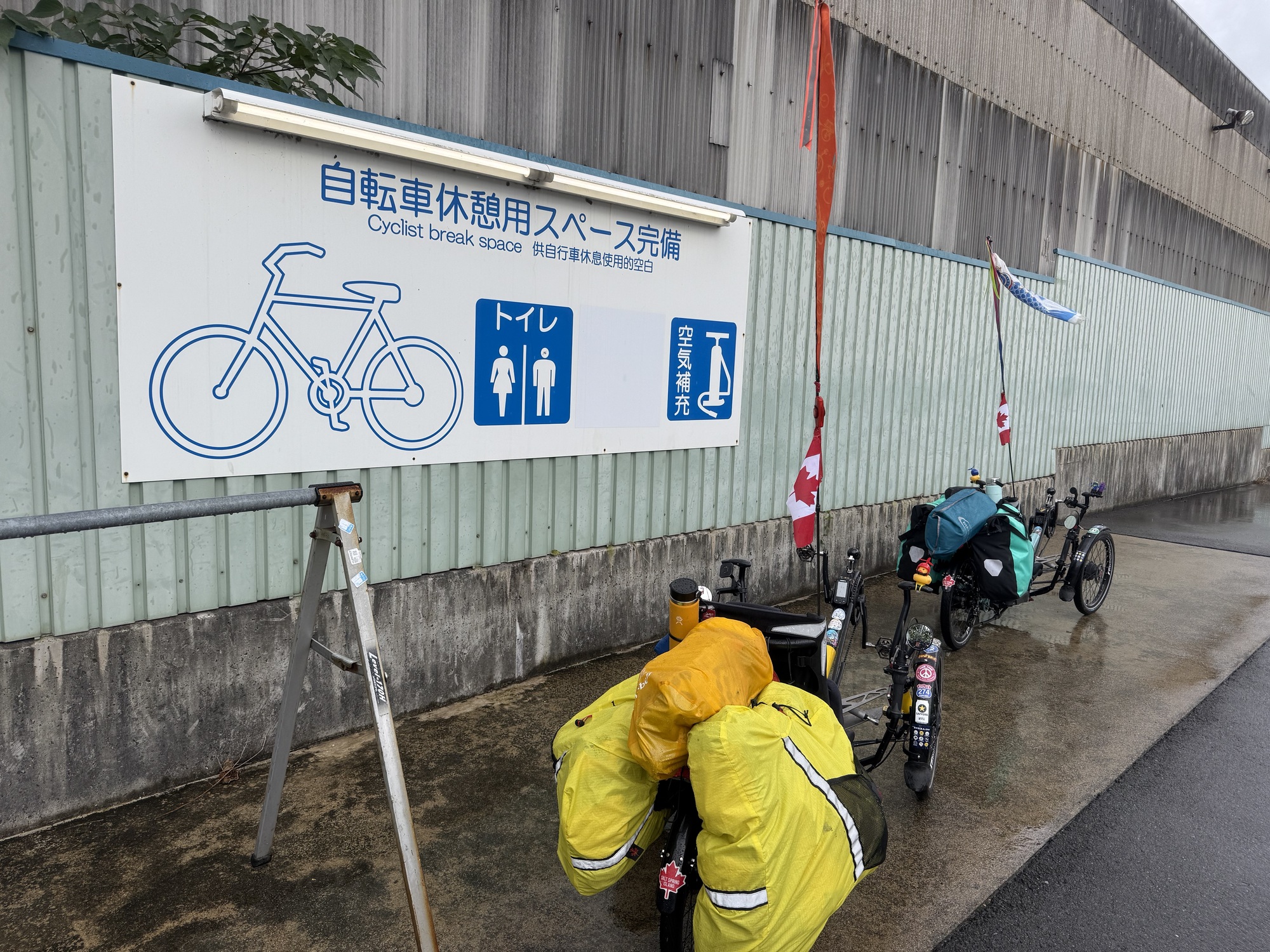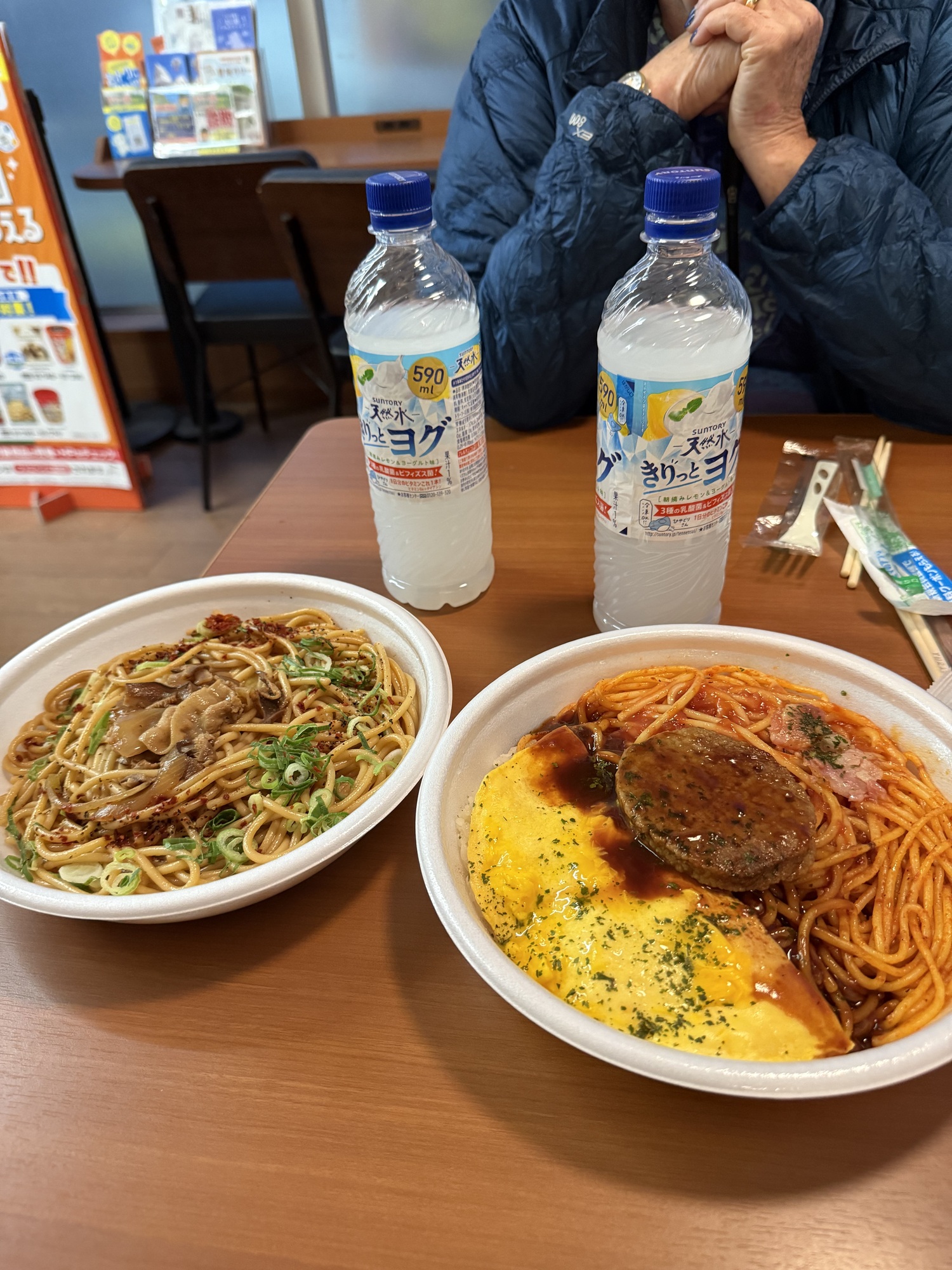Dinner at the konbini next to the campground- ME had beef with ginger noodles and B had a combo plate of spaghetti, hamburger with sauce and an omelet over rice.