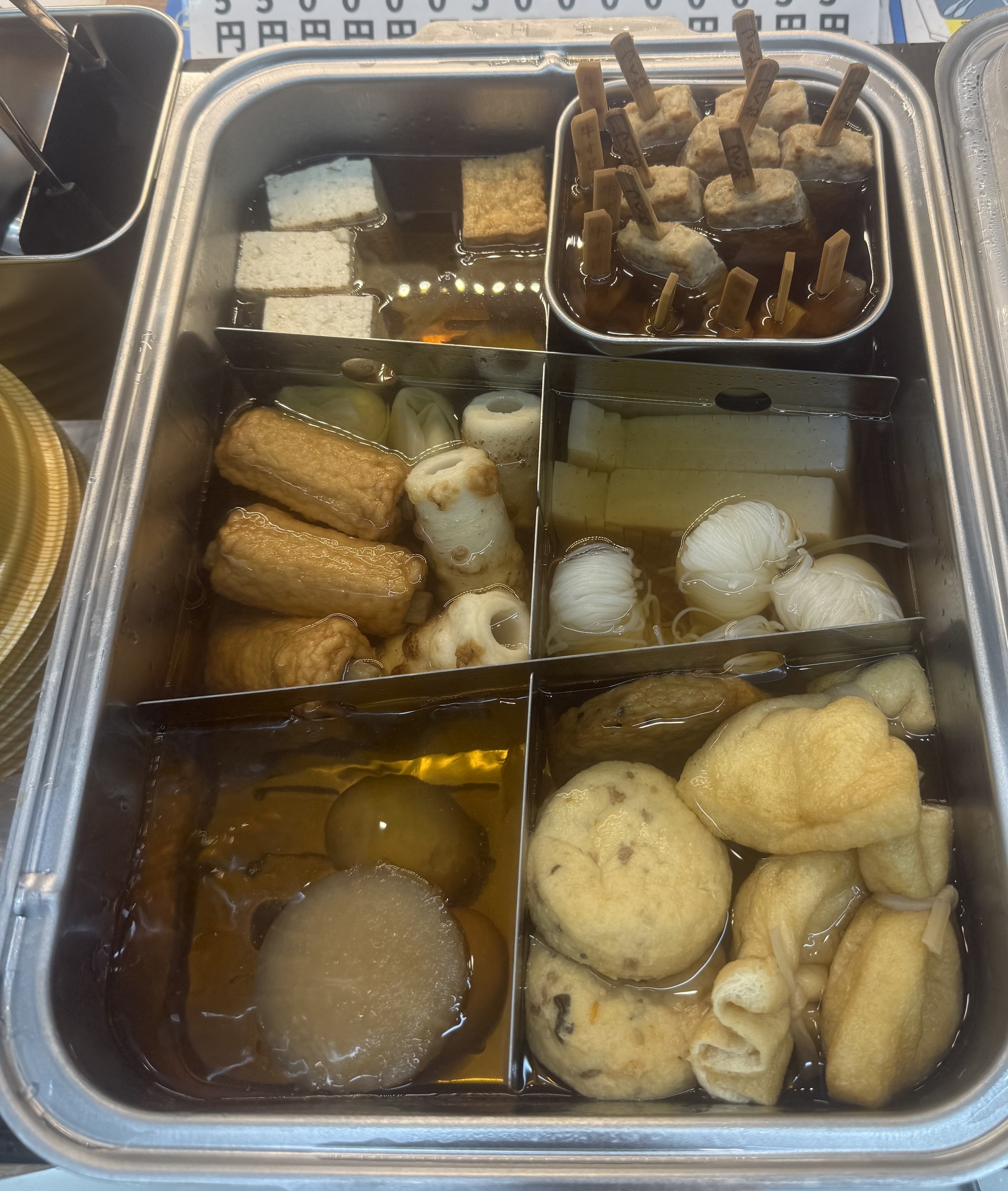 This is called Oden which is very popular. It consists of several ingredients, such as, boiled eggs, daikon and processed fish cakes stewed in a light soy flavoured dashi broth.