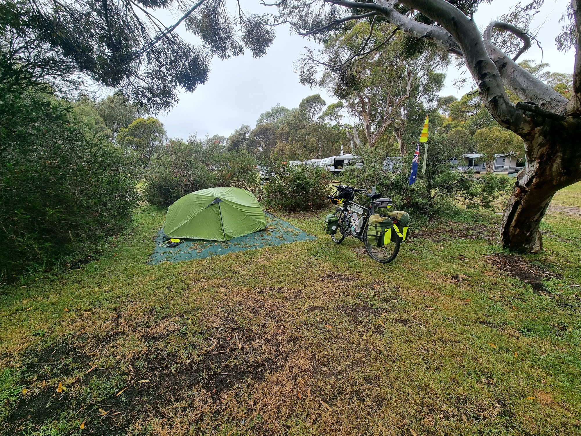 The caravan park is a few kms from the shops and from the beach. I made camp in the rain and used the laundry to dry my clothes.