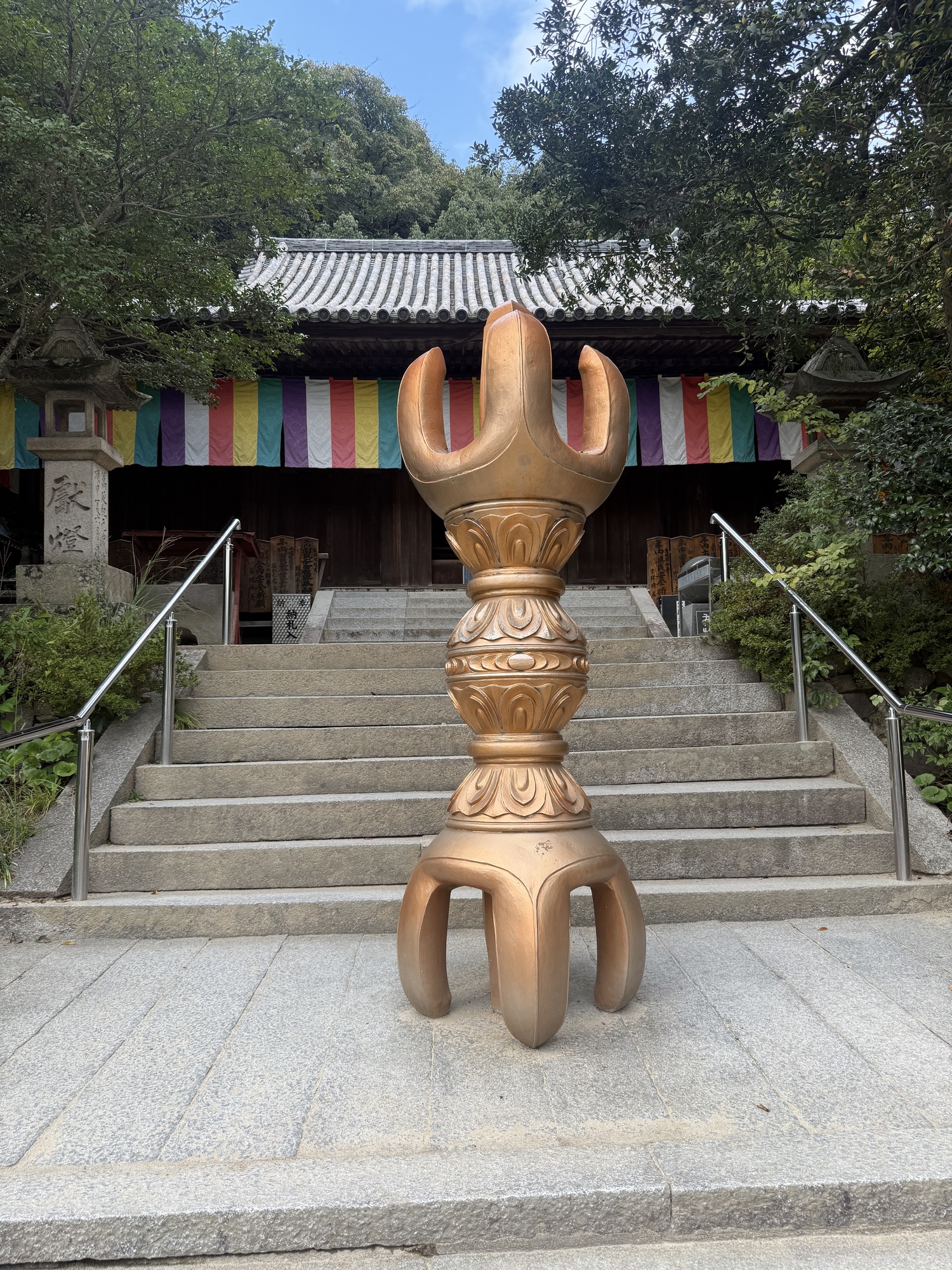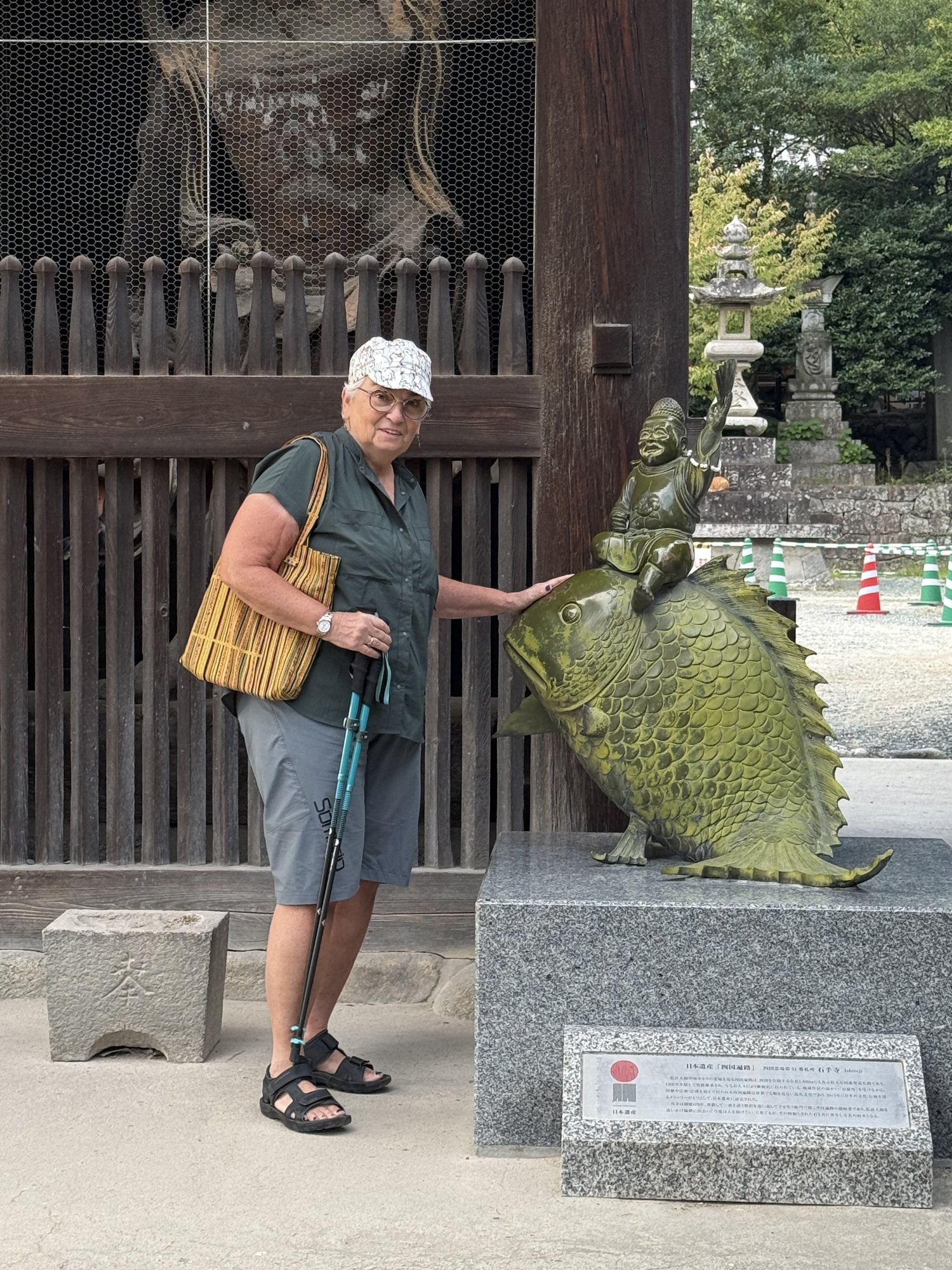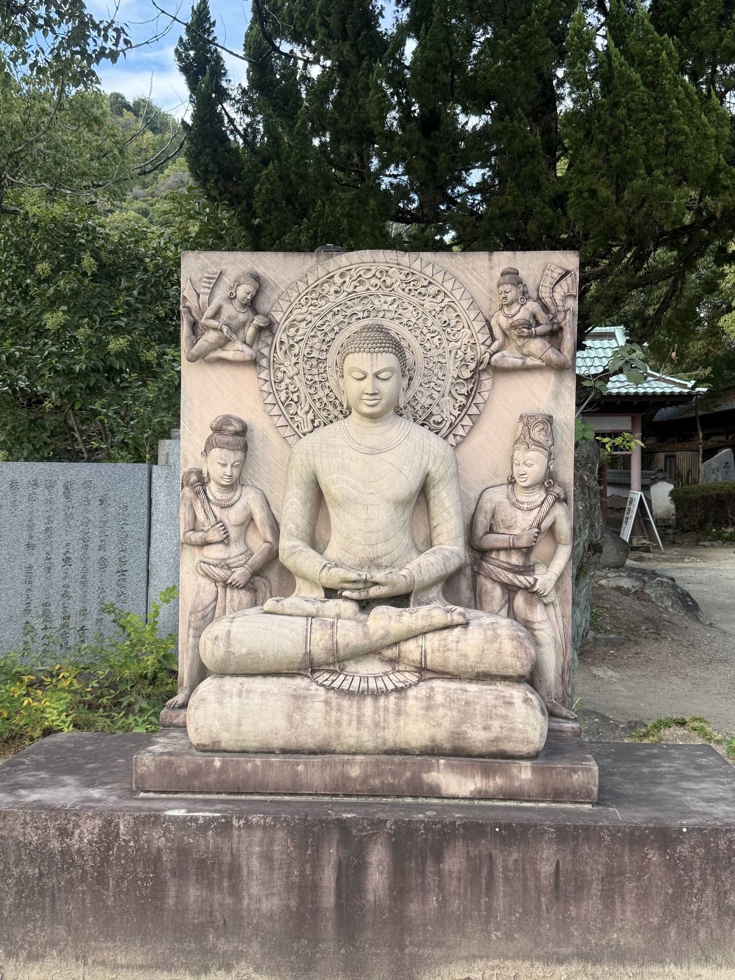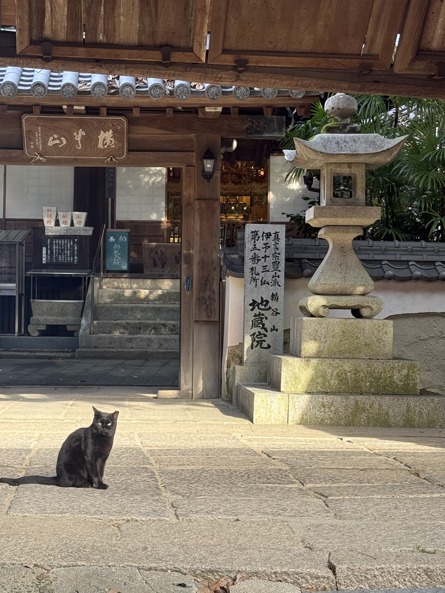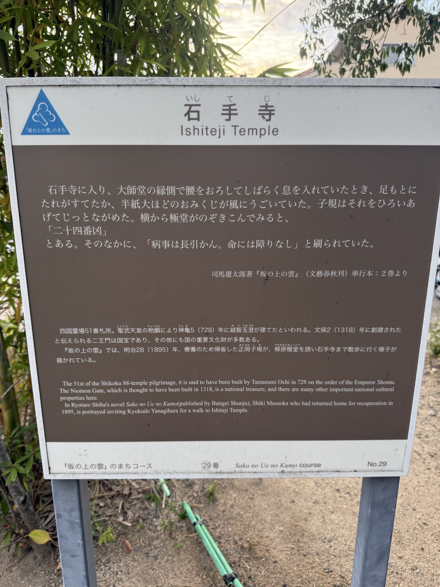 This sign describes the importance and history of the Ishiteji Temple. Of note is that it is part of the 88 Pilgrimage being #51. Its was built in 728 by Tamasumi Oche on the order of Emperor Shomu. The Niamon Gate, built in 1318 is a national treasure, with many other important cultural properties onsite.