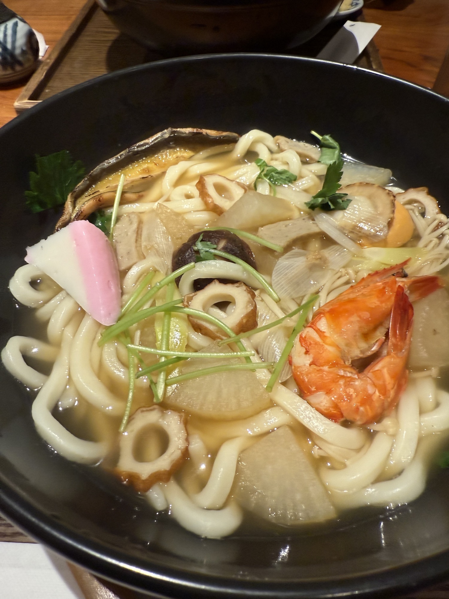 Barry chose a seafood Udon dish containing shrimp, scallops, prawns and conger eel in a fish broth. This satisfied his desire to have eel. He loved it.