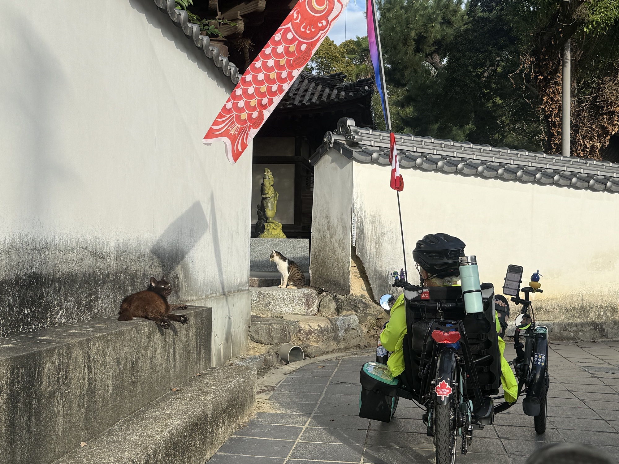 Yes, the crazy cat lady is back. This golden tabby is not so impressed by me but she stays put, tolerating me. Just a note, I bought this bike cap a few trips back in Japan…and you guessed it, it is covered in drawings of cat faces.
