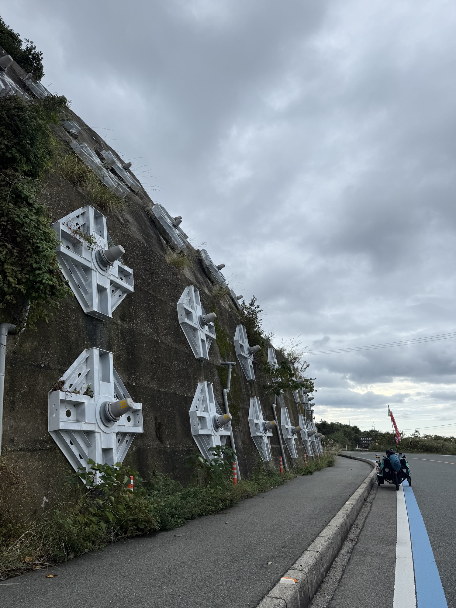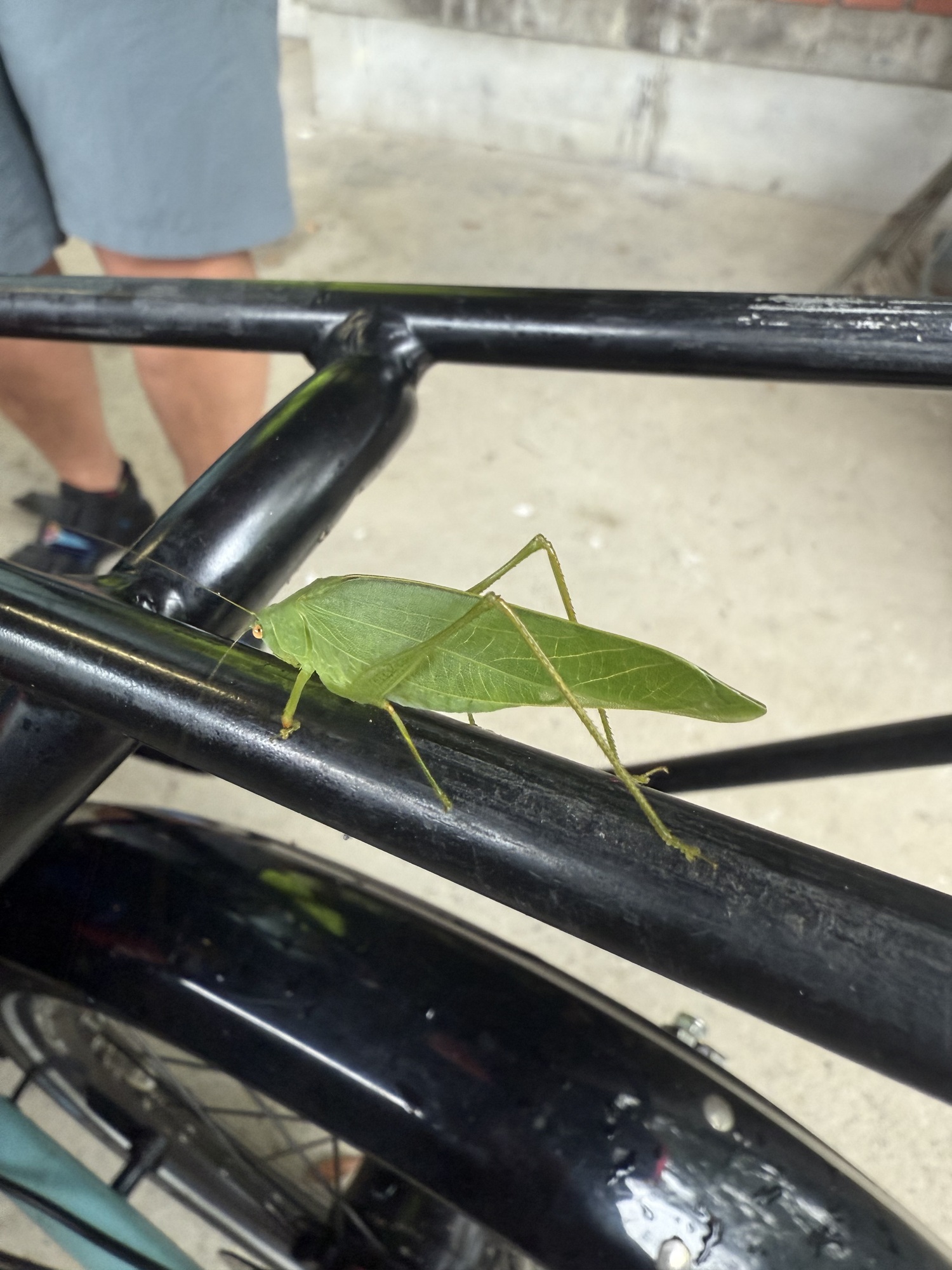 This is a Katydid who has climbed on my trike. There are 8,000 different kinds of Katydid and their distinctive features include a leaf like camouflage, long antennae and unique songs. They seem to enjoy recumbent trikes as well.