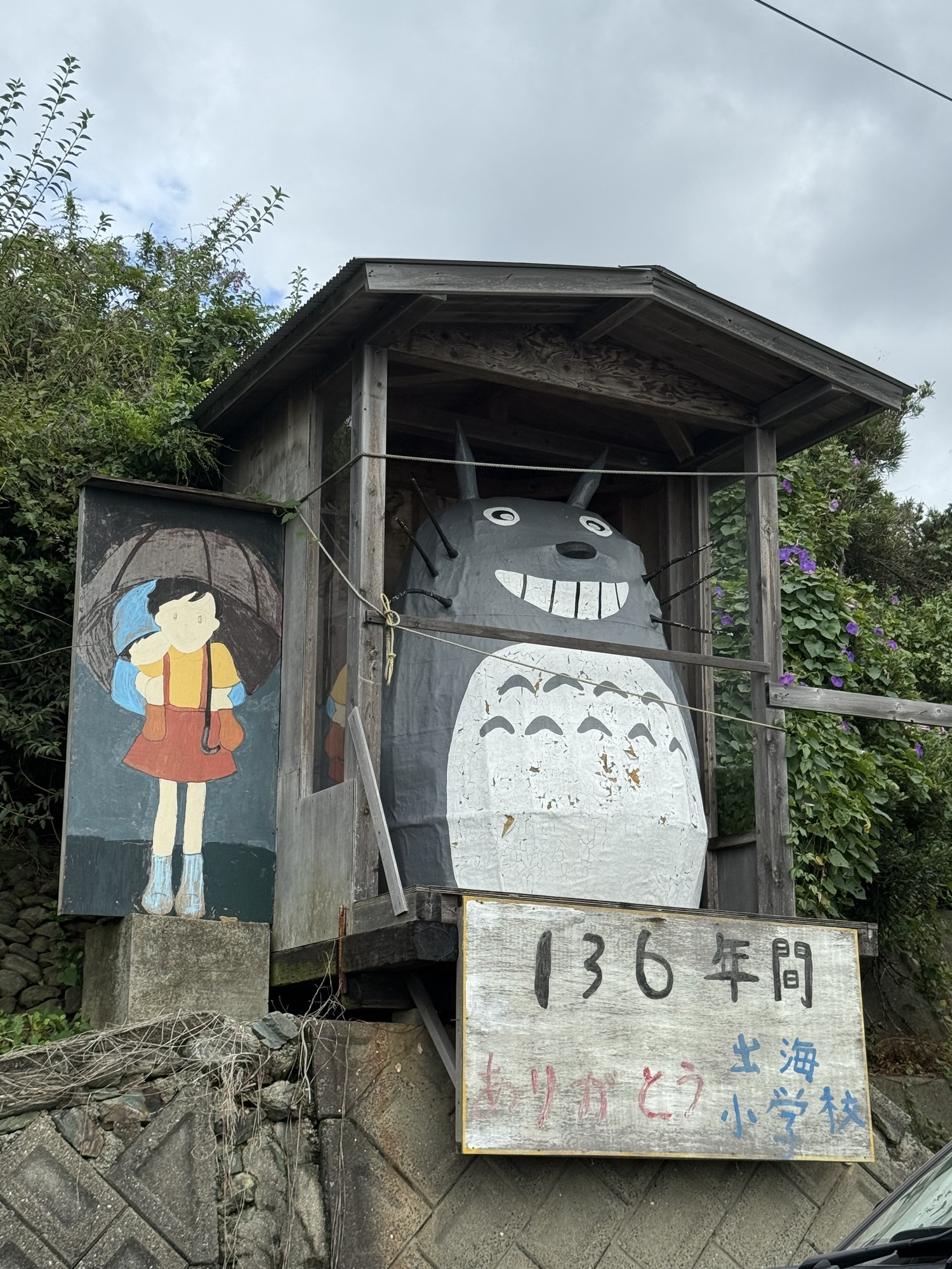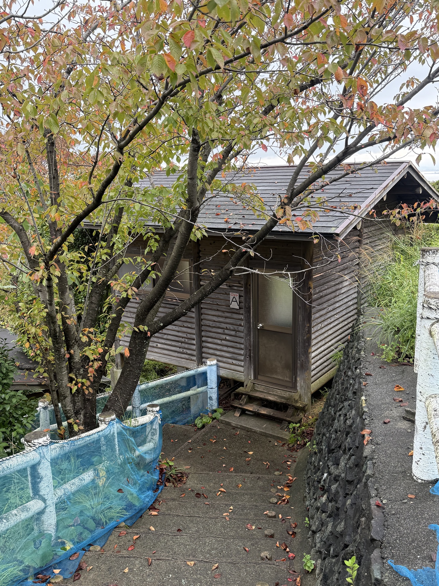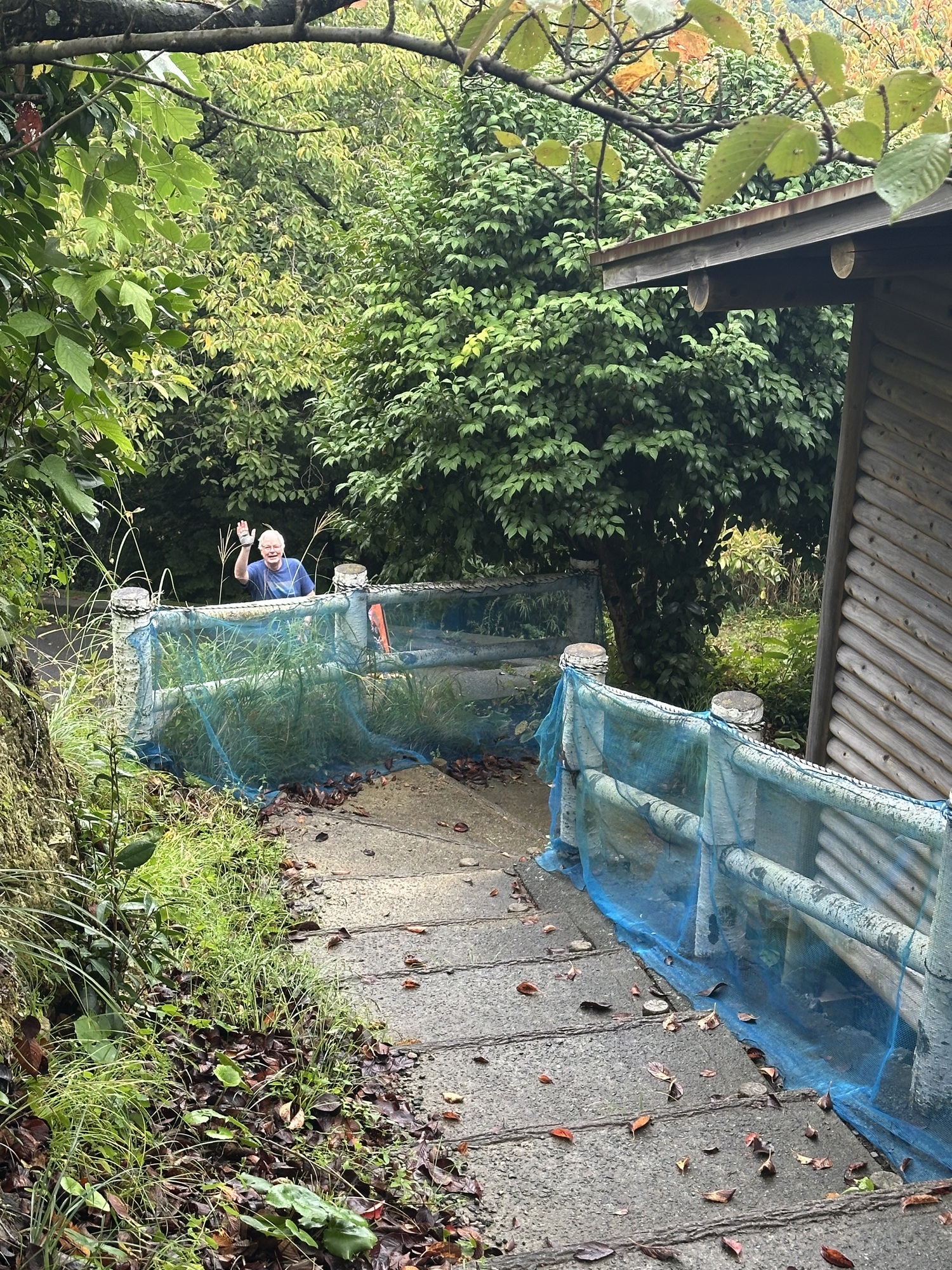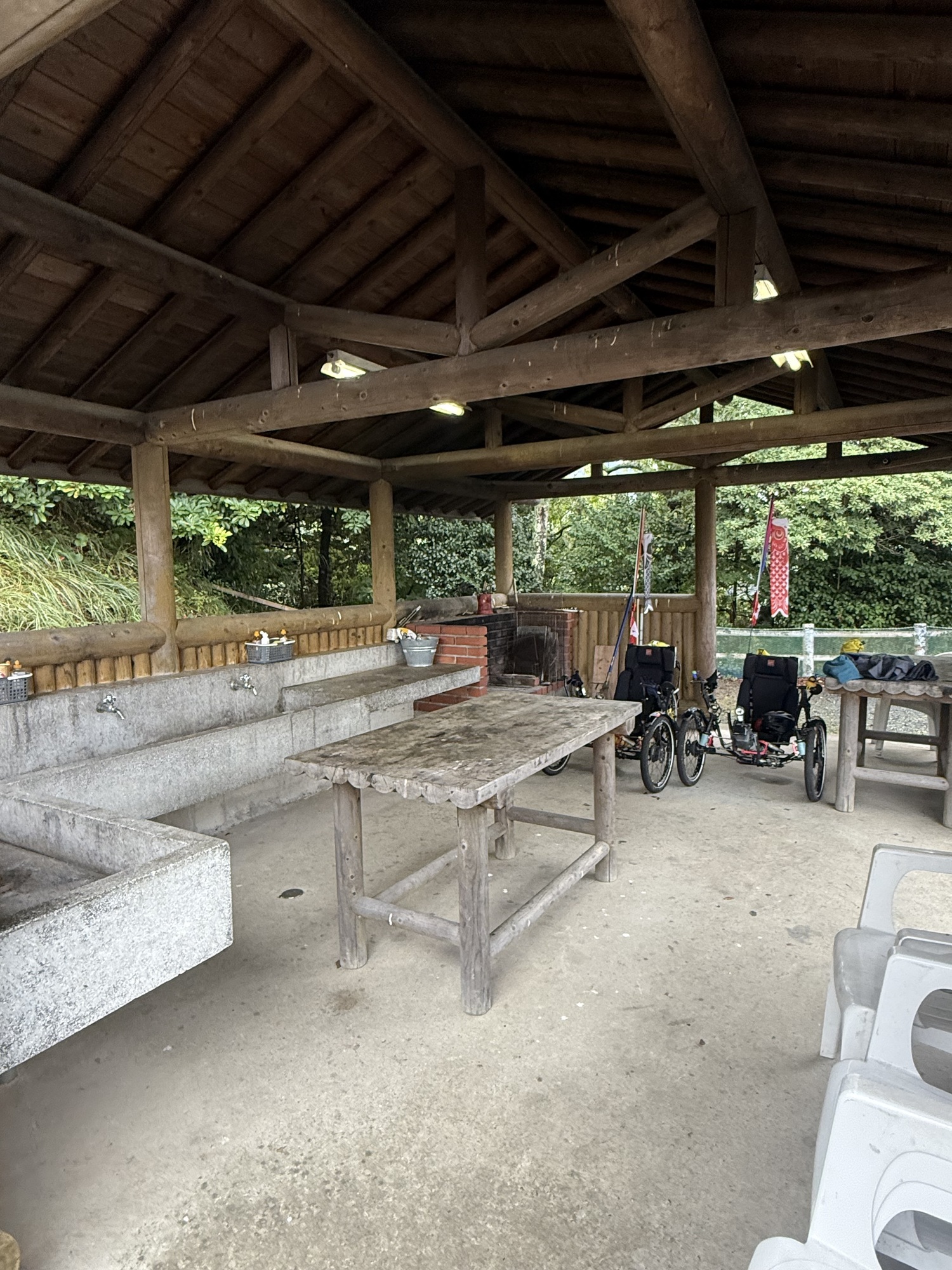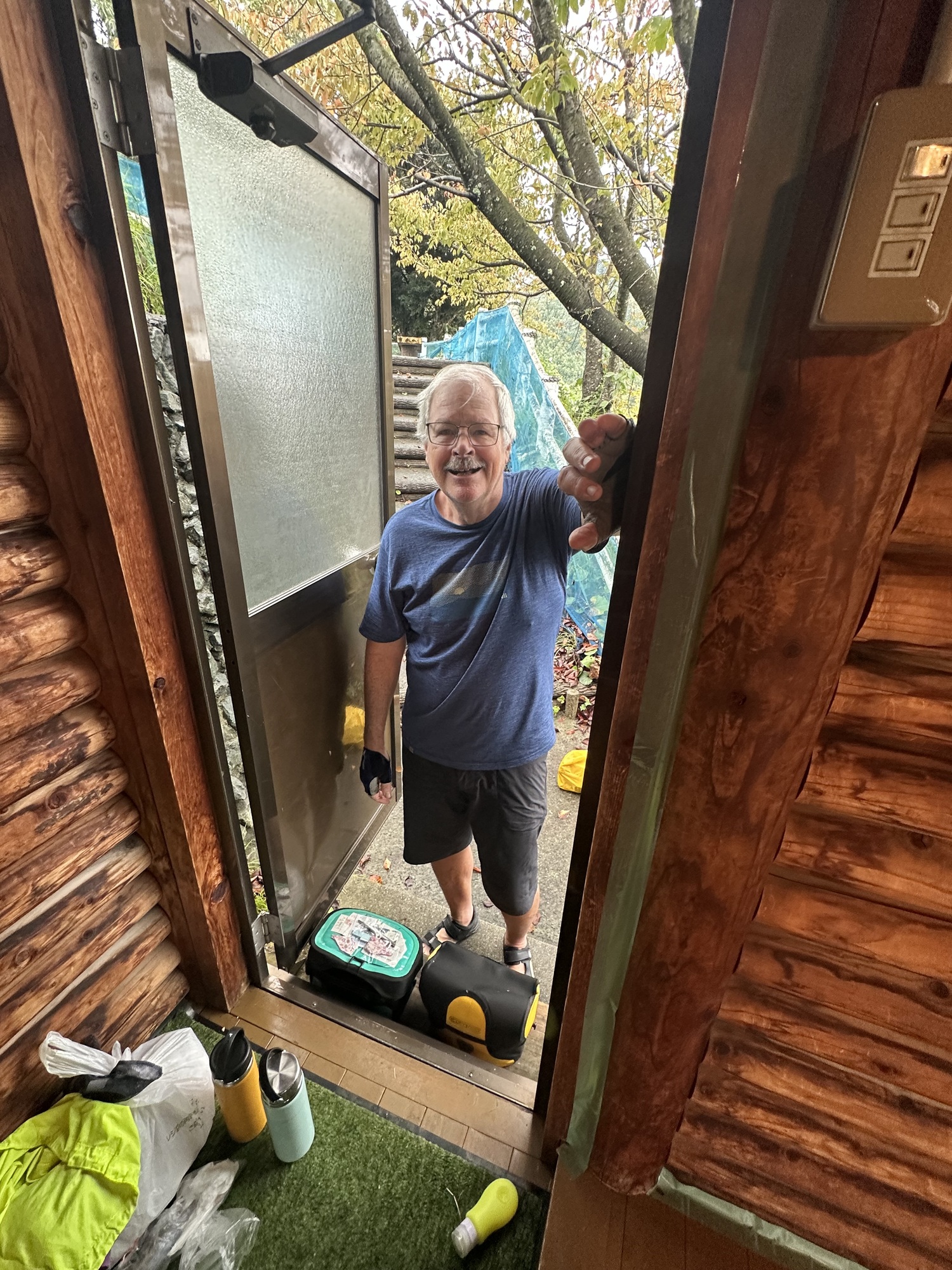 The good news is that neither of the two log cabins had been booked, so we were able to have one cabin for last night for ¥4000 (approximately $38 Cdn.) Yeah! Most of our belongings were wet, so we quickly put up our clothesline and used every possible space to hang up our wet things. We set up our sleeping mats and sleeping bags, Barry made us a hot drink…. It feels wonderful to be in a dry, warm place.