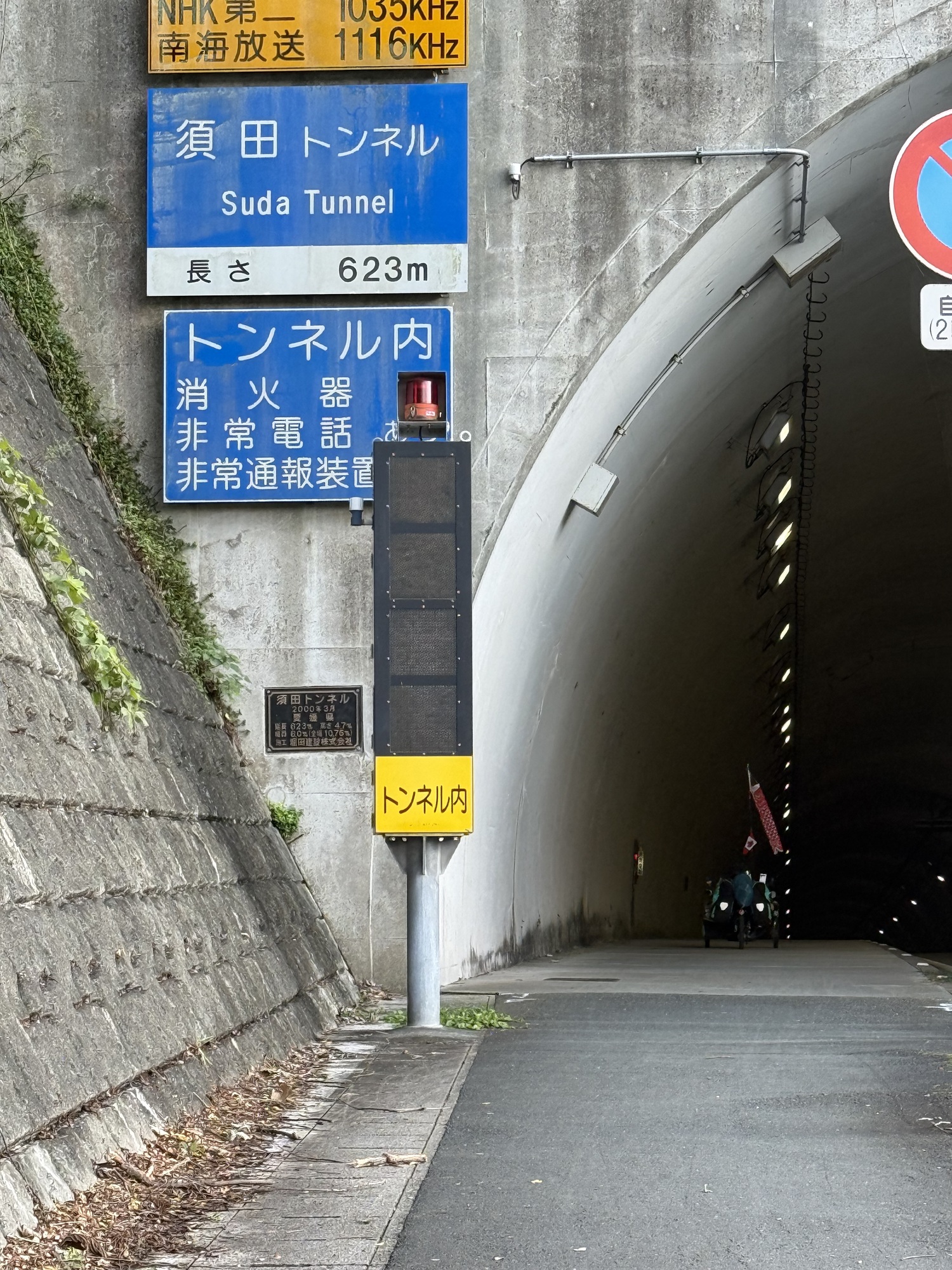 The newer tunnels have a very generous wide sidewalk for pedestrians and cyclists. This is great as we usually can’t ride, away from traffic, in the older tunnels.