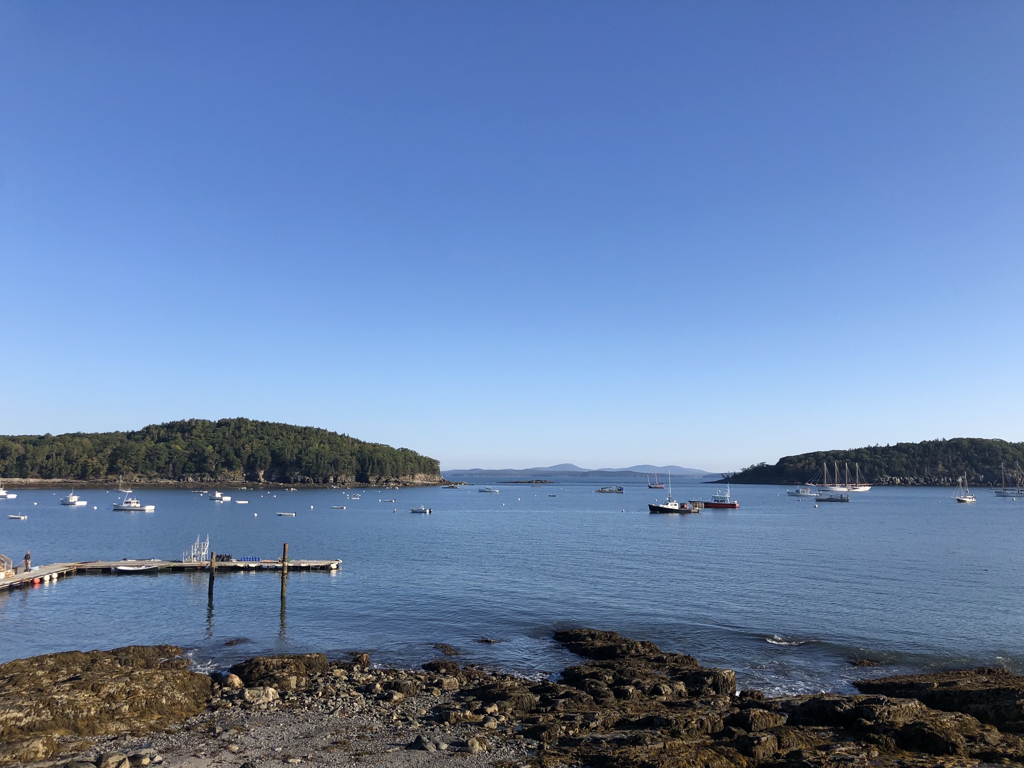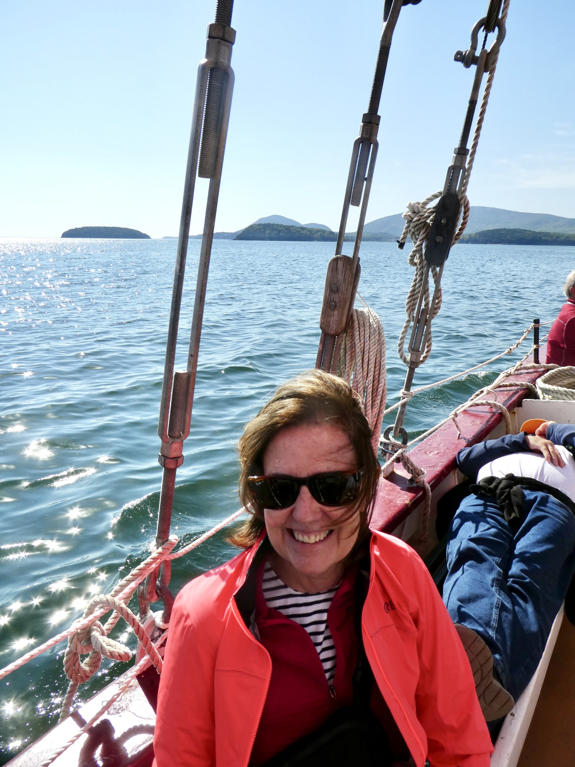 We’d cycled most of the 59 miles of Carriage Roads our first day, so the plan for our second day was a morning sail around Frenchman Bay and an afternoon of cycling new sections of the park. The Windjammer Cruise was on a 5-masted schooner packed with folks from a Princess cruise ships anchored outside the bay. Cruise ships remain a sensitive topic in Bar Harbor – welcomed by Main Street, but disfavored by residents. Their numbers have been greatly reduced in recent years, both in the number of ships as well as passengers per ship. Nonetheless, it was a bit of a shock to Ann and I when we came ashore after our cruise and found swarms of tourists overcrowding the streets, shops, and park benches. We escaped to Acadia for more cycling, covering almost all of the remaining Carriage Road network. And we scored a great meal at dinner – I opted for halibut rather than lobster and had no regrets.