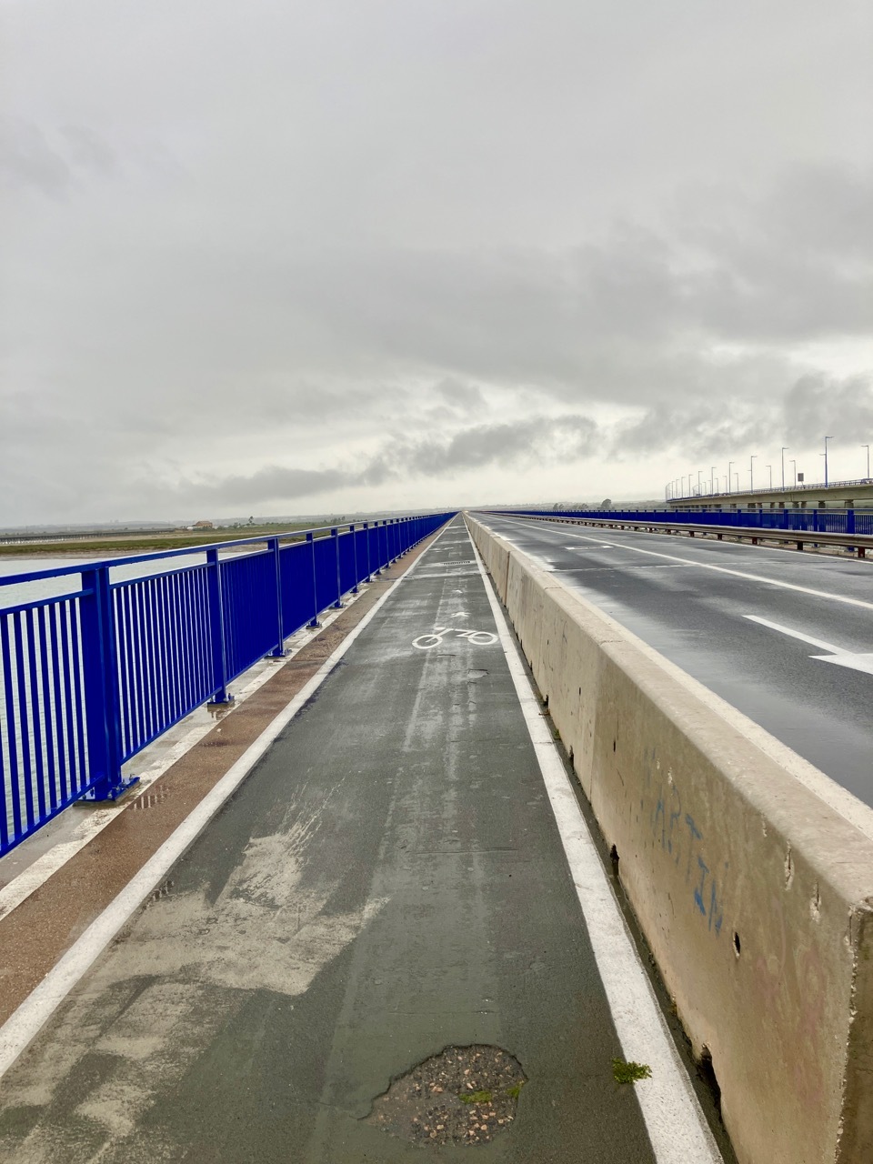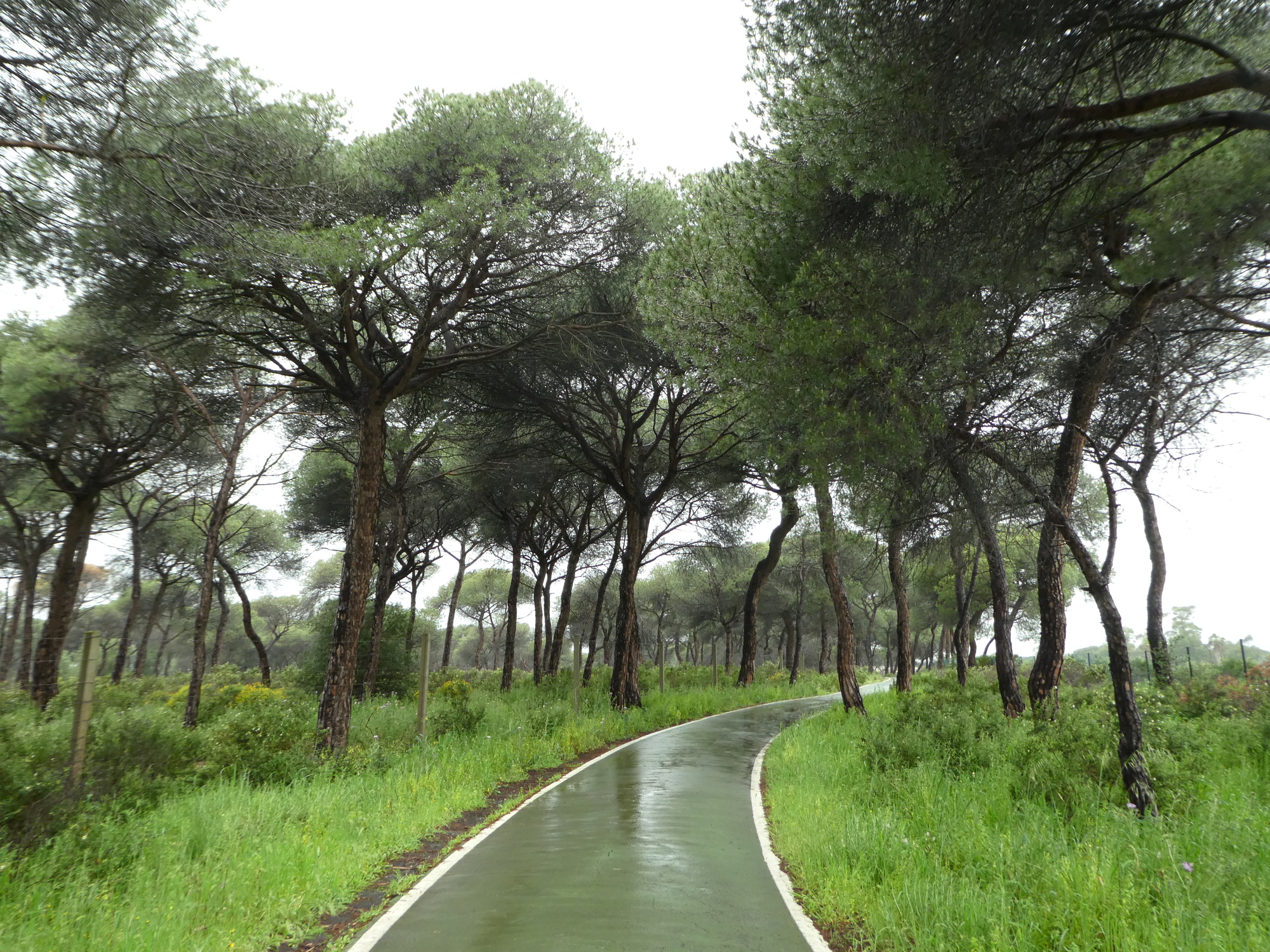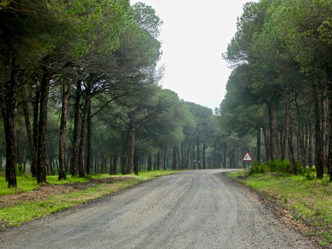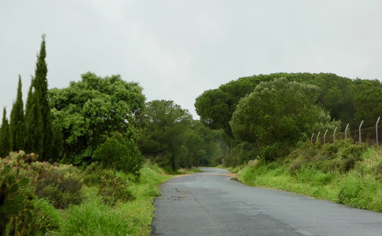 Once through Aljaraque, I picked up a small rural road and was feeling quite happy, though I did note that RWGPS indicated a short-ish unpaved stretch ahead. Sure enough, I soon found myself on a wide gravel road, one that would be easily navigable in dry conditions but was a bit slippery today. I managed to stay in the saddle, and slowly made my way through a peacefully wooded landscape with nary a sole in sight, save one man who was walking and carrying an umbrella. After a couple of miles, I came to a junction – decision time. A graveled road ran at right angles to my route, whereas my track ahead seemed to deteriorate into a path. The gravel surface would be easier and faster, but would add a few miles to an already long day. I didn’t hesitate long – the gravel road it was. Another three miles wonderful miles of quiet woodland and I was back on pavement, turning north in the direction of Cartaya.