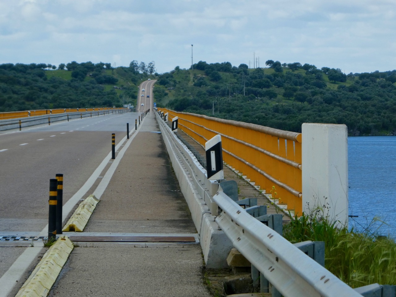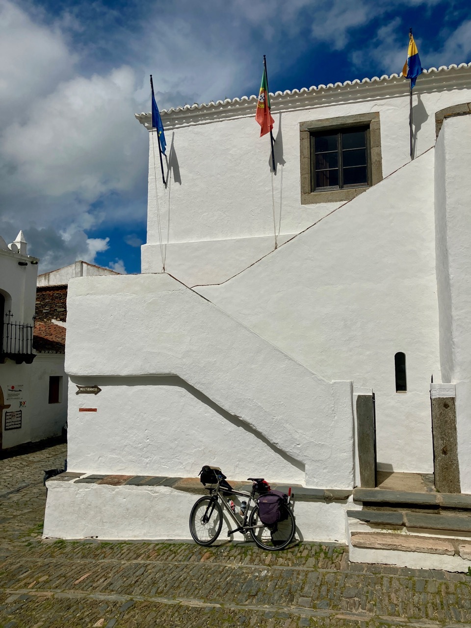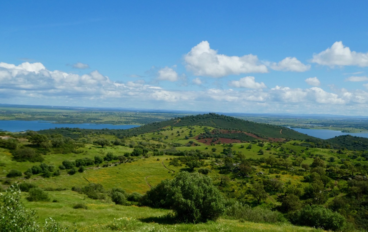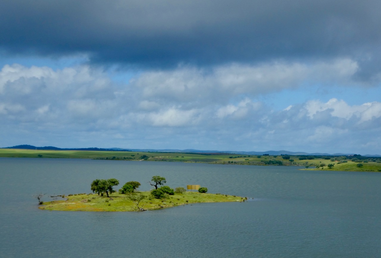 The next twelve miles north to Maurão were a mixed bag – internal misery countered by uplifting scenery. First, the good news. The gently rolling terrain, lush landscape and quiet, well-surfaced road made for an outstanding ride. I passed across sections the Grande Lago Alqueva, the largest man-made lake in Europe, a reservoir formed by “impounding” the Guadiana River. The bad news was that I was feverish, alternating between being too hot and too cold. A cloudburst hit a few miles outside of Maurão had me limping into the city, wandering through narrow, one way alleyways that are characteristic of many places in Portugal. I didn’t find the hot coffee and pastry I was seeking, but did find a sunny spot in a small park where I nourished soul and my stomach with my picnic sandwich.