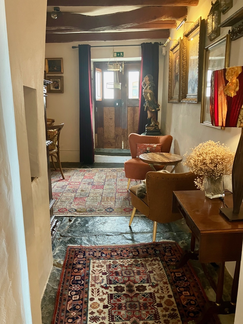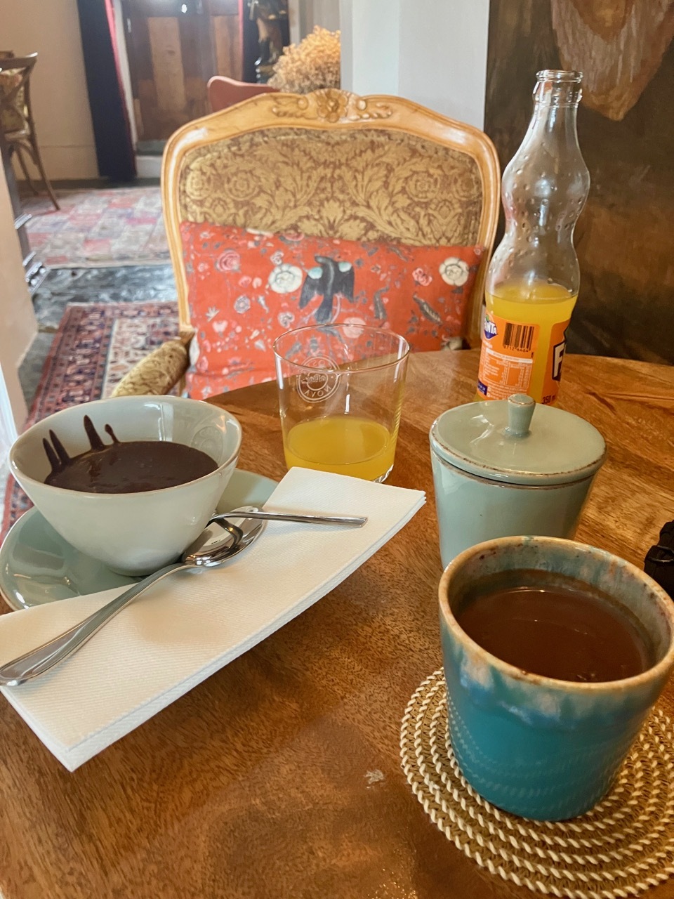 After a brief rest at the viewing area, it was one last push up the cobbles and into the city itself. I arrived to blue sky and brilliant sunshine, but 45 minutes early for check-in. Too drained to explore the town, I parked Vivien George and myself in a warm, sunny spot across from my lodging. It was bliss -until a chill wind brought in a new cloud cover. In search of something warm, I happened into a cozy and inviting coffee shop, filled with upholstered furniture and cats. I scanned the light menu, not knowing what among the offerings would satisfy my many cravings – thirst, warmth, sweet, savory? I ended up with a decadent selection of Fanta, hot cocoa, and chocolate mousse. I guess the chocolate craving won the day.