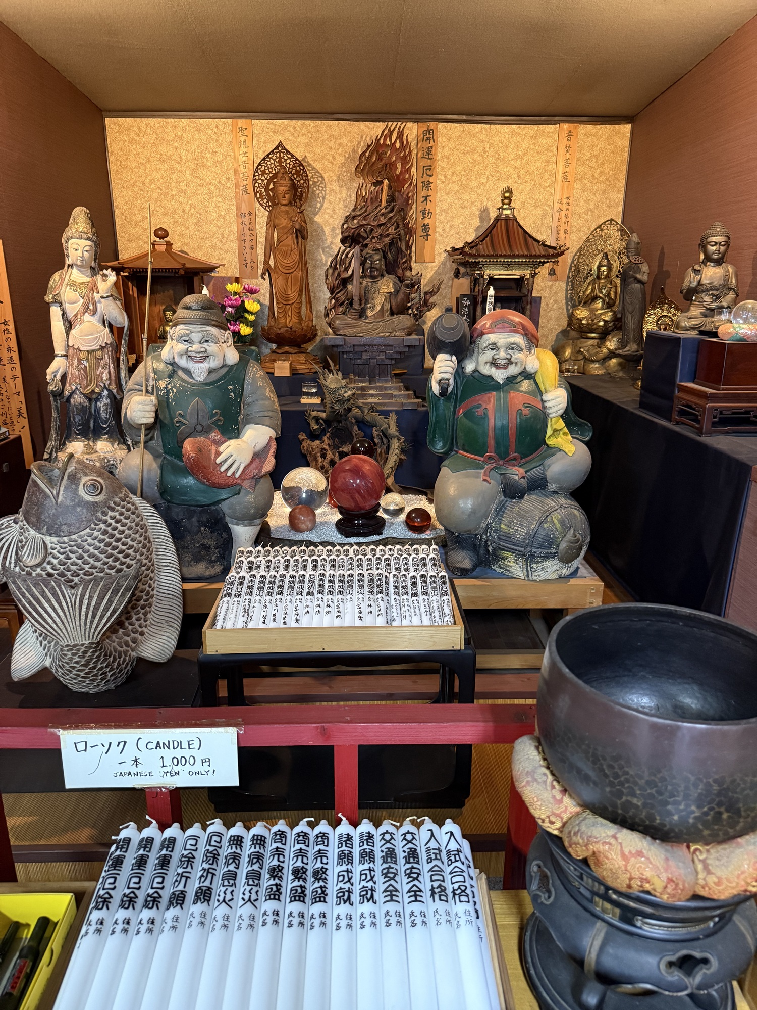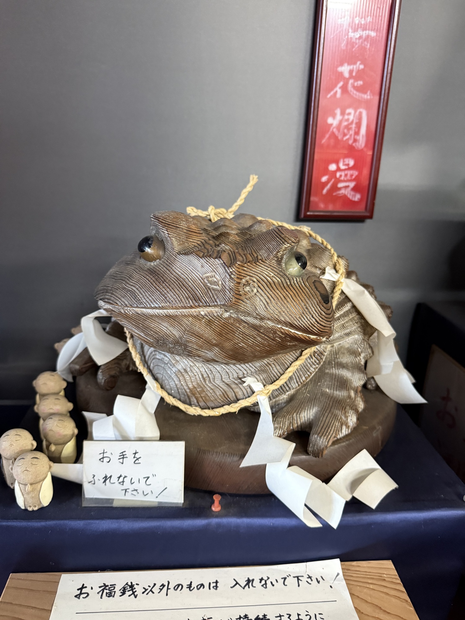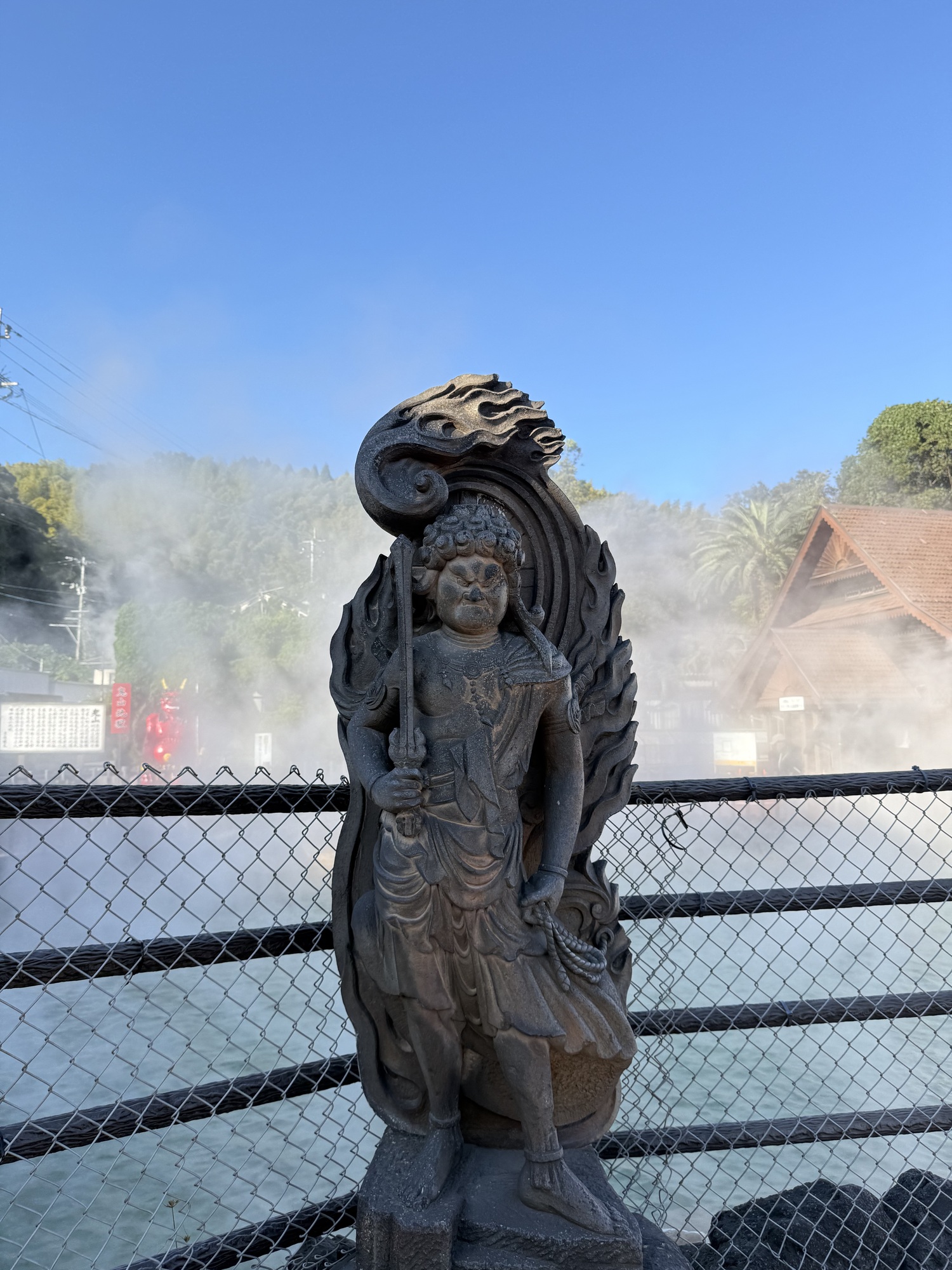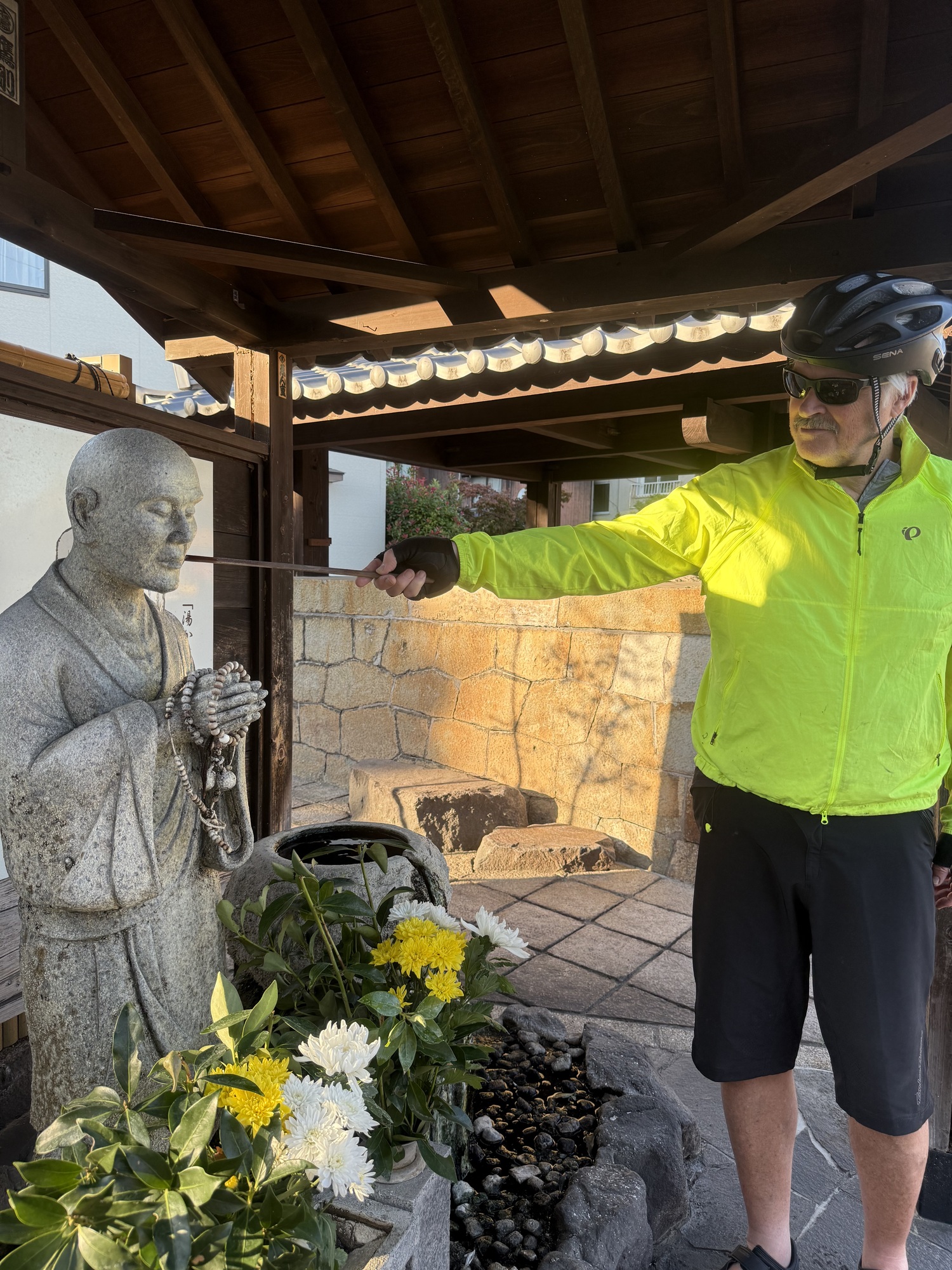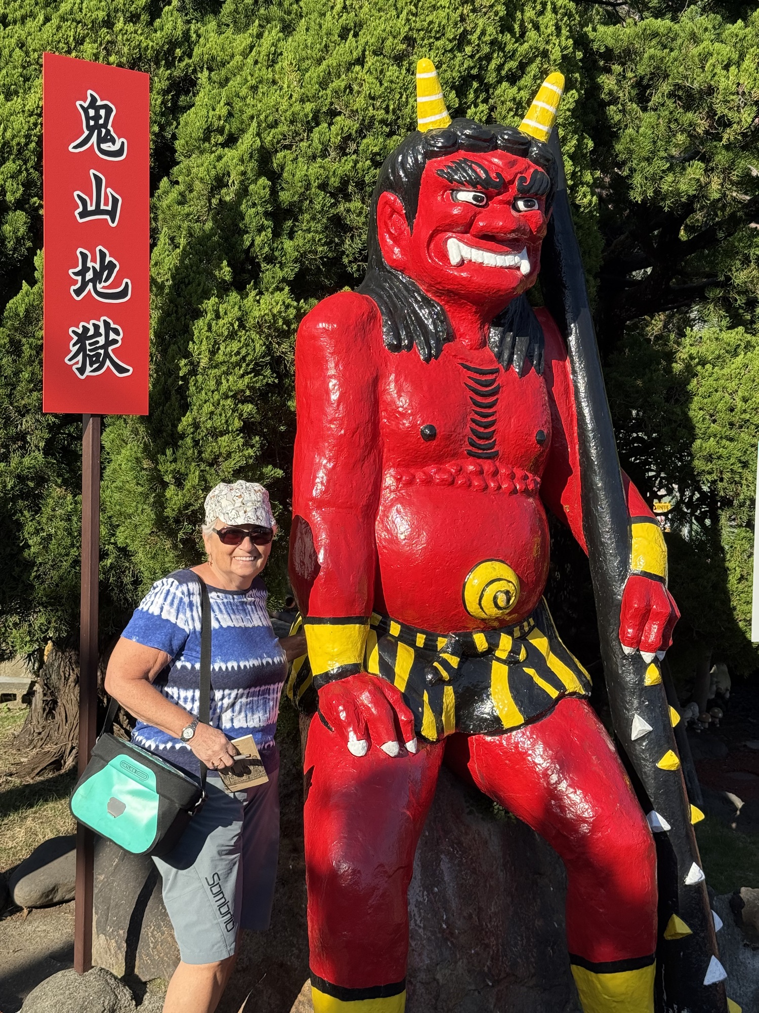 This statue of Ippen Shonin is in front of the Kannewa Mushiyu Steam Bath. You are invited to pour hot water over the statue where you feel pain in your own body. It is said to give relief…so Barry gave it a try. The monk Shonin arrived in 1276 and turned Kannewa followed by the whole of Beppu from a volcanic wasteland into a thriving hot spring town. Precious to this, it was a very dangerous place. He sank stones into the ground to stabilize it, channeled the flow of hot water and put it to use. Despite the commercialism of modern day, we can imagine he would be proud of the success of his work centuries later.