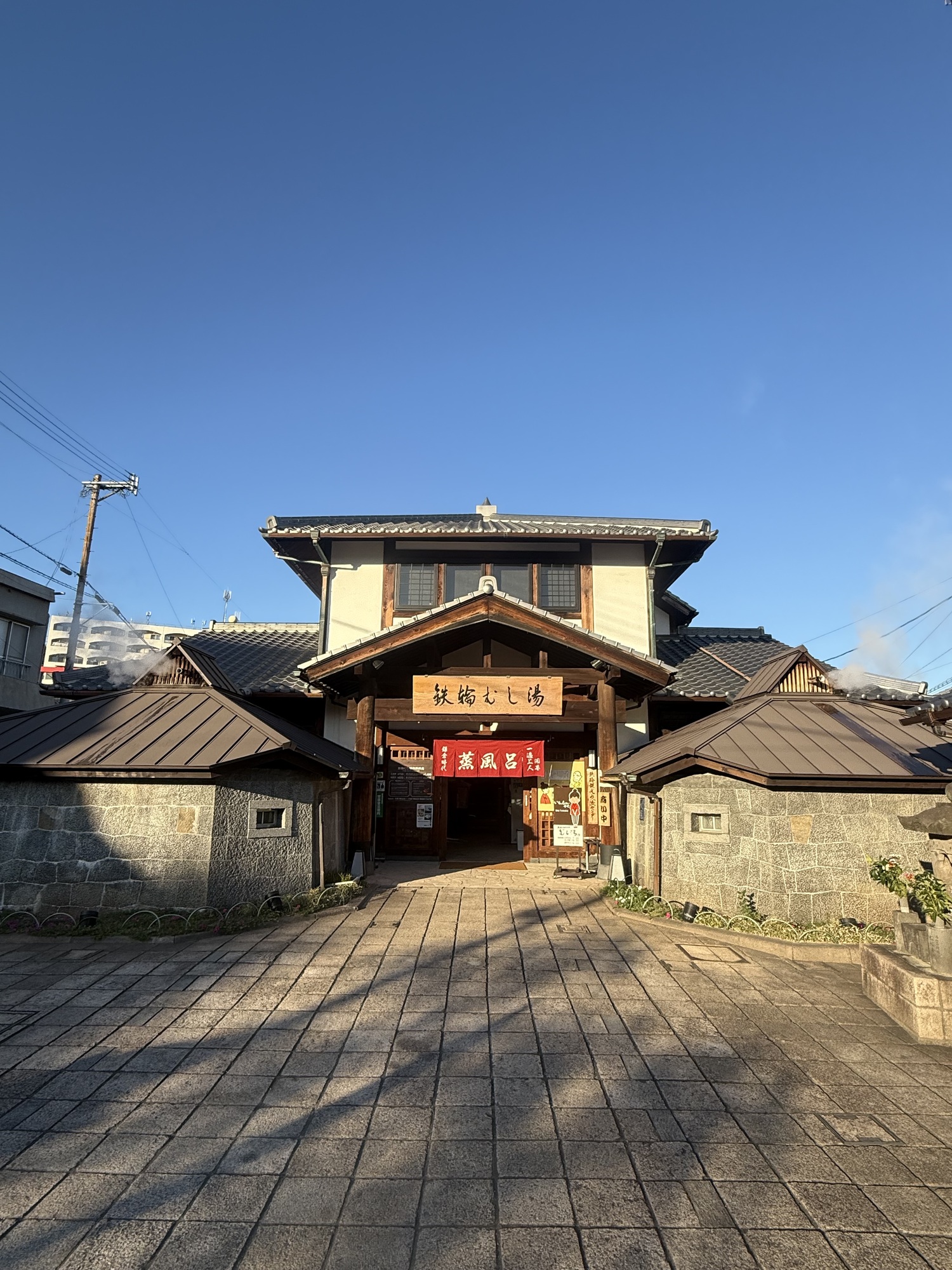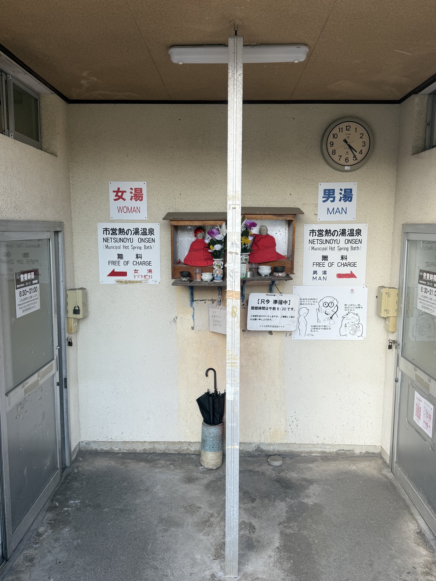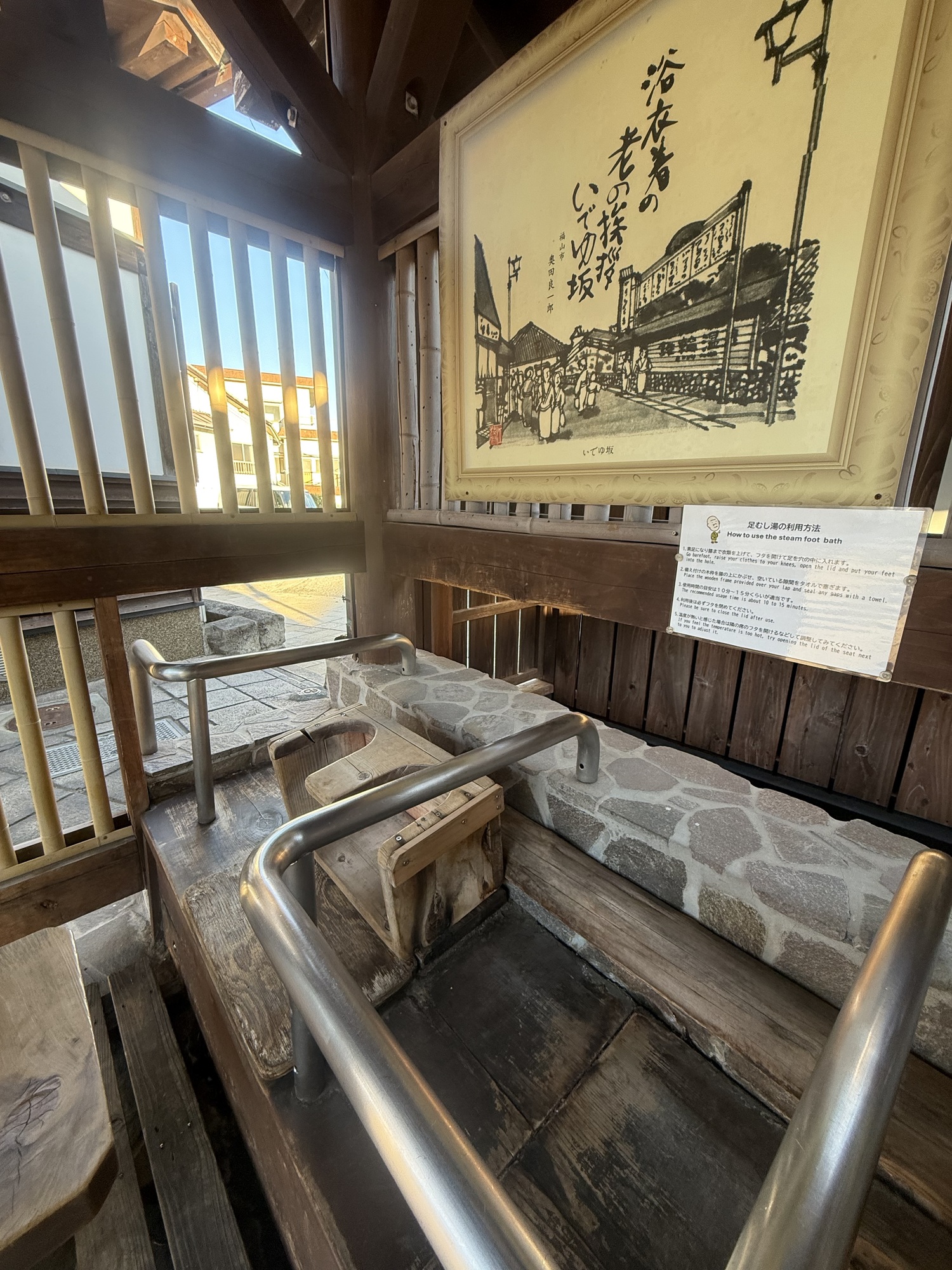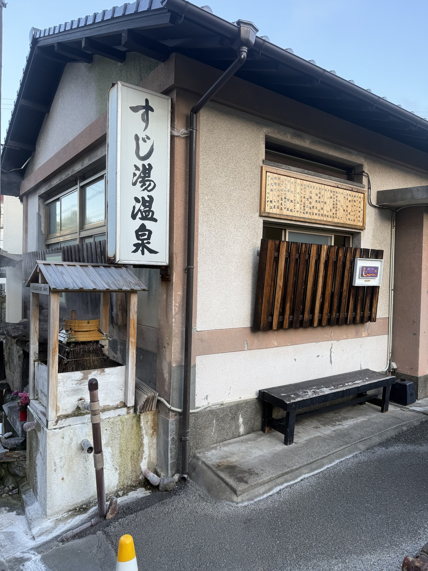 This is our final stop of the day. We are planning to visit this Onsen which is a steam bath. The two small sections at the front are separate areas for men and women. Only 3 people can fit in the area at a time and you are restricted to 10 minutes max.