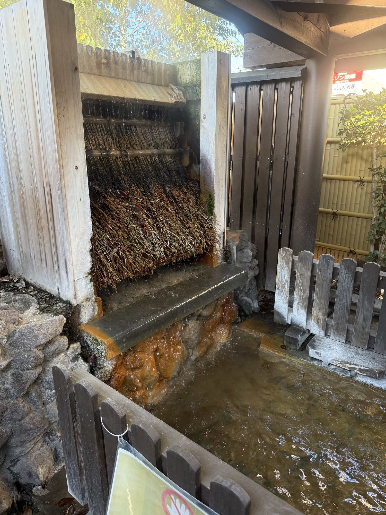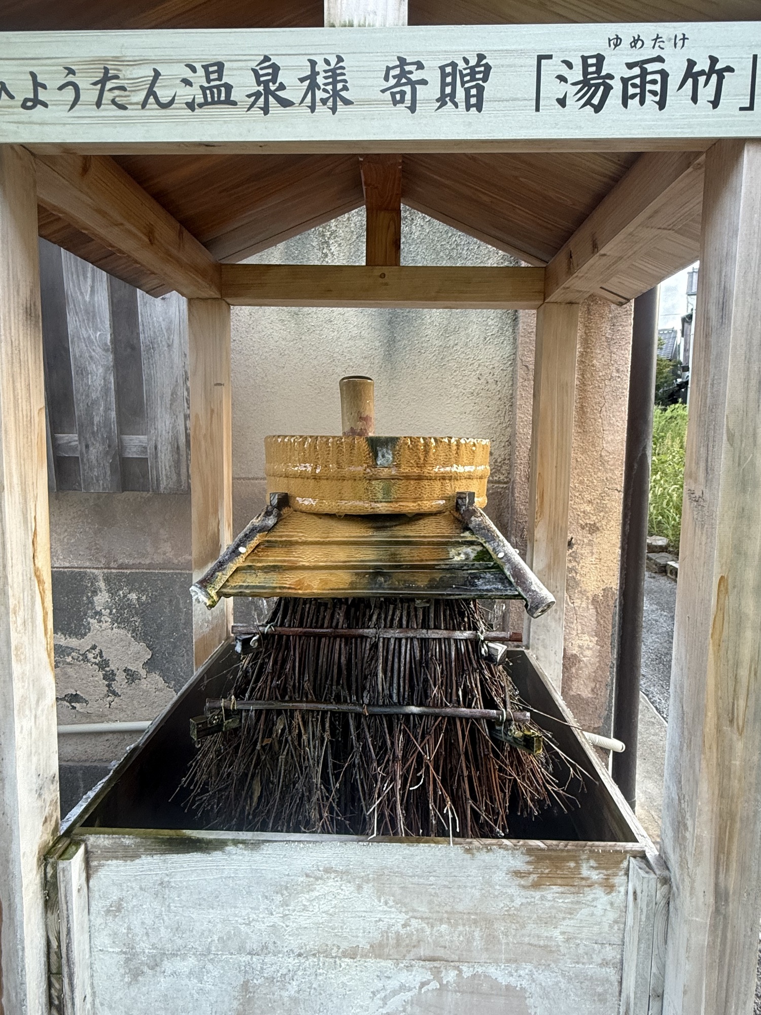 This is called a bamboo Onsen water cooler. It is a high wooden rack loaded with bamboo twigs. The hundred Celsius degree spring water flows over the twigs to cool it down to about 40 degrees Celsius. This goes straight down a pipe to the Onsen. This is the purest form of Onsen bathing as no cold water is used to cool it down. This is an important feature as locals who understand the therapeutic properties of an Onsen avoid those that use cool water if they can.