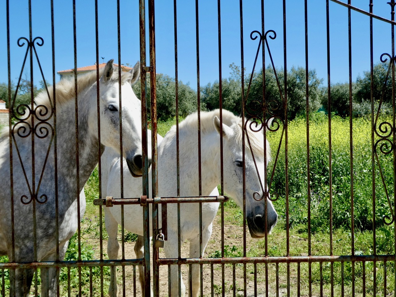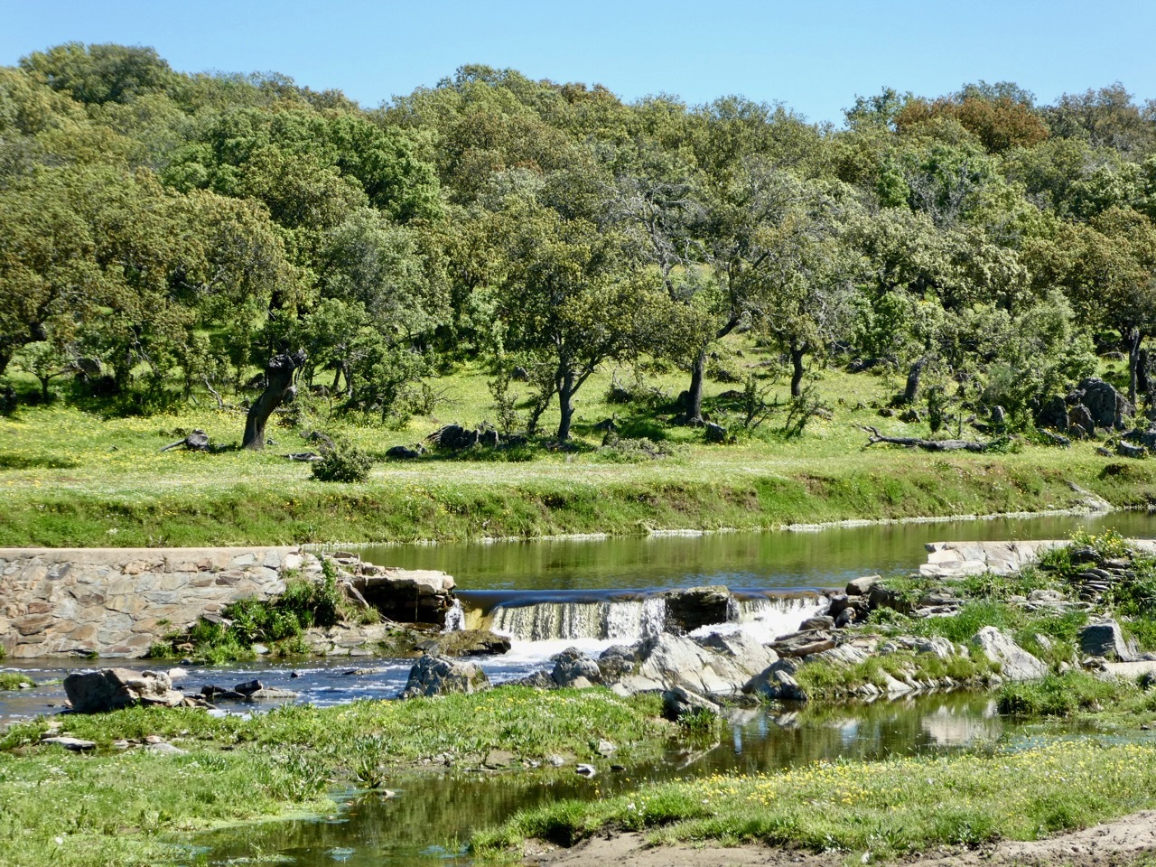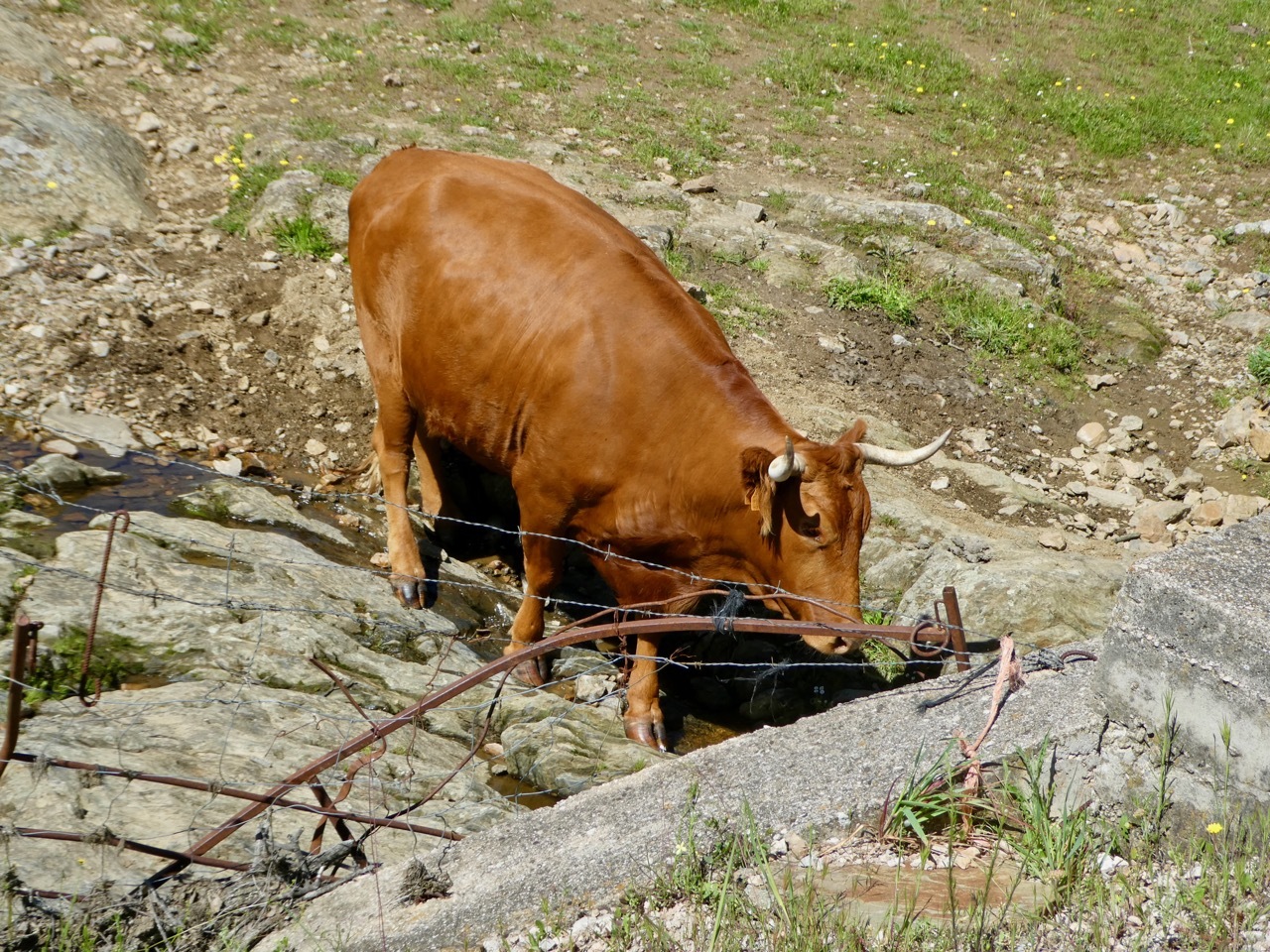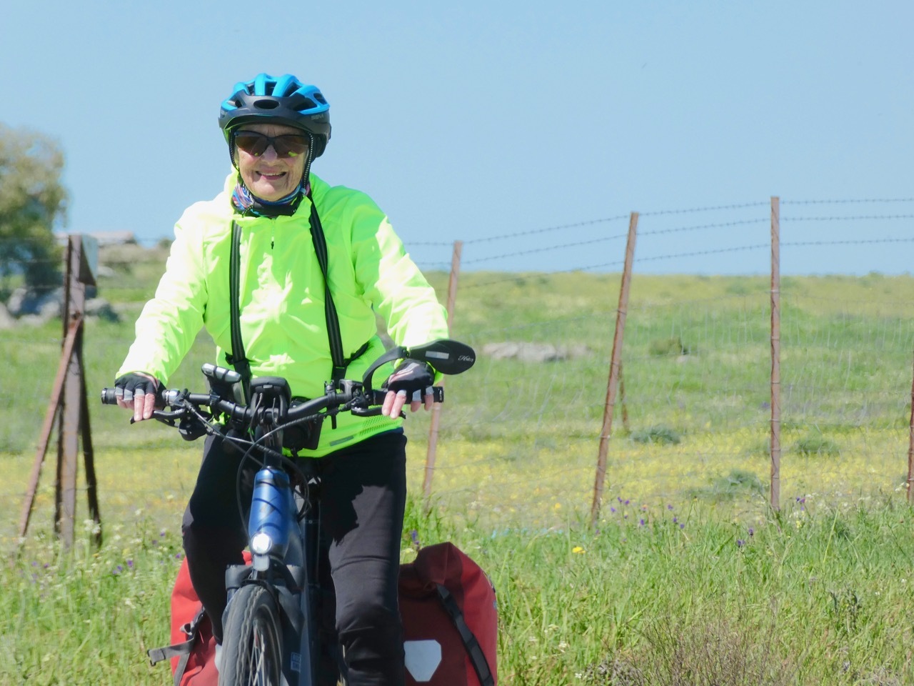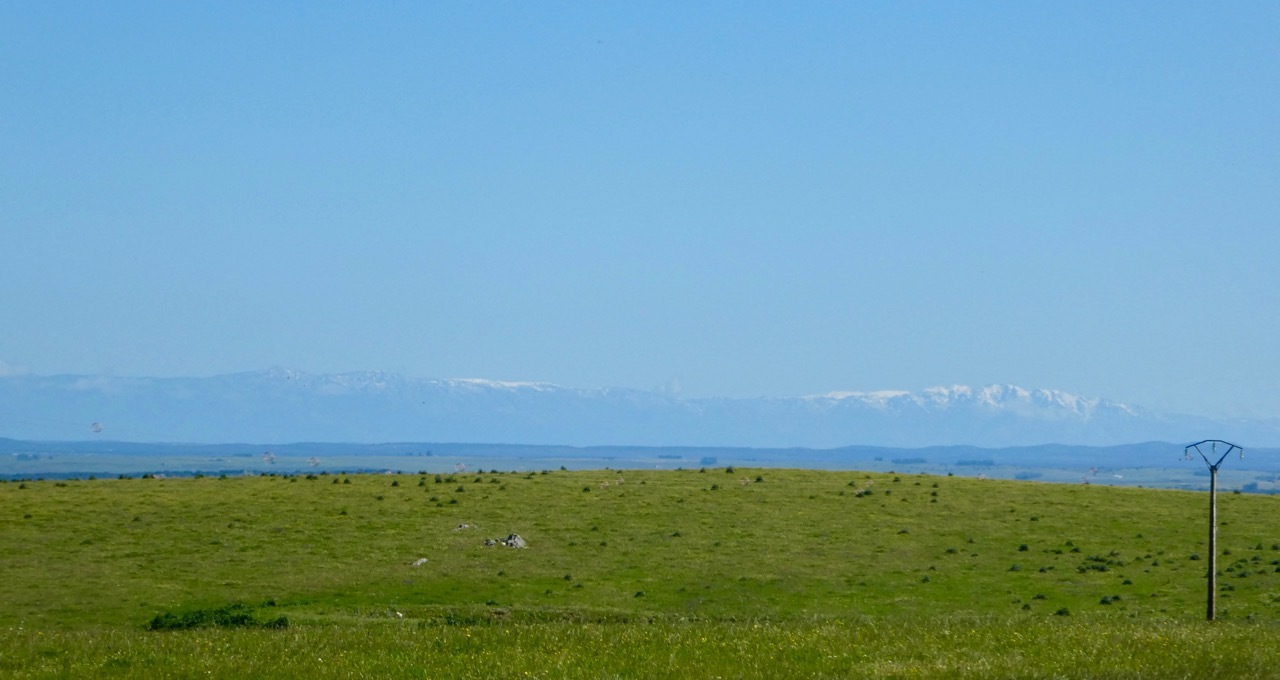 It was not long before we were reconsidering our choice. The first 14 miles were on EX206, a regional road with a modest shoulder and lots of traffic. We kept our heads down until reaching the small village of Torremocha where we stopped for a hot drink and a pastry. The next 14 miles were cycling bliss, on quiet roads that took us up and down a countryside full of wildflowers and cattle. Layers of hills and snow-capped peaks rose in the distance. It was a bit reminiscent of the Big Hole region of Montana, where vast expanses of rangeland are rimmed by the Rockies.