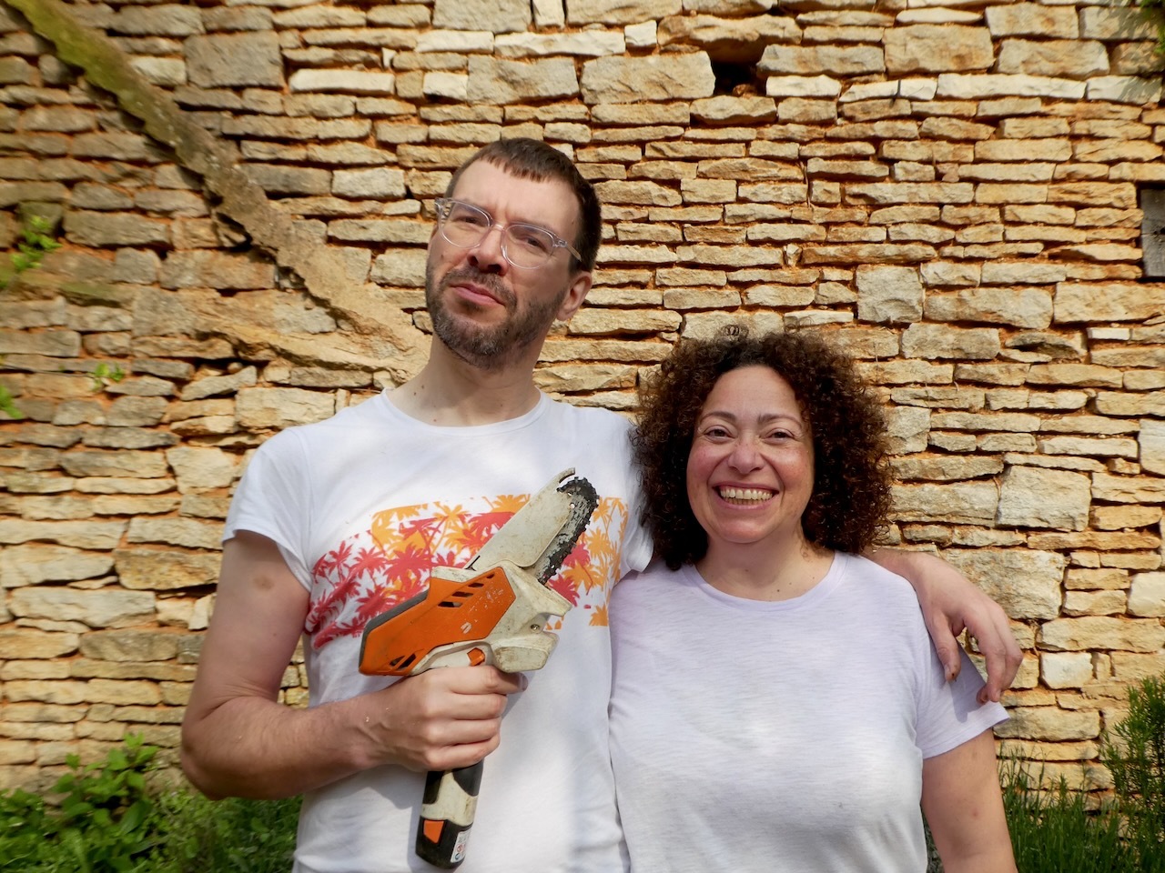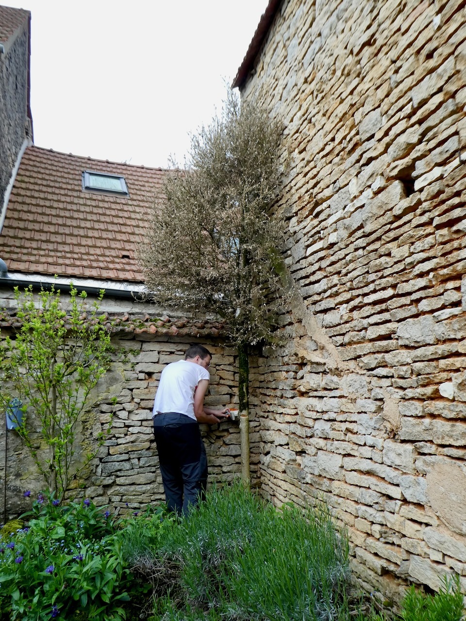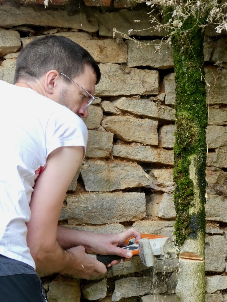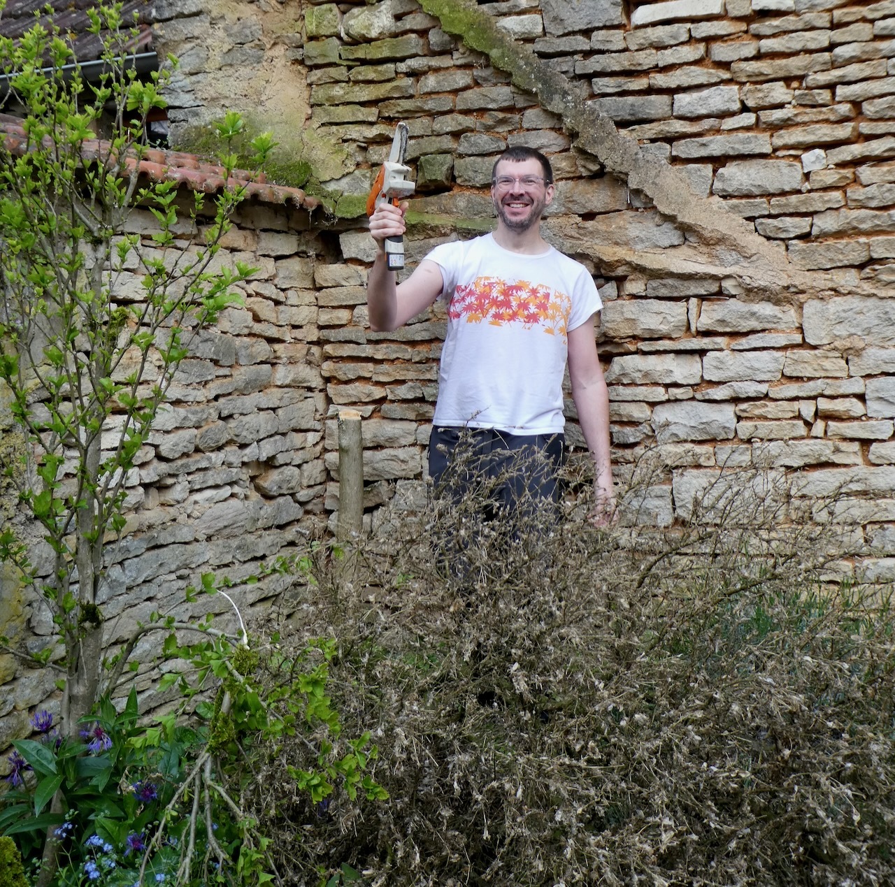 Victory day commemorates the end of World War II in Europe – it was on May 8, 1945 that Germany unconditionally surrendered to the Allied forces. It is a day celebrated throughout Europe and is a national holiday in France. Carla was off work and the big project for the day was cutting down a small diseased and dying tree. Mr. Natural always advised to get the right tool for the job, so Carla and Alex had borrowed a small battery-operated chain saw. Small being the operative word.