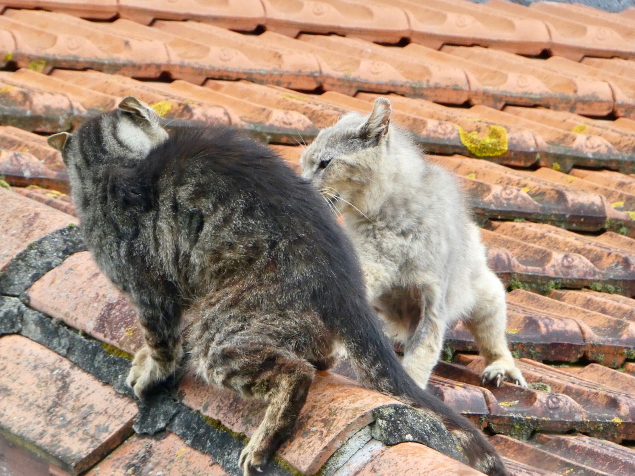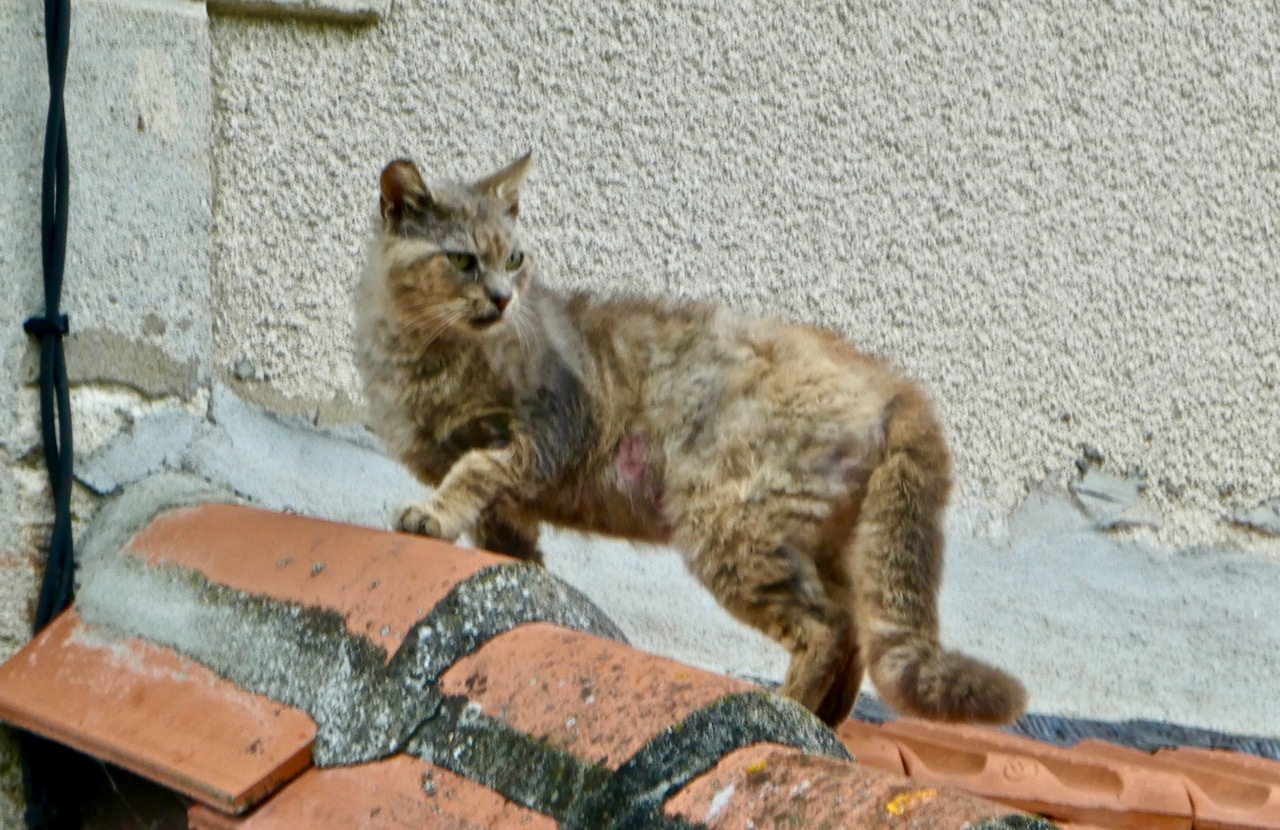 Our route left the cycle path about five miles past La Sauve and turned north toward Saint-Émilion. While stopped at the intersection, we noticed a cat cross the road and nimbly make its way along a fence and onto the roof of a small cottage. But it seemed the roof top was the domain of another cat and a real cat fight broke out - with much yeowing, hissing, clawing, flattened ears, and eventual retreat.